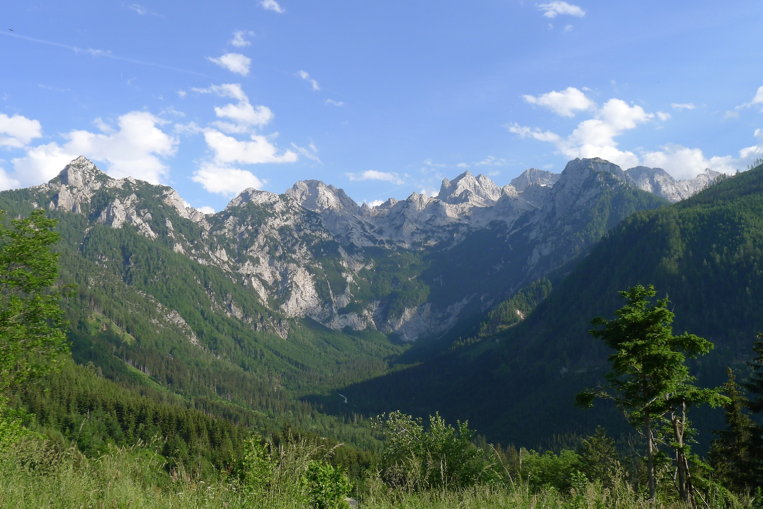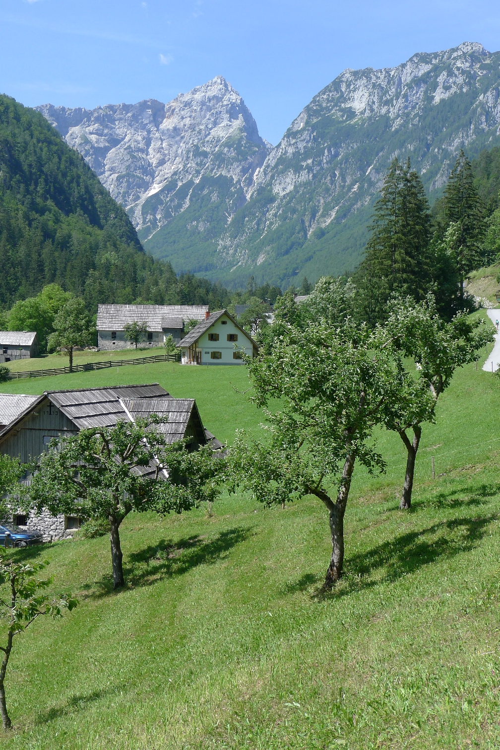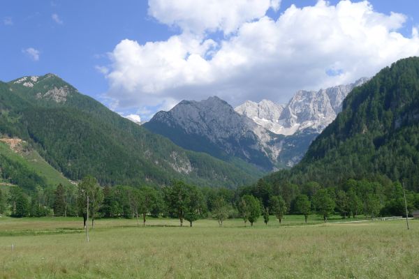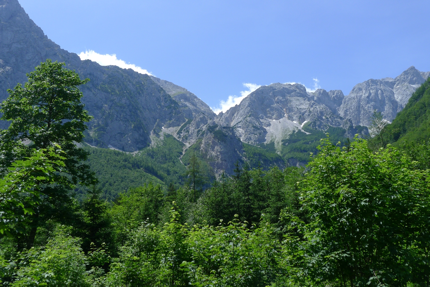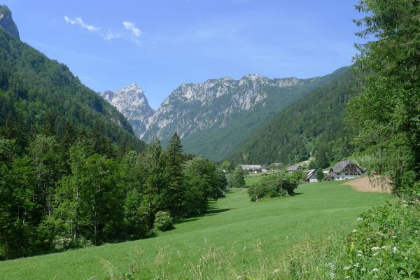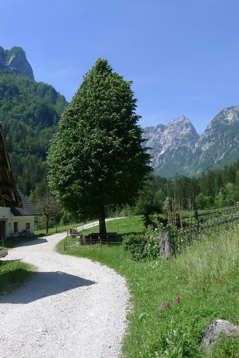 Über zwei, drei Kehren kommen wir nach in Zgornje Jezersko/Seeberg. Das enge Tal öffnet sich zu einem weiten Kessel. Von hier aus bietet sich das schönste Panaroma der bisherigen Strecke. Ein freier Blick auf die Steiner Alpen mit den Zweieinhalbtausendern Jezerska Kočna (2540m), Grintovec (2558m) und Skuta (2532m).