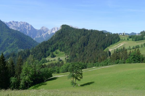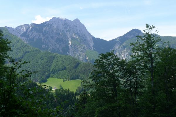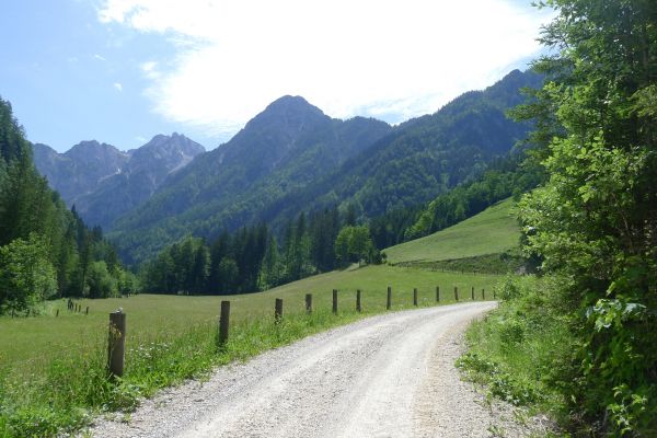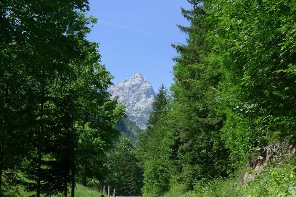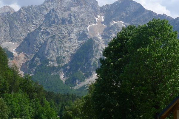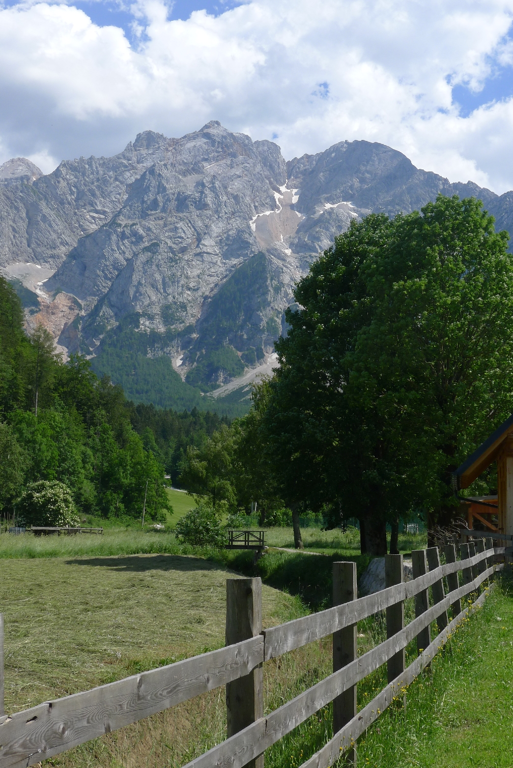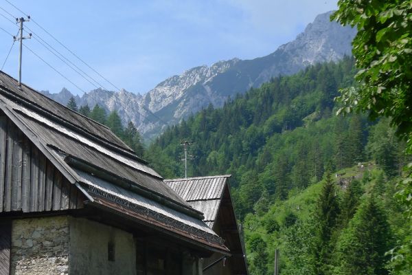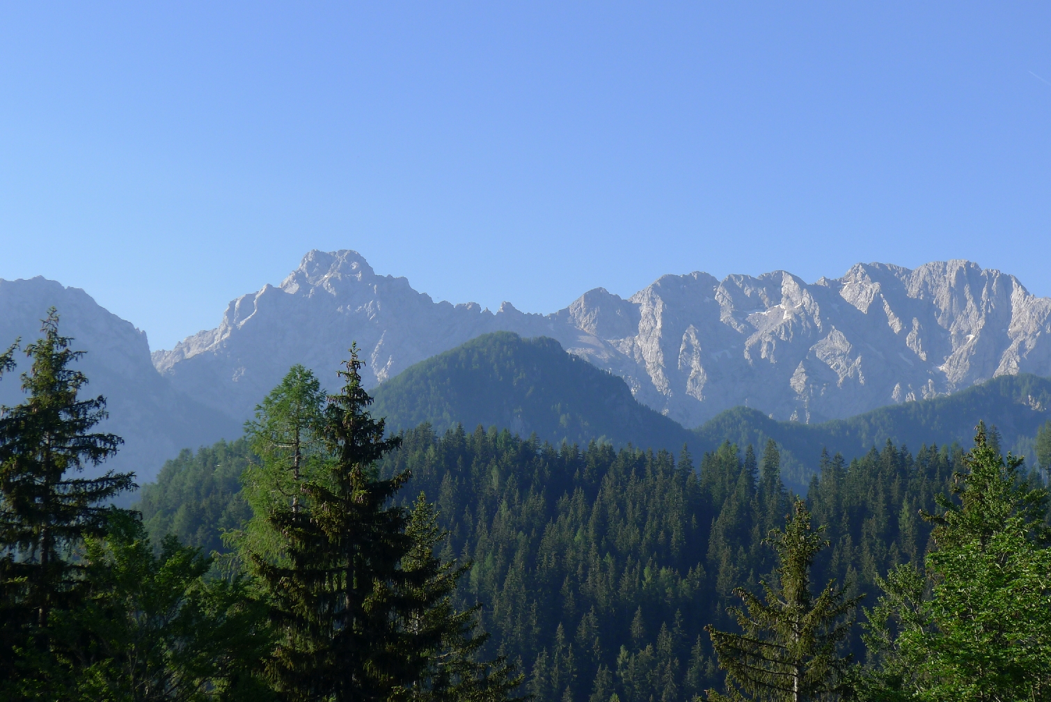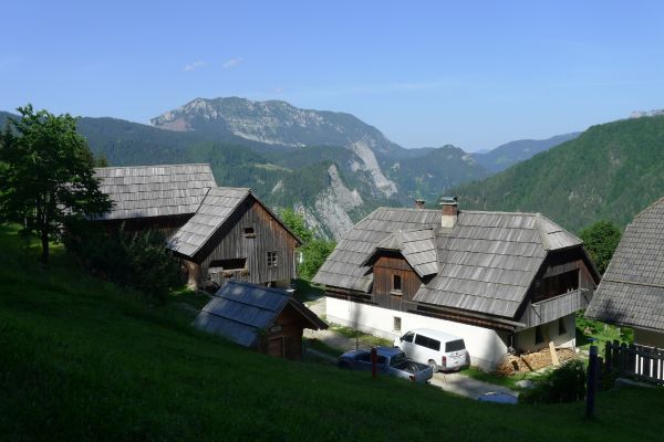 Über zwei, drei Kehren kommen wir nach in Zgornje Jezersko/Seeberg. Das enge Tal öffnet sich zu einem weiten Kessel. Von hier aus bietet sich das schönste Panaroma der bisherigen Strecke. Ein freier Blick auf die Steiner Alpen mit den Zweieinhalbtausendern Jezerska Kočna (2540m), Grintovec (2558m) und Skuta (2532m).