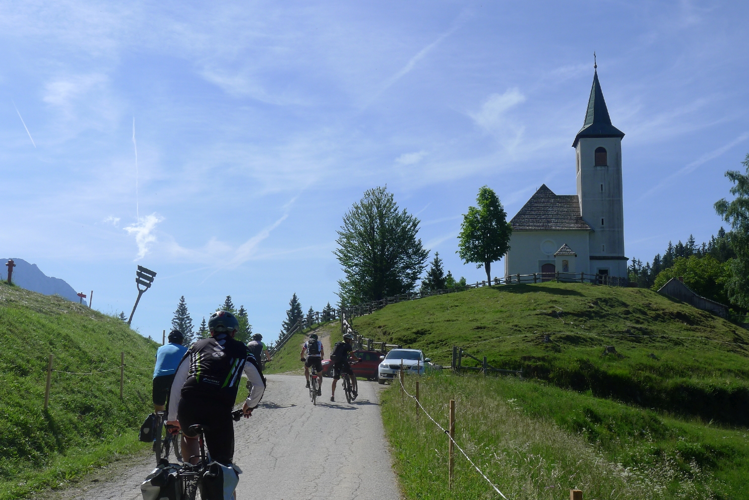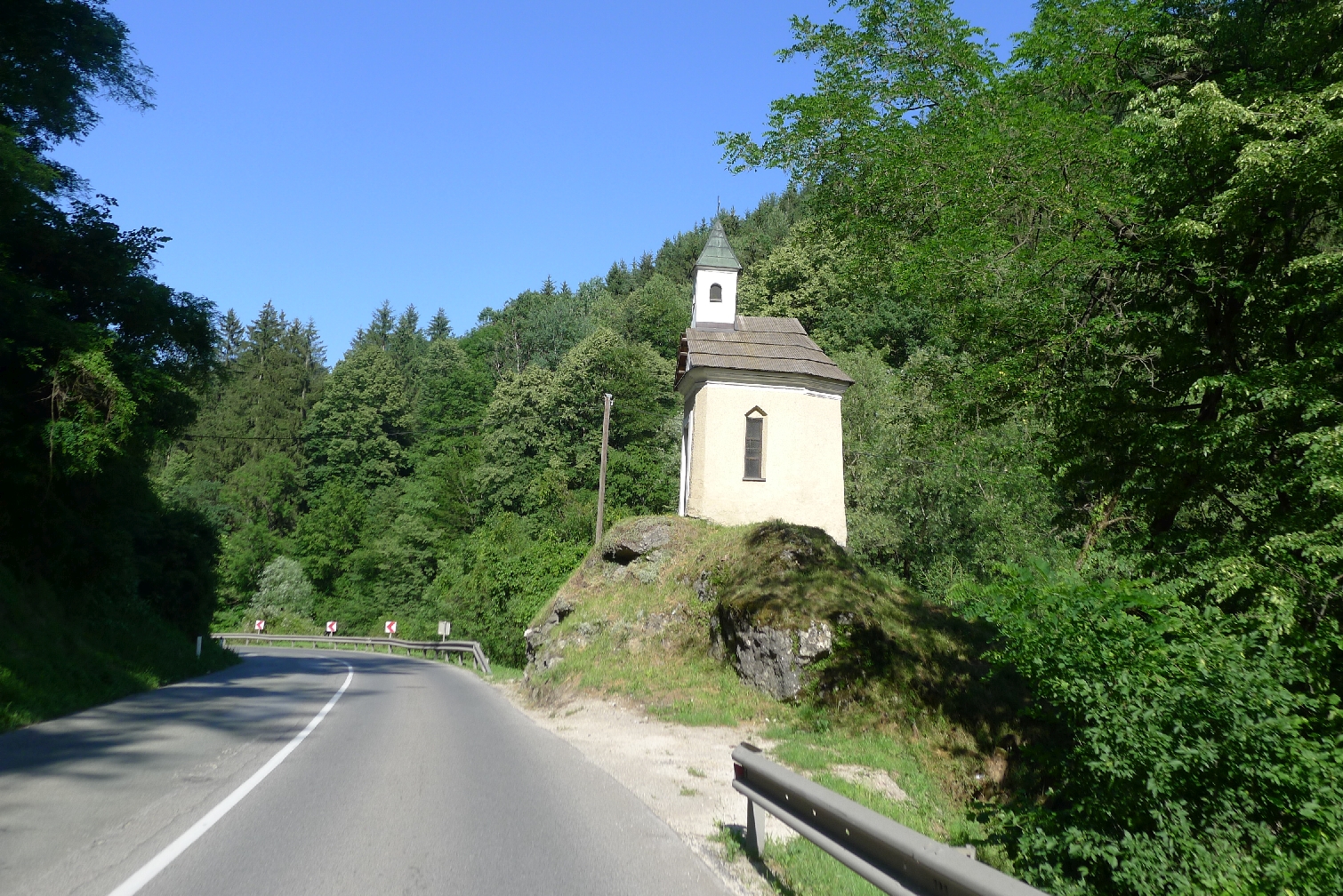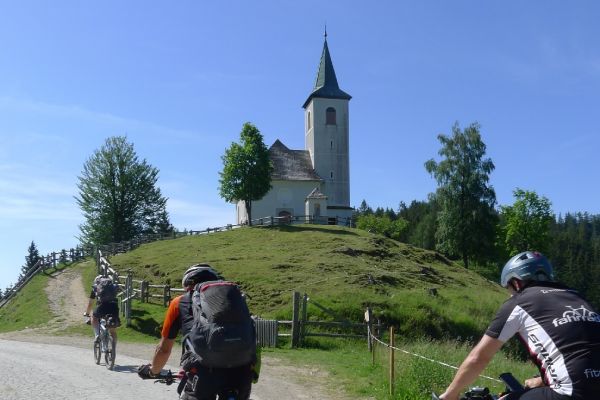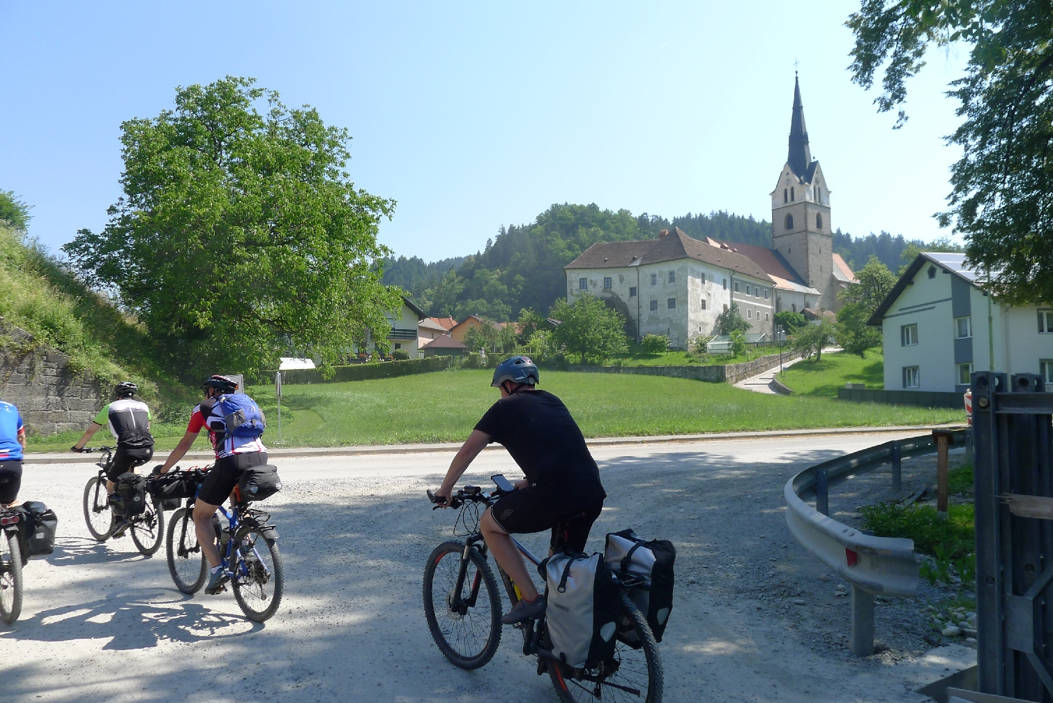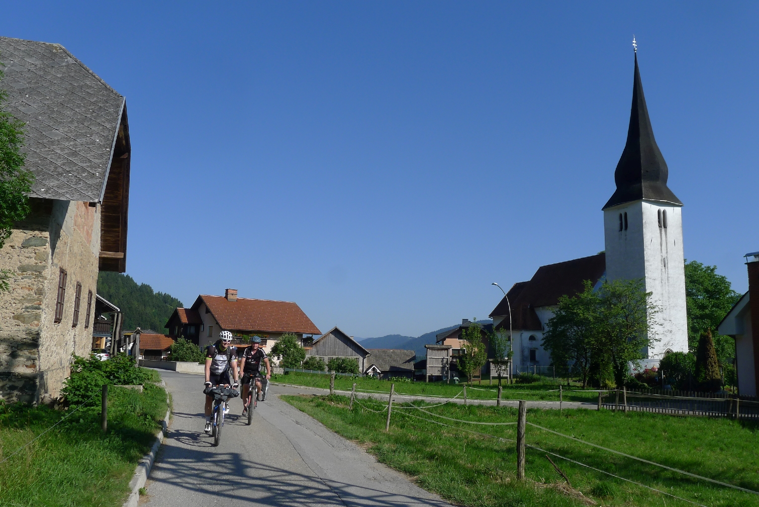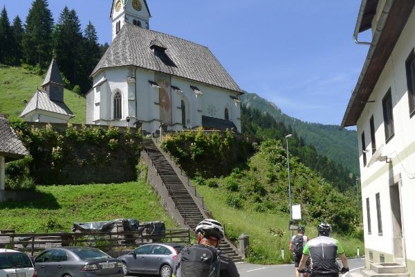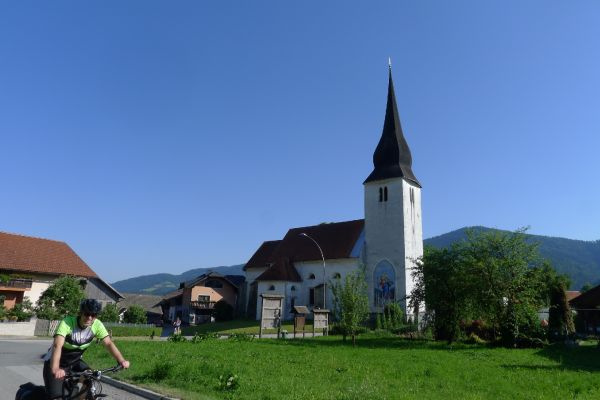 10:22 Uhr: nach einer langen Abfahrt erreichen wir den Talort Solčava/Sulzbach, wo wir uns in einem Supermarkt mit Proviant eindecken. Auf einem kleinen Hügel thront die gotische Kirche Maria Schnee (1461 erbaut).