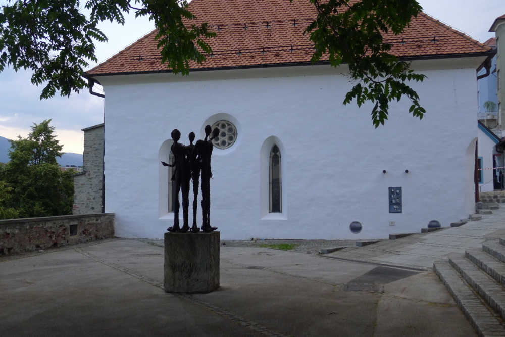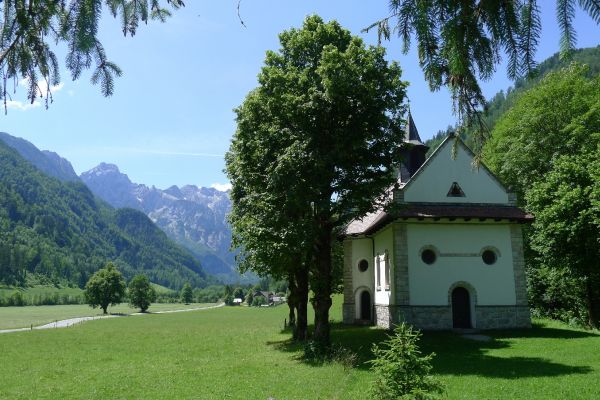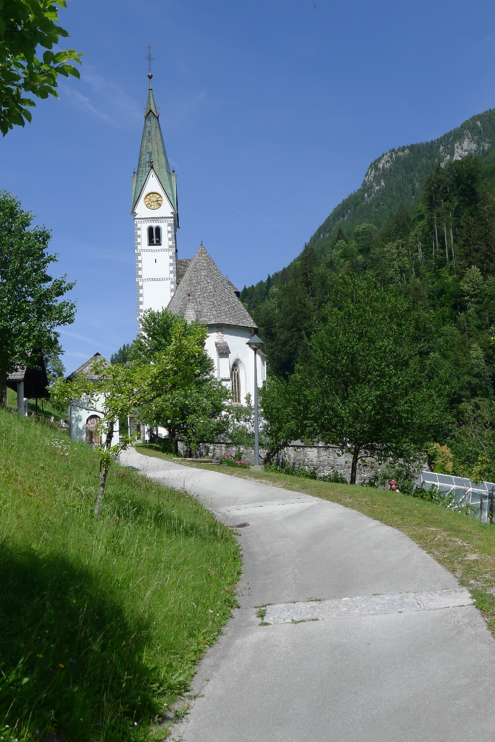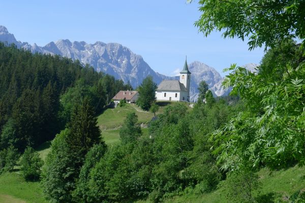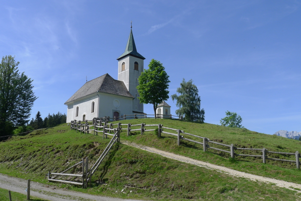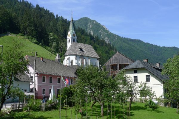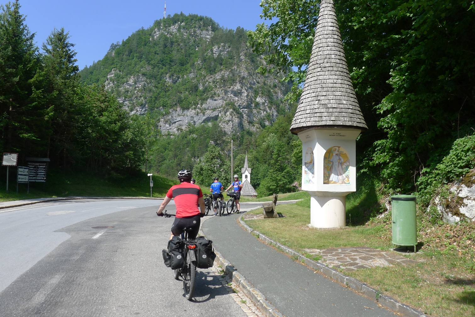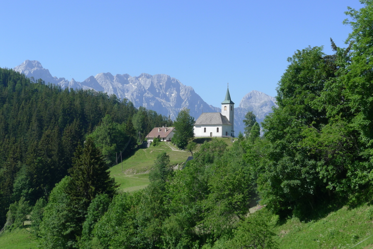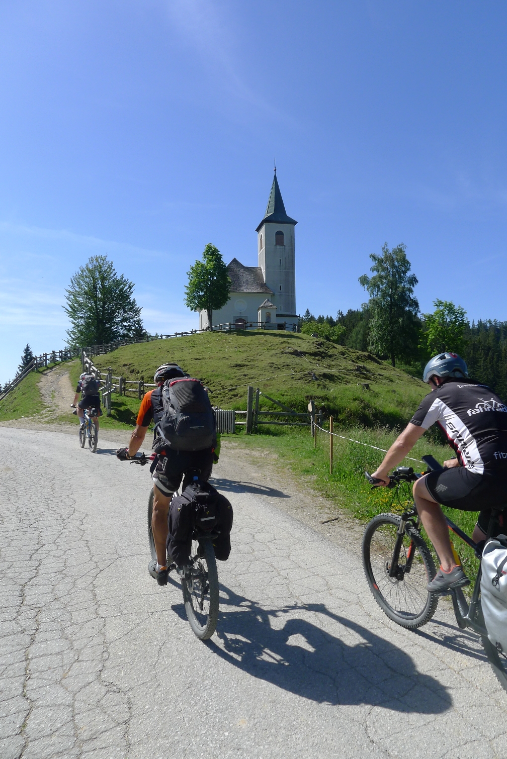 10:22 Uhr: nach einer langen Abfahrt erreichen wir den Talort Solčava/Sulzbach, wo wir uns in einem Supermarkt mit Proviant eindecken. Auf einem kleinen Hügel thront die gotische Kirche Maria Schnee (1461 erbaut).