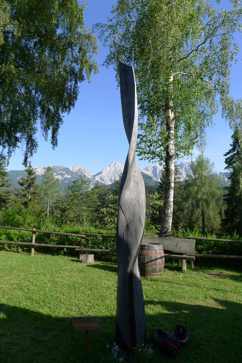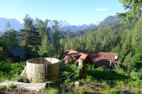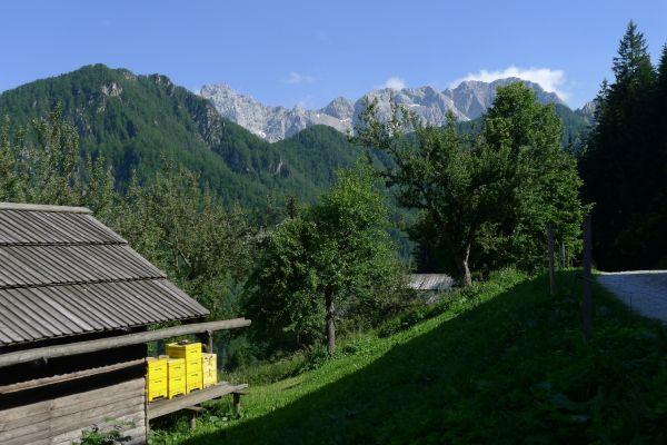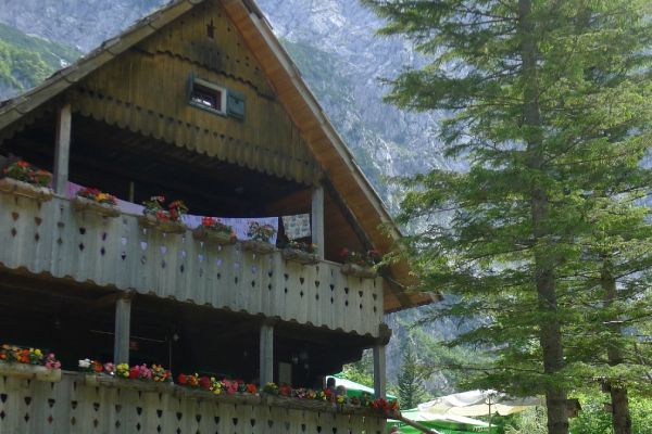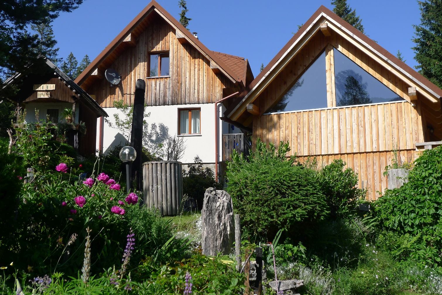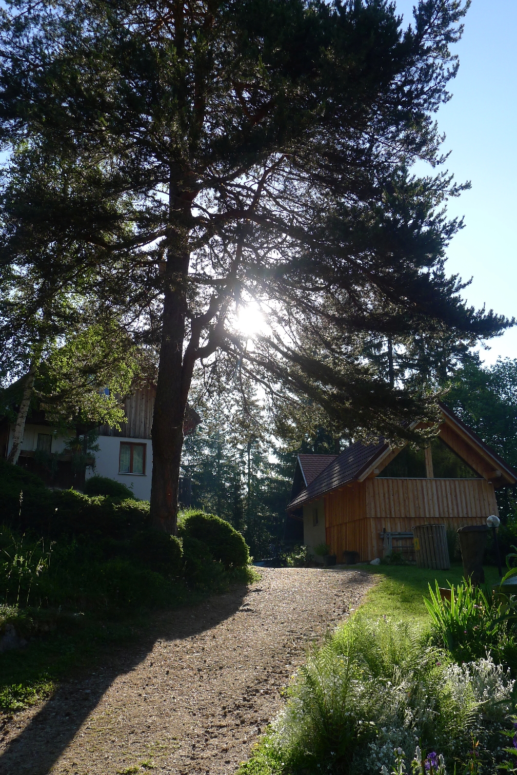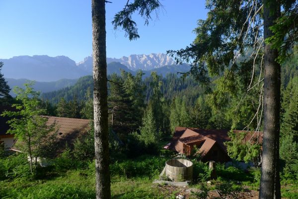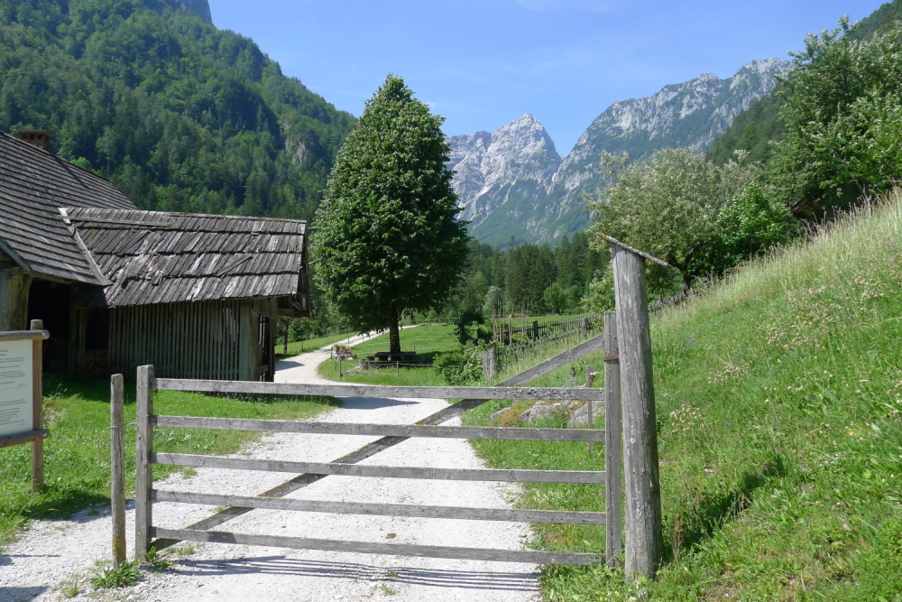 19:43 Uhr: Ankunft bei der Berghütte „Planinska Dom Majerhold“, unserer Unterkunft auf 1150m Meereshöhe. Eine traumhaft schöne Oase aus kleinen Häuschen, angelegtem Garten, selbstgestalteten Kunstobjekten und mit grandiosem Blick auf die Steiner Alpen, die sich in der untergehenden Sonne tief rot färben. Postkartenidylle pur! Wir machen uns frisch und begeben uns zum Abendessen, wo wir ein 4 Gänge Menü serviert bekommen.