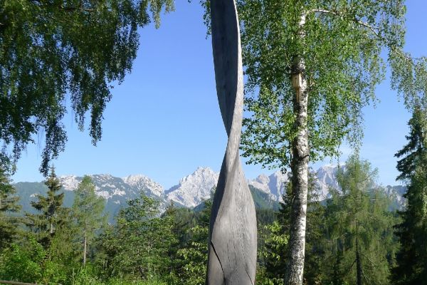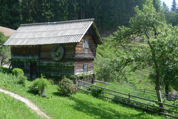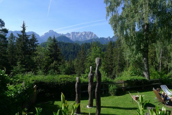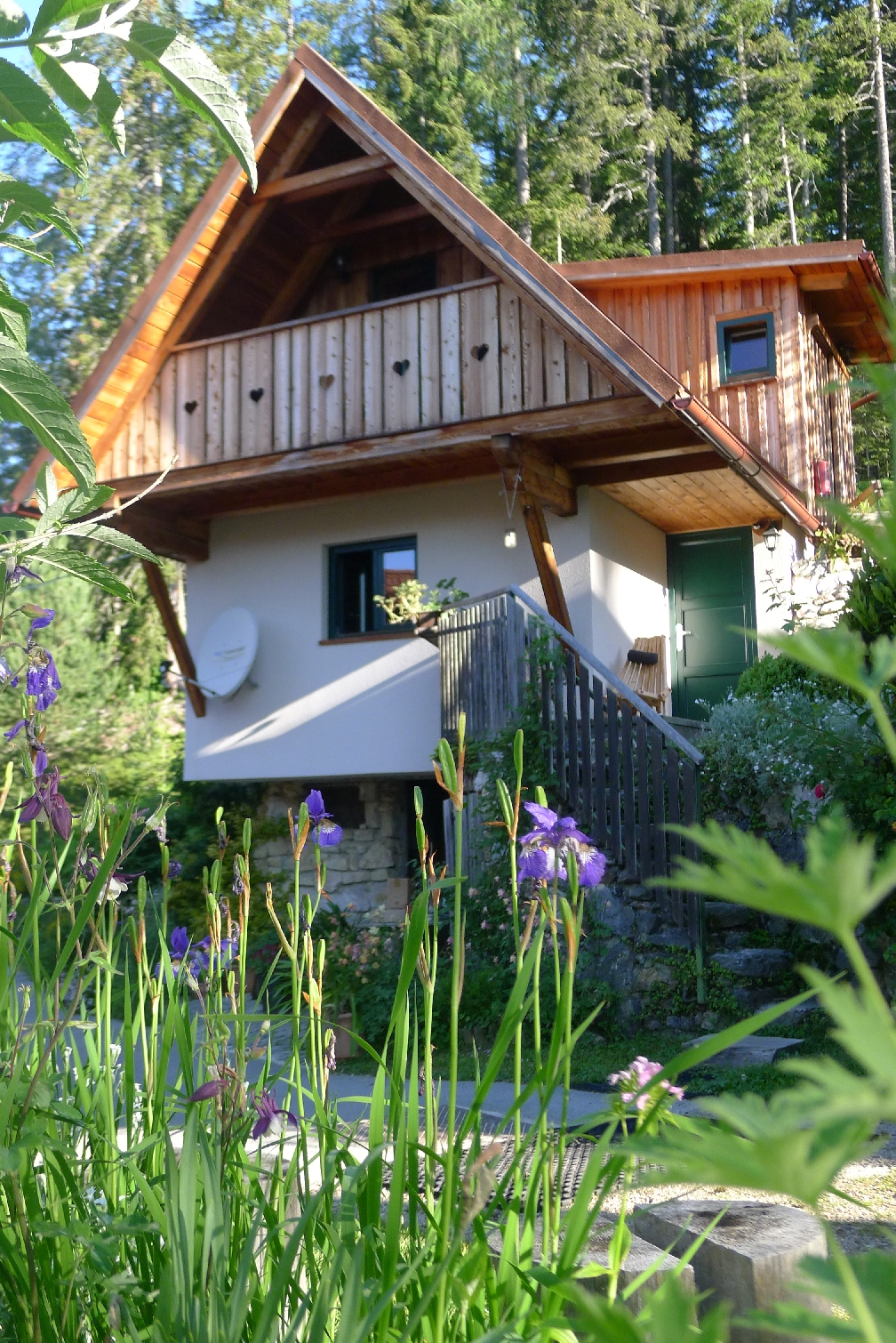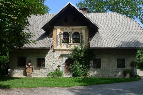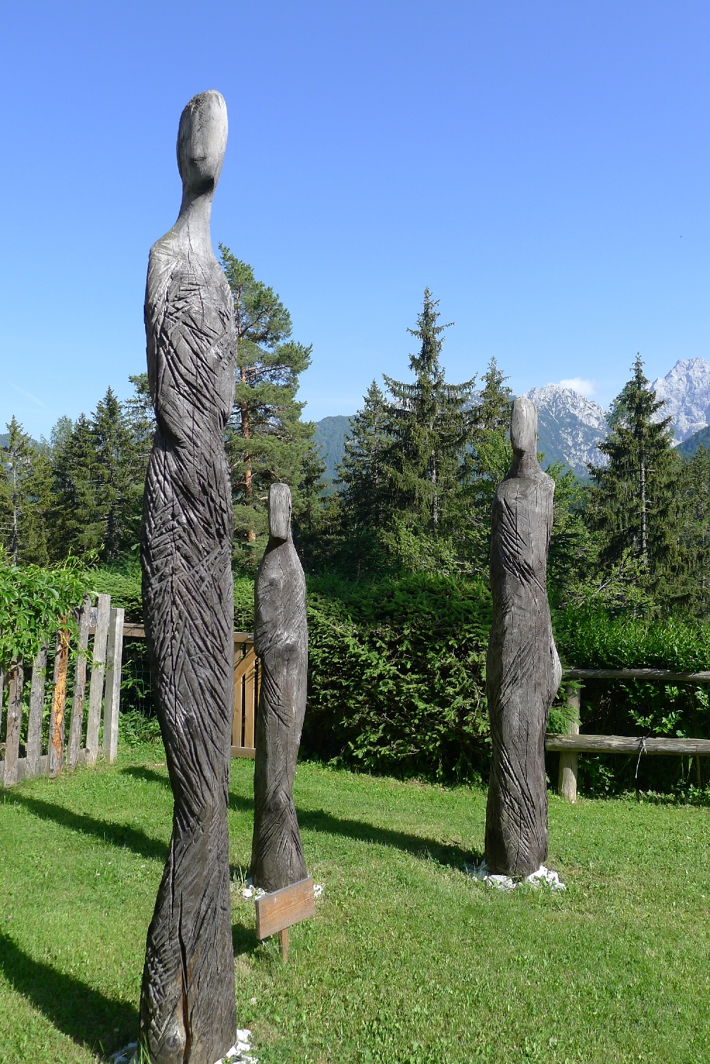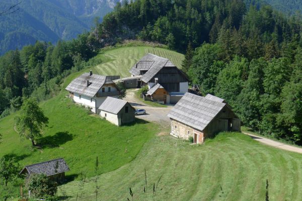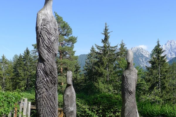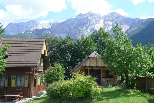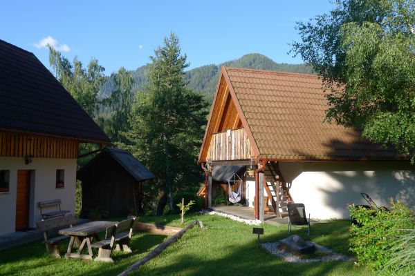 19:43 Uhr: Ankunft bei der Berghütte „Planinska Dom Majerhold“, unserer Unterkunft auf 1150m Meereshöhe. Eine traumhaft schöne Oase aus kleinen Häuschen, angelegtem Garten, selbstgestalteten Kunstobjekten und mit grandiosem Blick auf die Steiner Alpen, die sich in der untergehenden Sonne tief rot färben. Postkartenidylle pur! Wir machen uns frisch und begeben uns zum Abendessen, wo wir ein 4 Gänge Menü serviert bekommen.