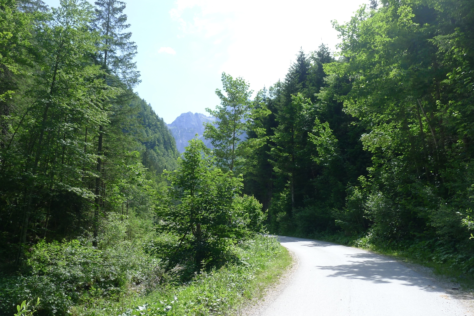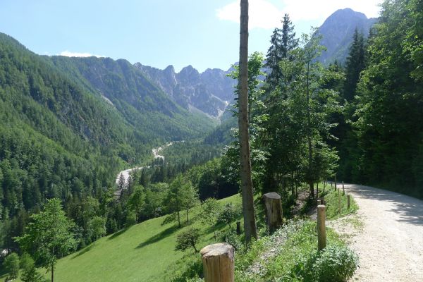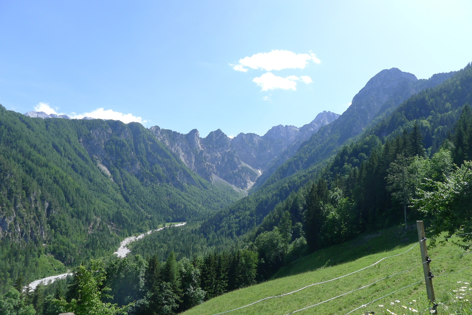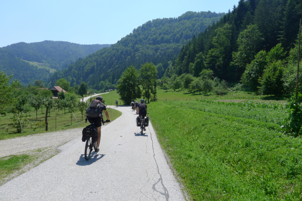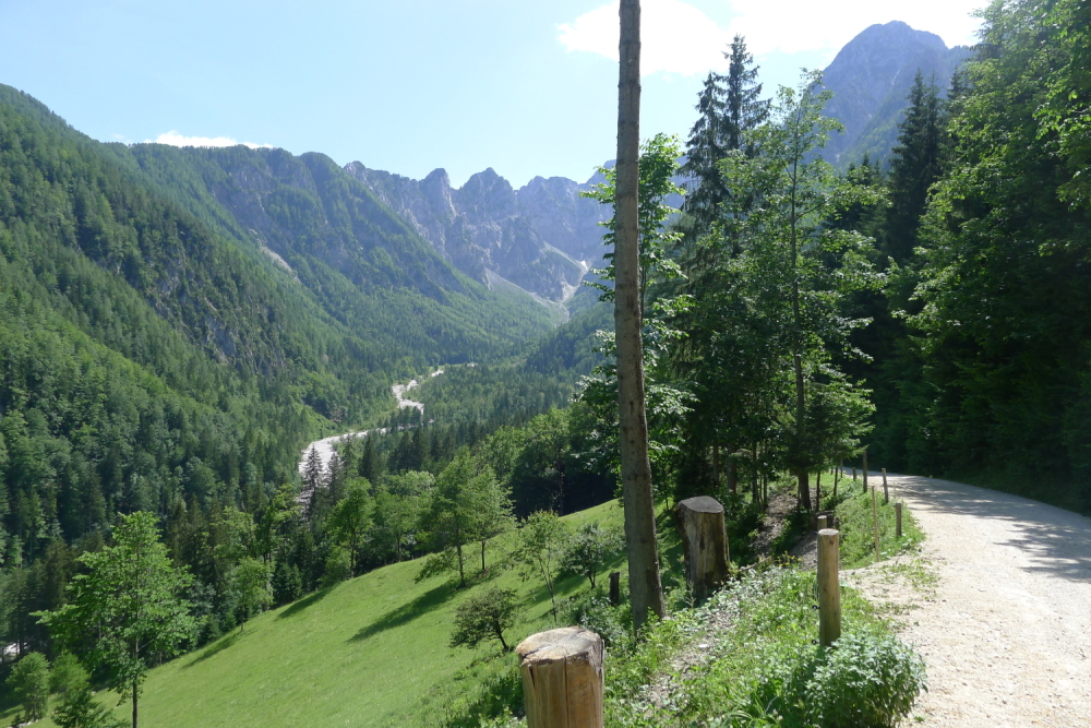 10:53 Uhr: wir fahren weiter am Fluss Savinja bergab und zweigen von der Hauptstraße ins Robanov kot Tal ab. Zunächst müssen wir ein paar Höhenmeter überwinden, ehe hinter einer Kurve der Blick ins Teil frei wird.