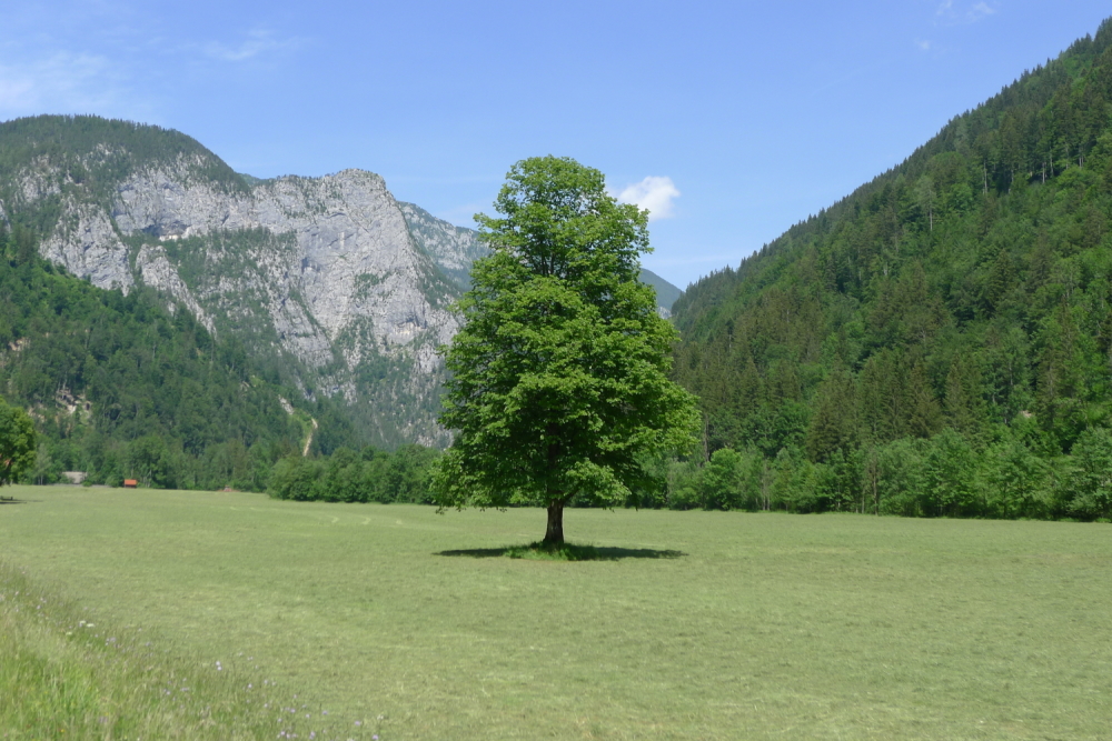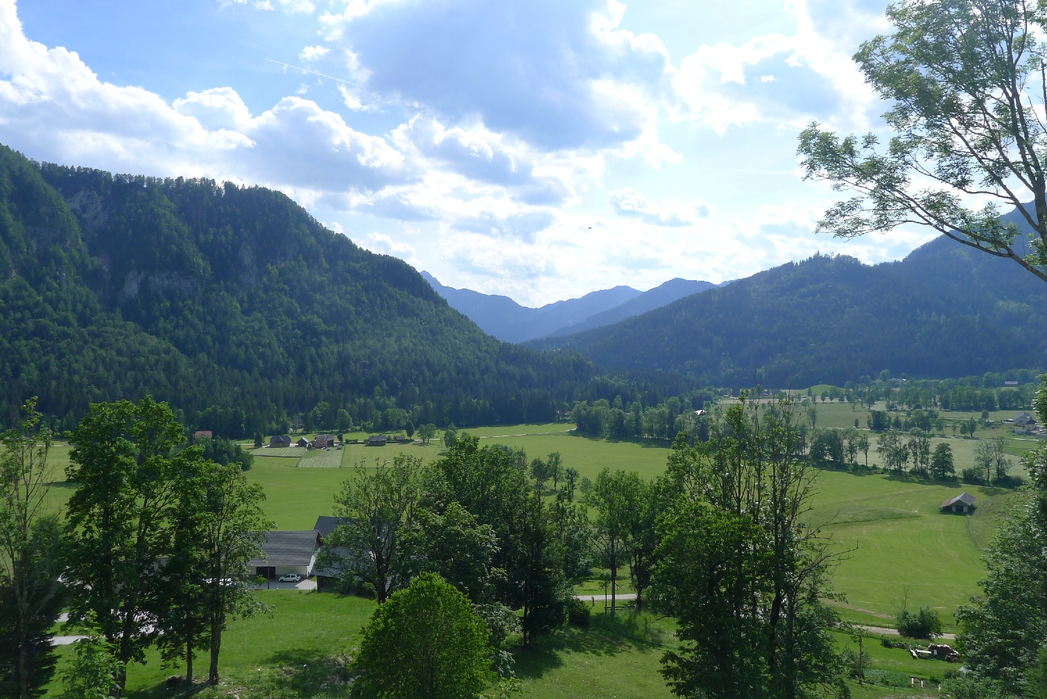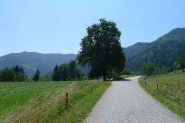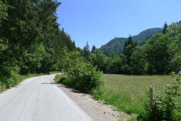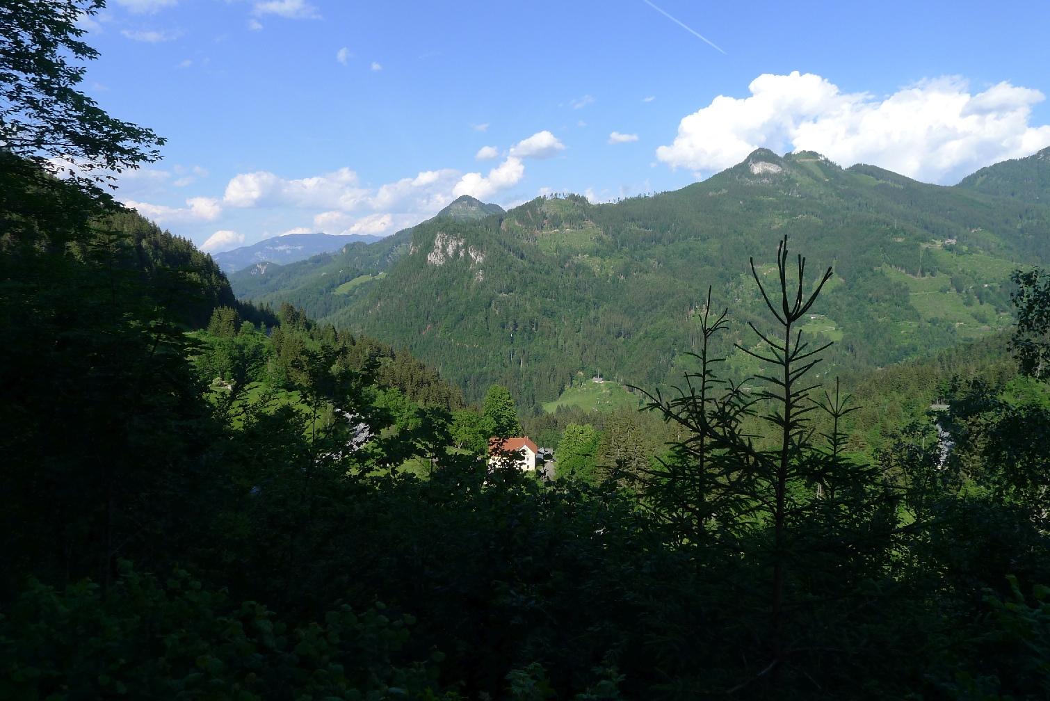 10:53 Uhr: wir fahren weiter am Fluss Savinja bergab und zweigen von der Hauptstraße ins Robanov kot Tal ab. Zunächst müssen wir ein paar Höhenmeter überwinden, ehe hinter einer Kurve der Blick ins Teil frei wird.