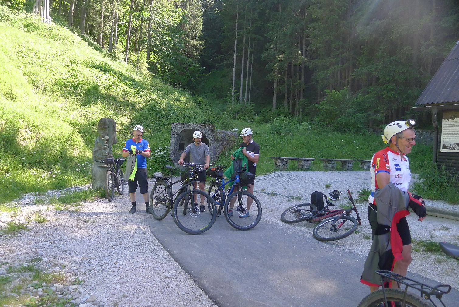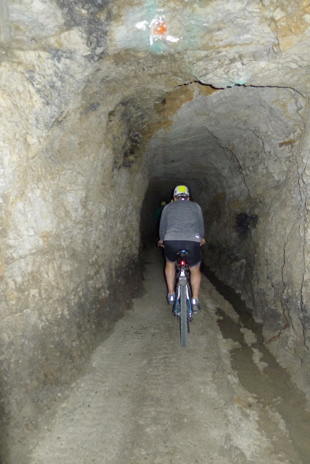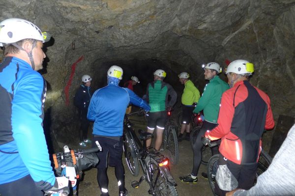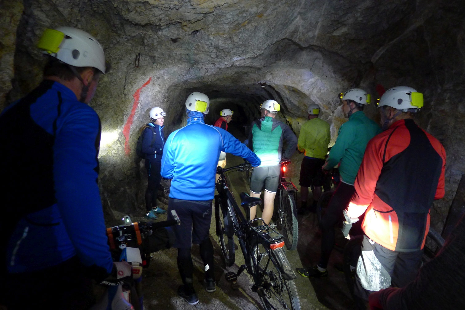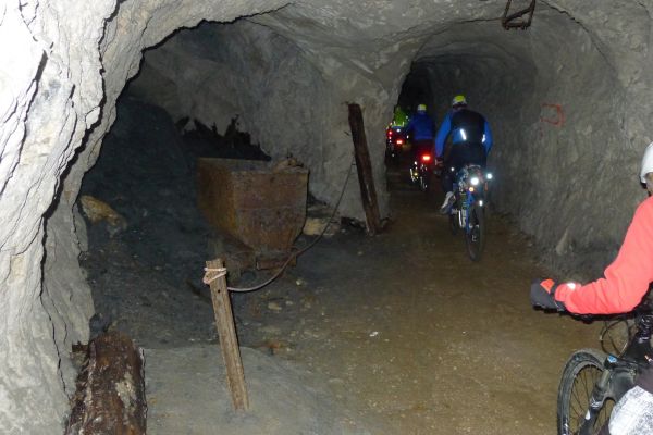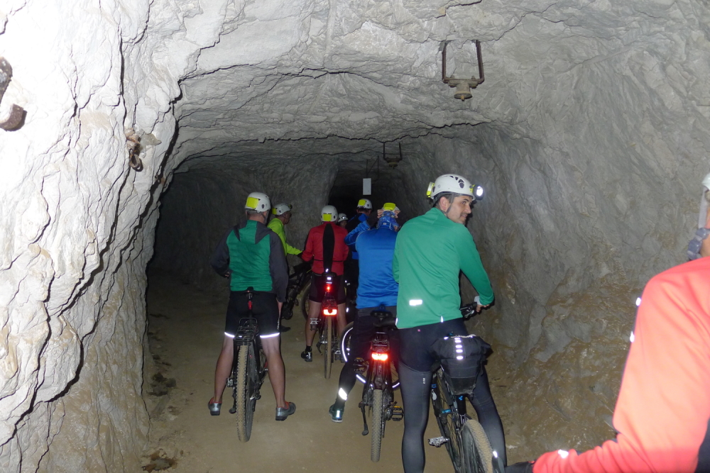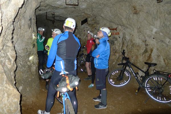 14:30 Uhr: Ankunft in Igrčevo, wir tauschen den Fahrradhelm gegen einen Berghelm mit Grubenlampe. Ein kühler Luftzug bläst uns aus dem Stolleneingang entgegen, gut dass wir Armlinge, und Softshelljacken dabei haben. Konstante 10°C sind es im Innern. Nach einem Gruppenfoto geht’s hinein in den Stollen. Die nächsten 6km fahren wir entlang der ehemaligen Förderstrecke unter dem Berg hindurch bis ans andere Ende in Breg bei Mežica. Die Strecke ist praktisch eben, der Höhenunterschied beträgt gerade mal 15m, aber der Untergrund ist alles andere als einfach: Schotter, Löcher und Unebenheiten von den ehemaligen Eisenbahnschwellen. Dazu nur das schwache Licht der Stirnlampe. An manchen Stellen wird es auch ganz schön eng. Wir müssen öfters den Kopf einziehen oder aufpassen nicht an Relikten aus dem Bergbaubetrieb hängen zu bleiben. Unser Guide Anna führt uns sicher durch das weit verzweigte Stollensystem und gibt Einblicke in die Zeit, als hier Blei und Zink abgebaut wurde.
