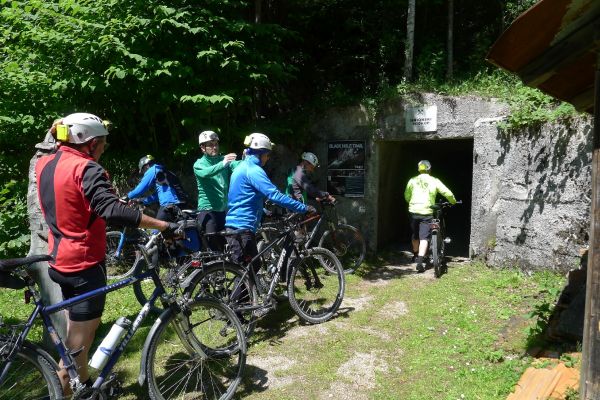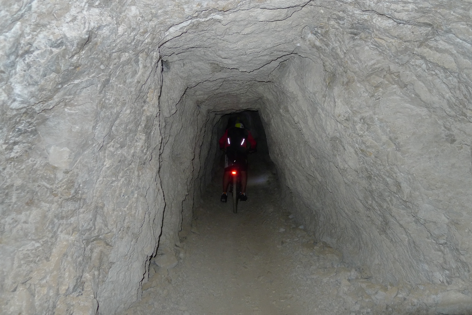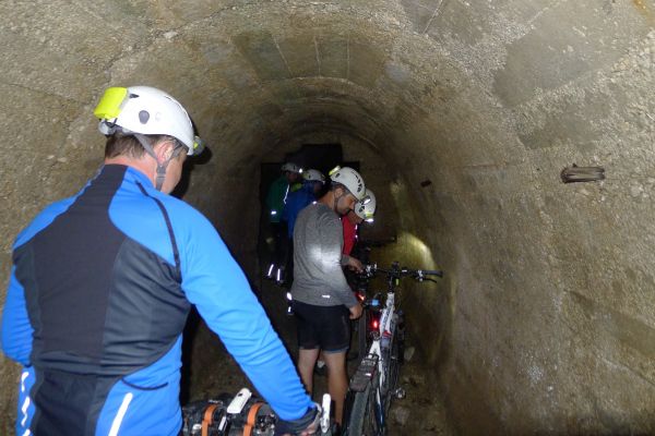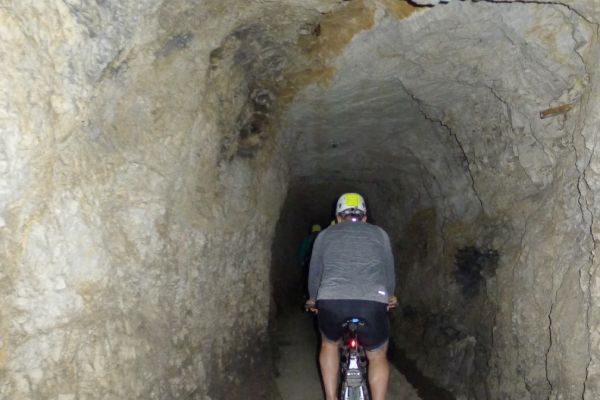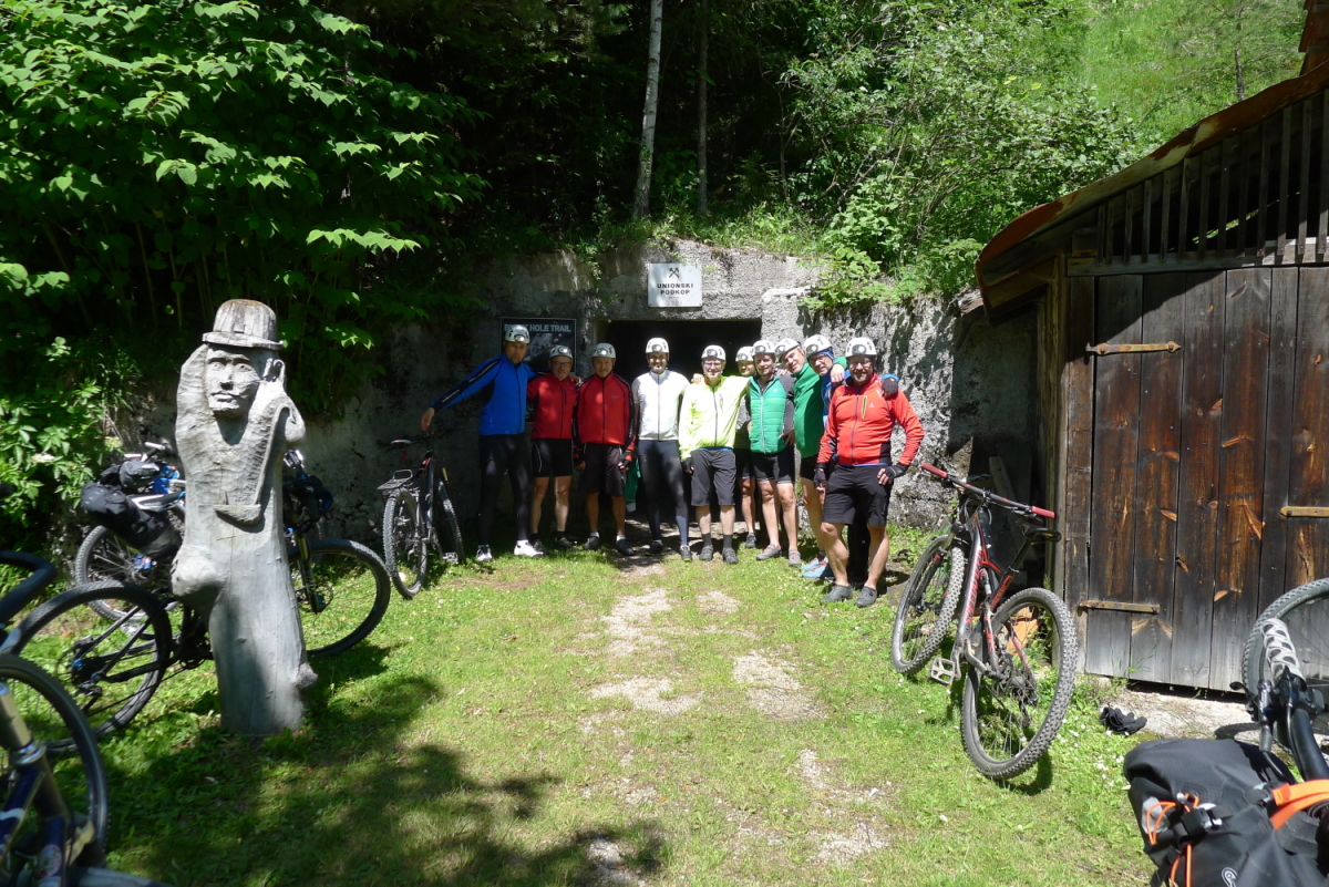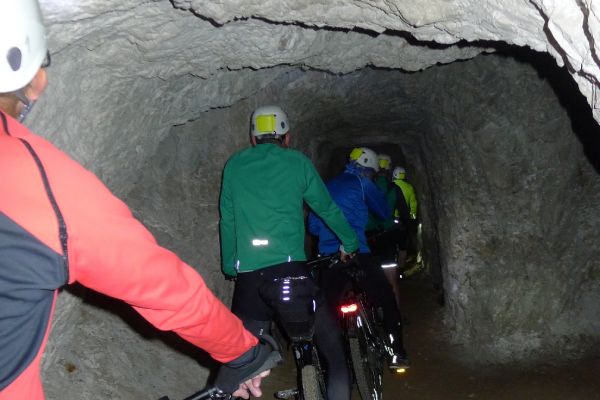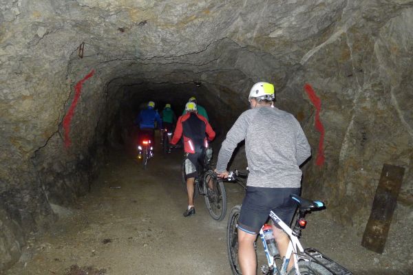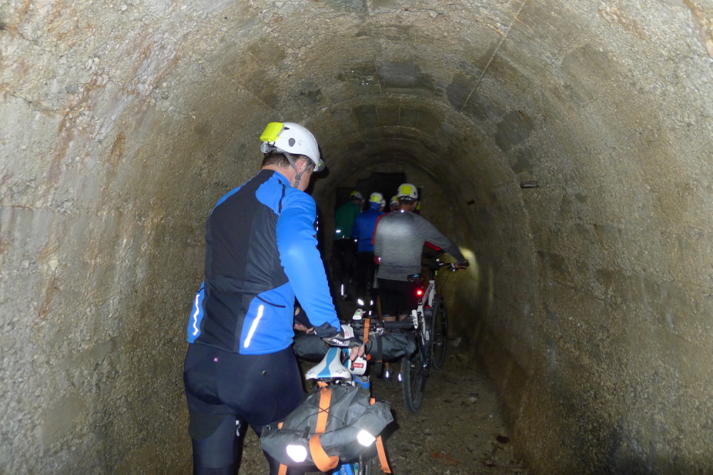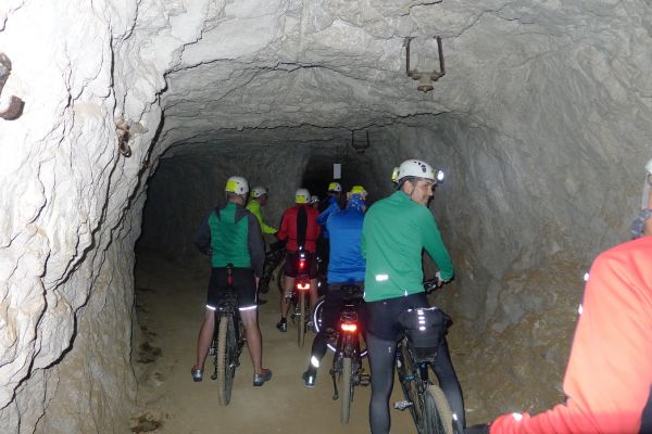 14:30 Uhr: Ankunft in Igrčevo, wir tauschen den Fahrradhelm gegen einen Berghelm mit Grubenlampe. Ein kühler Luftzug bläst uns aus dem Stolleneingang entgegen, gut dass wir Armlinge, und Softshelljacken dabei haben. Konstante 10°C sind es im Innern. Nach einem Gruppenfoto geht’s hinein in den Stollen. Die nächsten 6km fahren wir entlang der ehemaligen Förderstrecke unter dem Berg hindurch bis ans andere Ende in Breg bei Mežica. Die Strecke ist praktisch eben, der Höhenunterschied beträgt gerade mal 15m, aber der Untergrund ist alles andere als einfach: Schotter, Löcher und Unebenheiten von den ehemaligen Eisenbahnschwellen. Dazu nur das schwache Licht der Stirnlampe. An manchen Stellen wird es auch ganz schön eng. Wir müssen öfters den Kopf einziehen oder aufpassen nicht an Relikten aus dem Bergbaubetrieb hängen zu bleiben. Unser Guide Anna führt uns sicher durch das weit verzweigte Stollensystem und gibt Einblicke in die Zeit, als hier Blei und Zink abgebaut wurde.