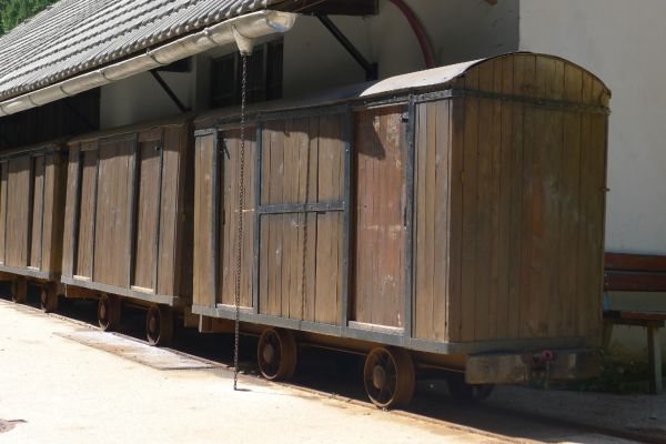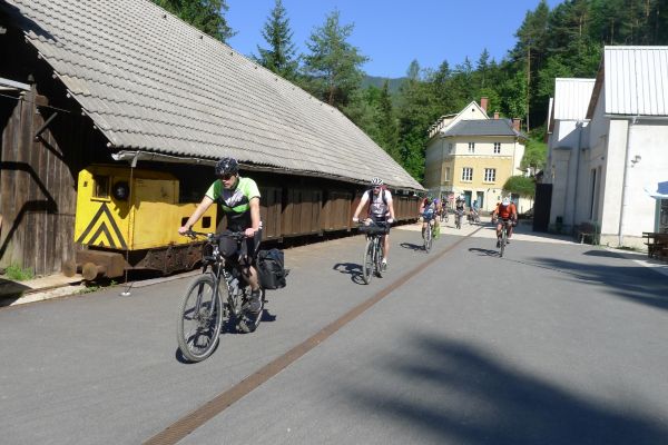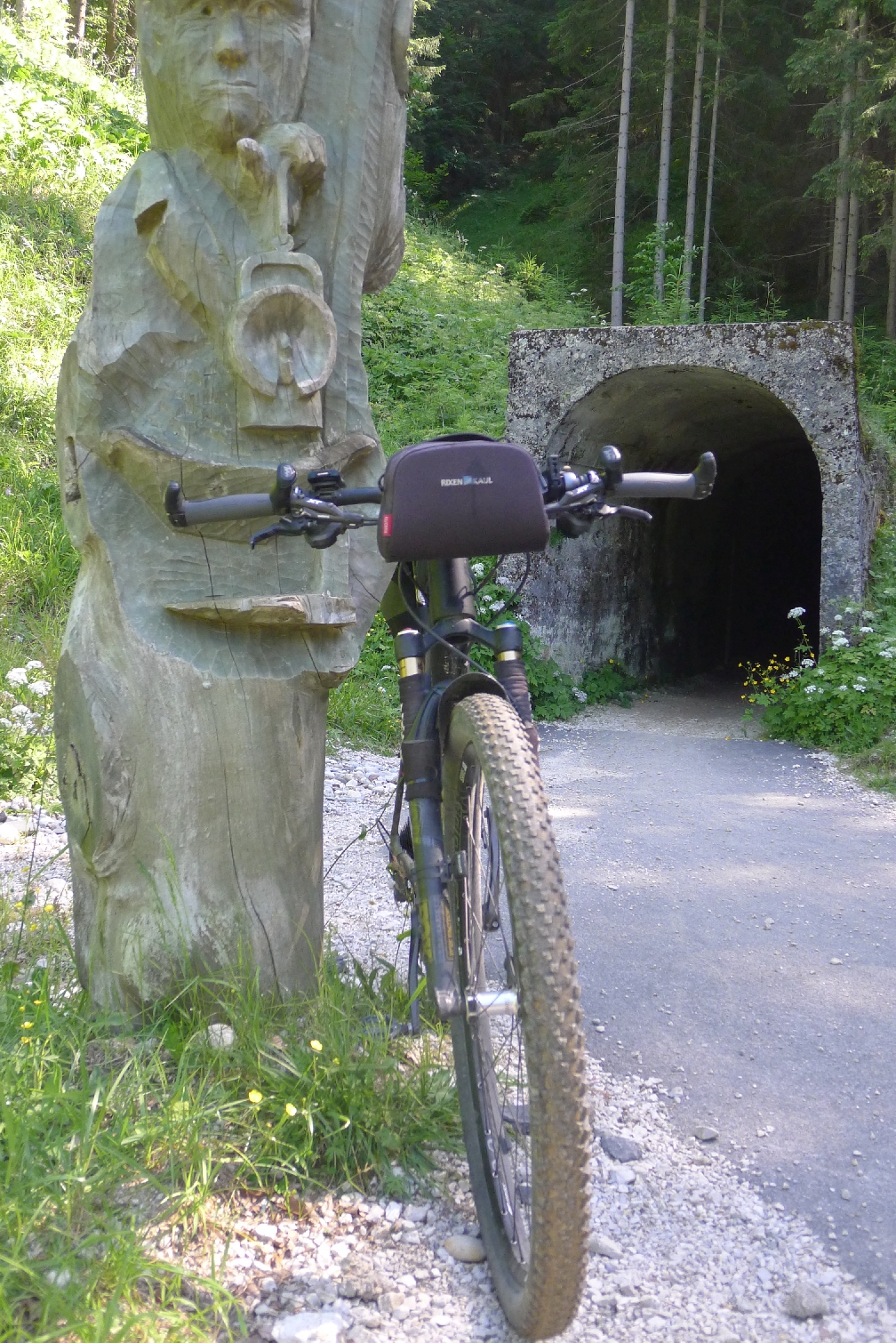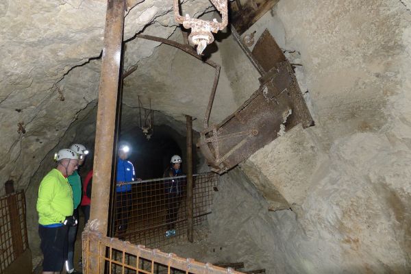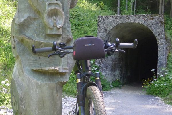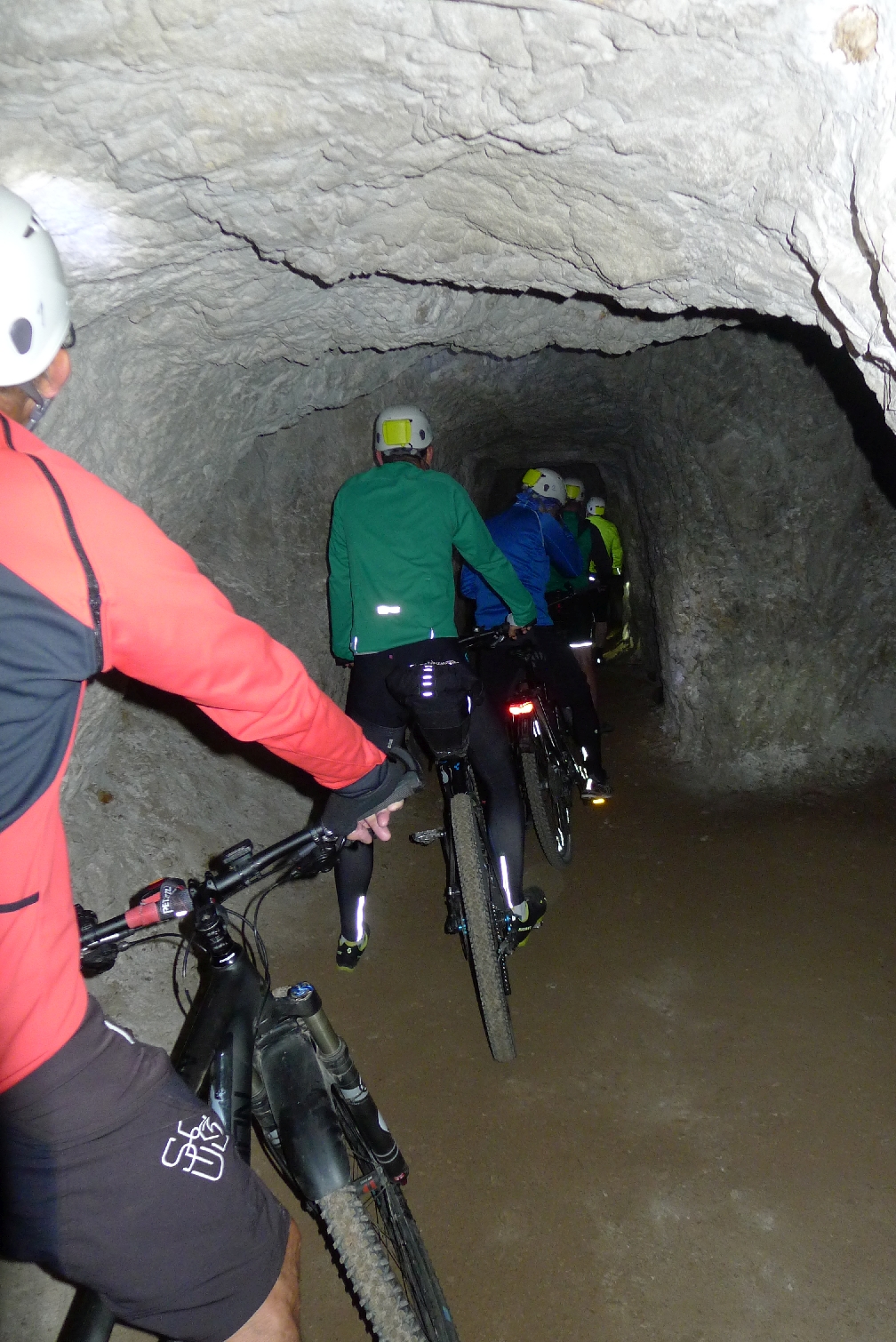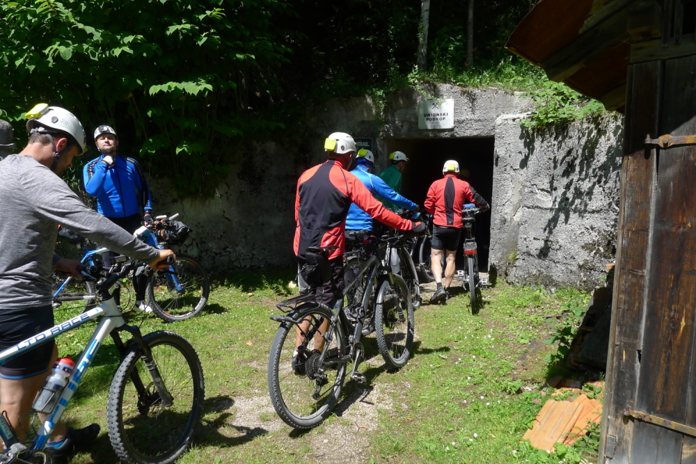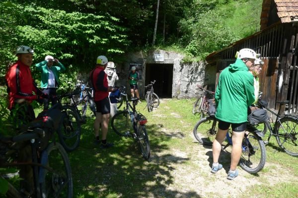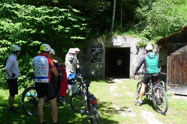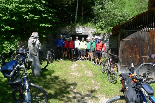 14:30 Uhr: Ankunft in Igrčevo, wir tauschen den Fahrradhelm gegen einen Berghelm mit Grubenlampe. Ein kühler Luftzug bläst uns aus dem Stolleneingang entgegen, gut dass wir Armlinge, und Softshelljacken dabei haben. Konstante 10°C sind es im Innern. Nach einem Gruppenfoto geht’s hinein in den Stollen. Die nächsten 6km fahren wir entlang der ehemaligen Förderstrecke unter dem Berg hindurch bis ans andere Ende in Breg bei Mežica. Die Strecke ist praktisch eben, der Höhenunterschied beträgt gerade mal 15m, aber der Untergrund ist alles andere als einfach: Schotter, Löcher und Unebenheiten von den ehemaligen Eisenbahnschwellen. Dazu nur das schwache Licht der Stirnlampe. An manchen Stellen wird es auch ganz schön eng. Wir müssen öfters den Kopf einziehen oder aufpassen nicht an Relikten aus dem Bergbaubetrieb hängen zu bleiben. Unser Guide Anna führt uns sicher durch das weit verzweigte Stollensystem und gibt Einblicke in die Zeit, als hier Blei und Zink abgebaut wurde.