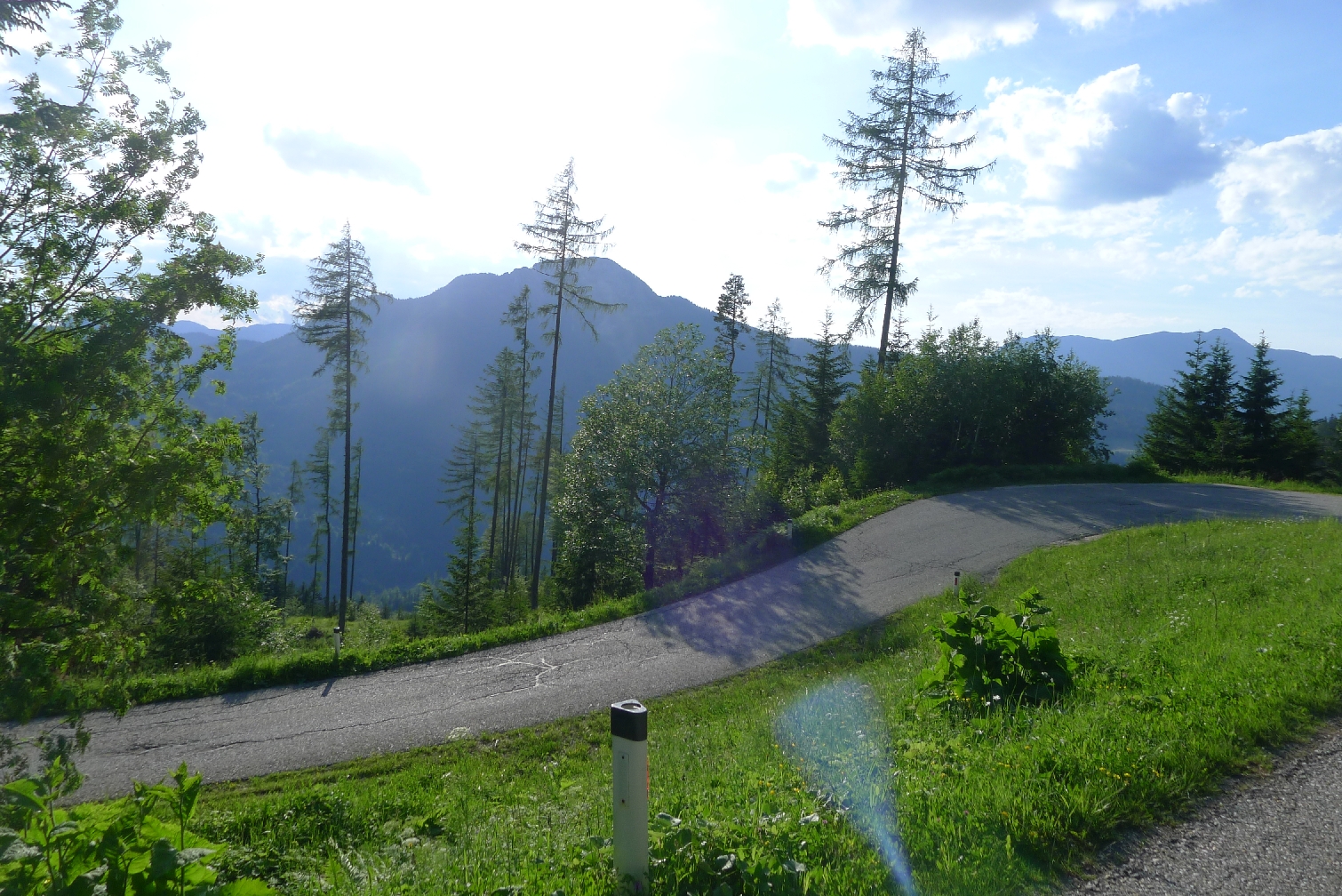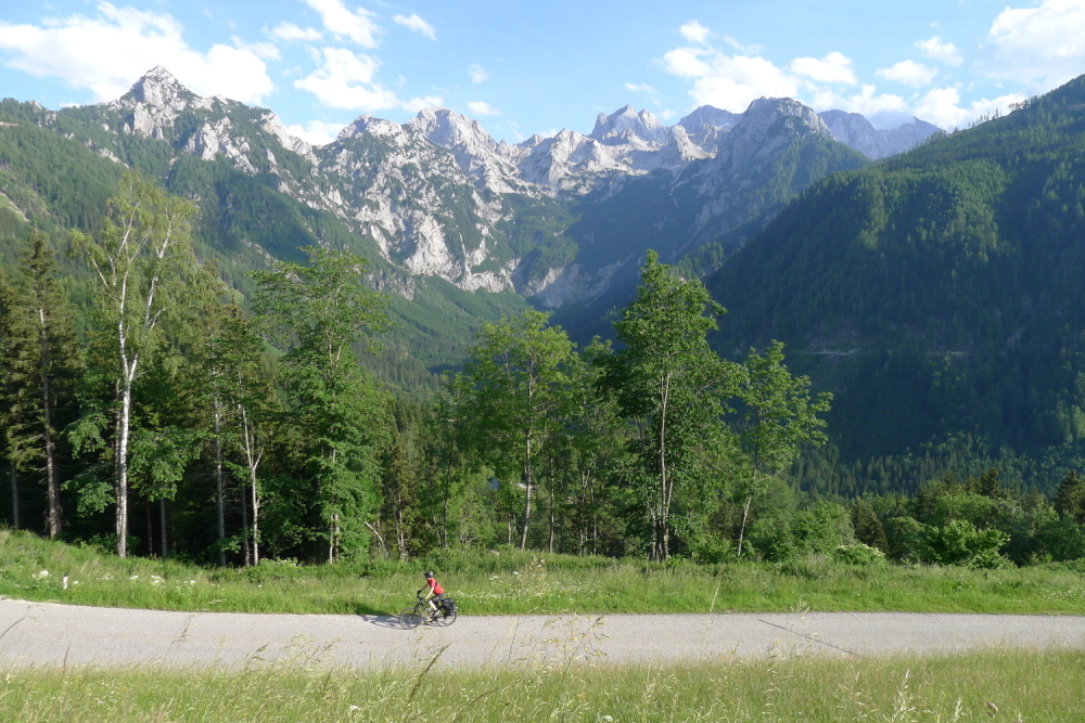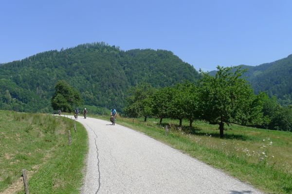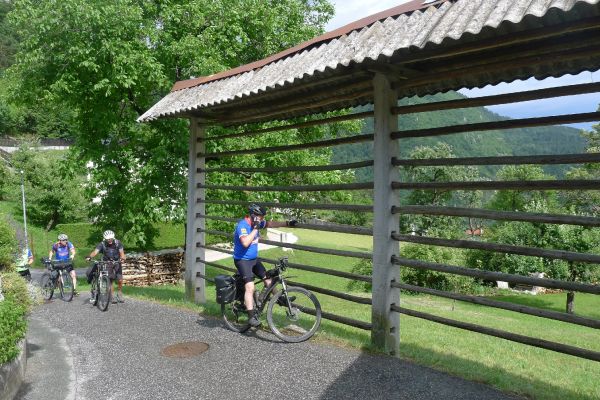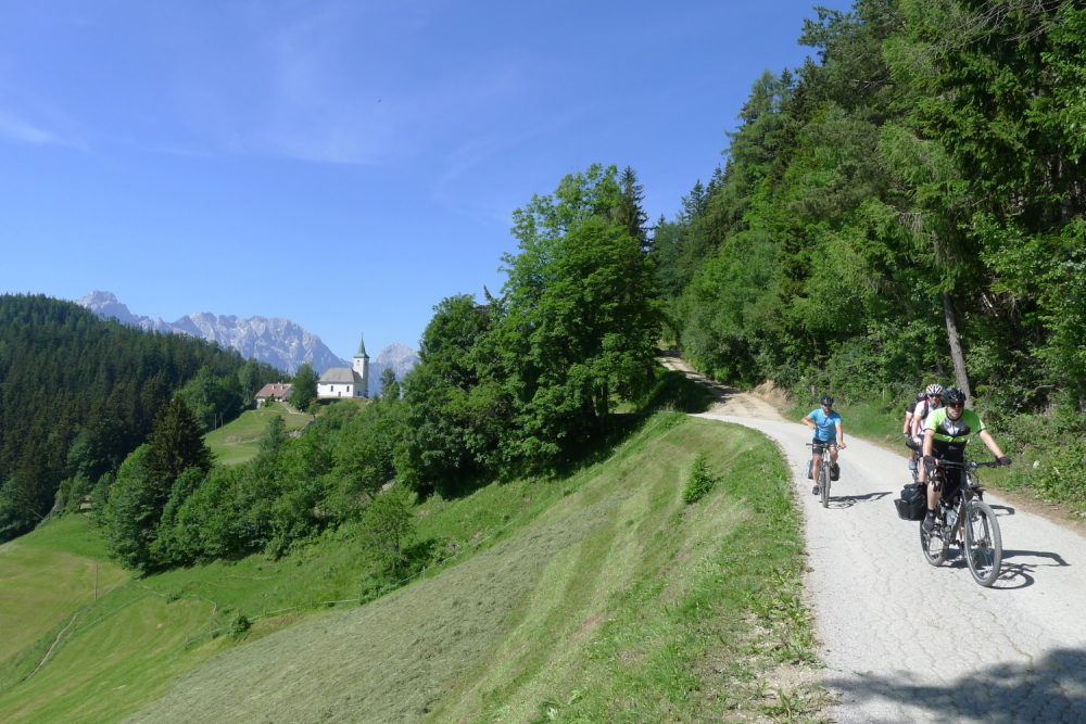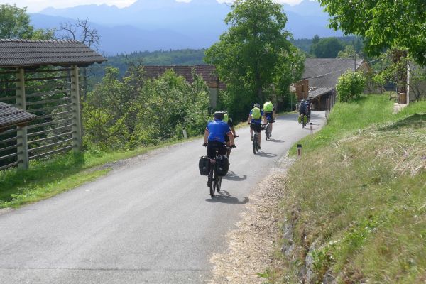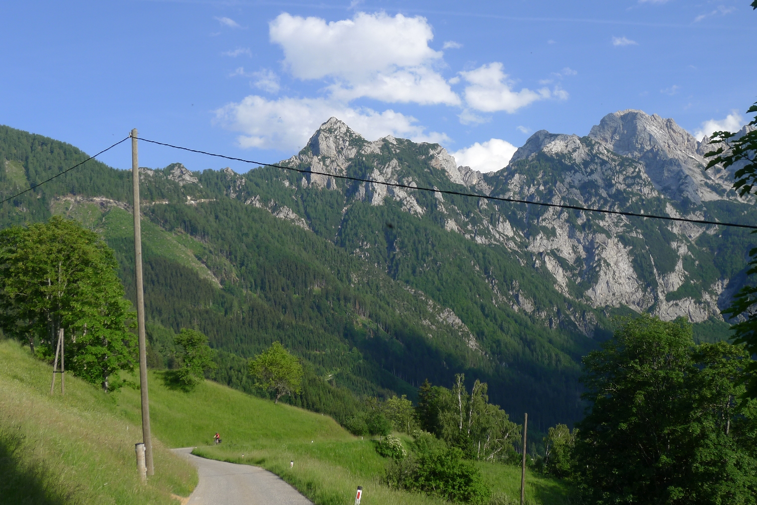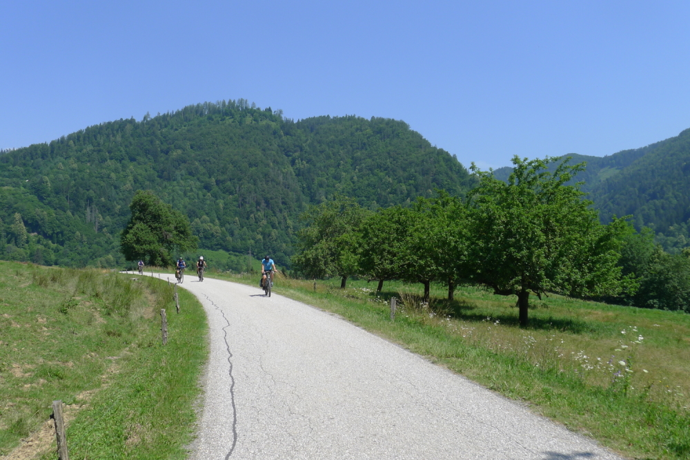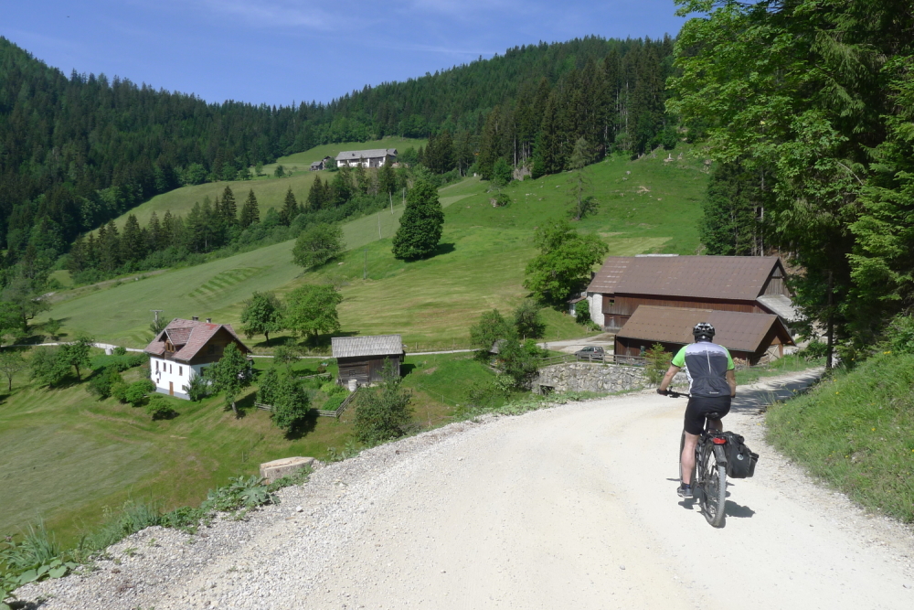 9:17 Uhr: wir starten zur 4. Etappe. Nach kurzer Abfahrt zweigen wir auf eine Nebenstraße ab. Wir bewegen uns dabei meist auf gleichem Höhenlevel, auf eine kurze Abfahrt folgt wieder ein kurzer Anstieg. Der Untergrund ist zwar meist geschottert, lässt sich aber gut befahren. Auch dass wir oft im Wald fahren ist bei dem sonnigen Tag heute sehr angenehm. Immer wieder bieten sich großartige Blicke ins Tal, auf Selbstversorger-Bauernhöfe und die kahlen Gipfel der Steiner Alpen. Die Panoramastraße trägt ihren Namen zurecht.