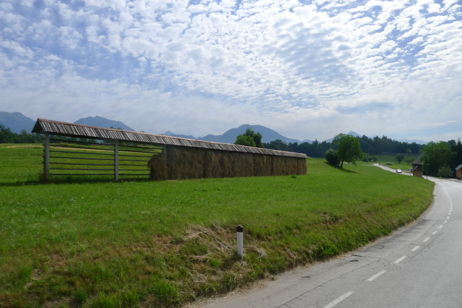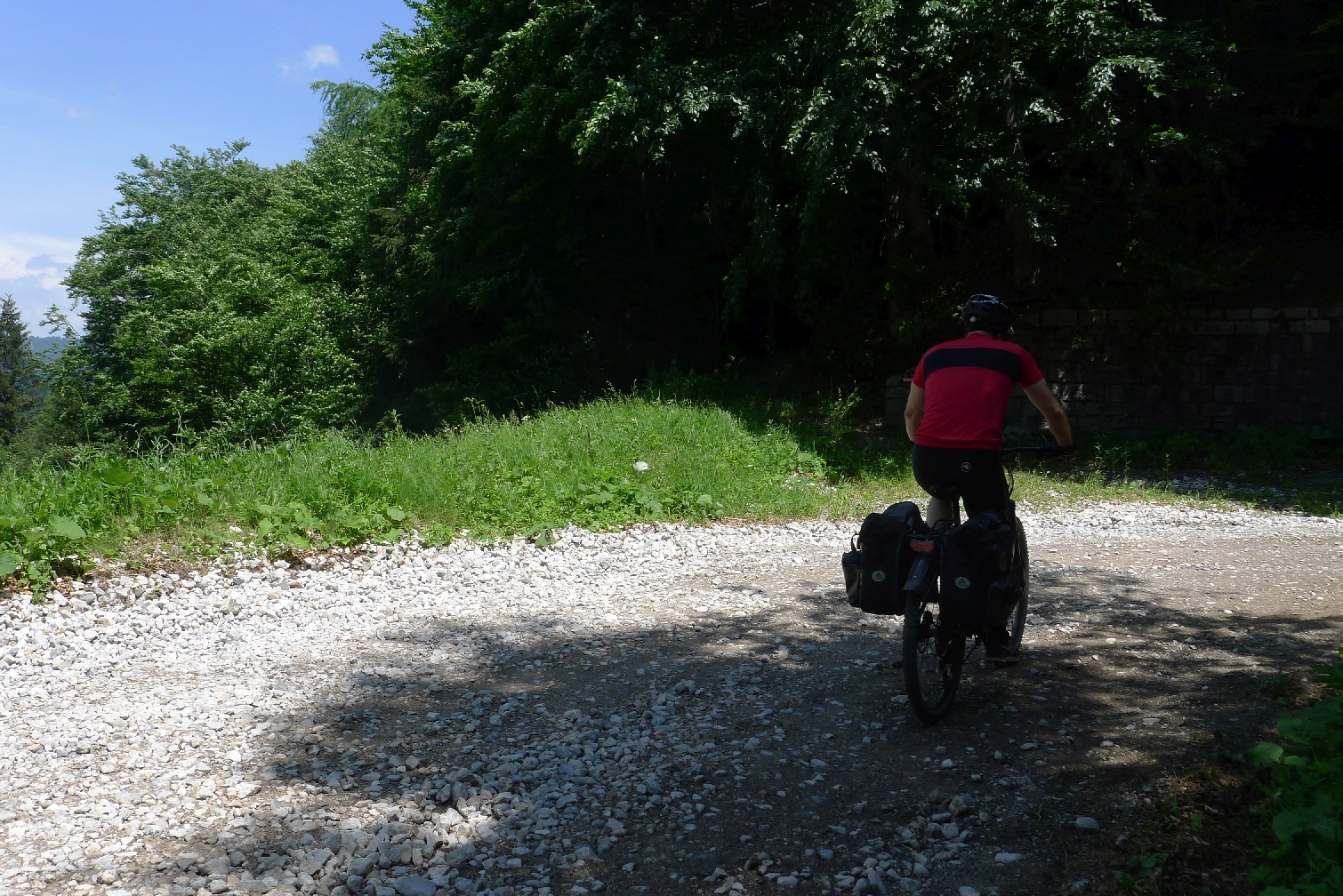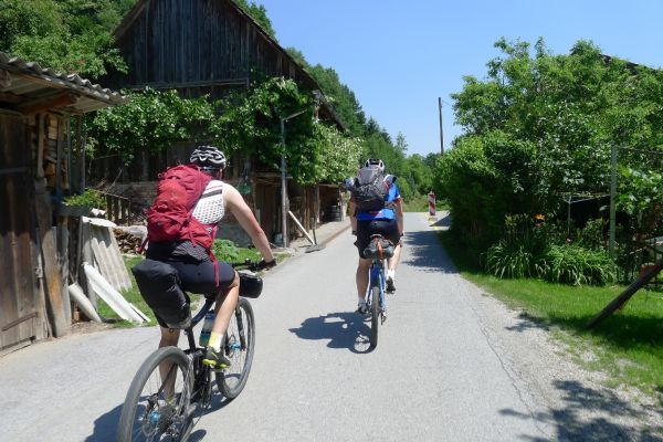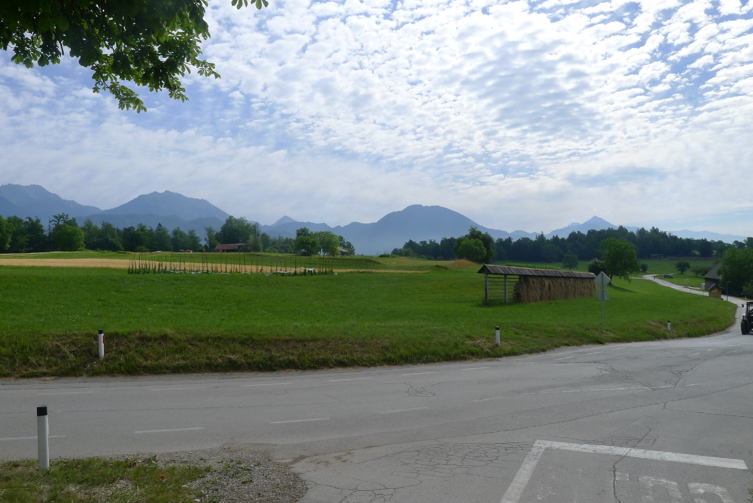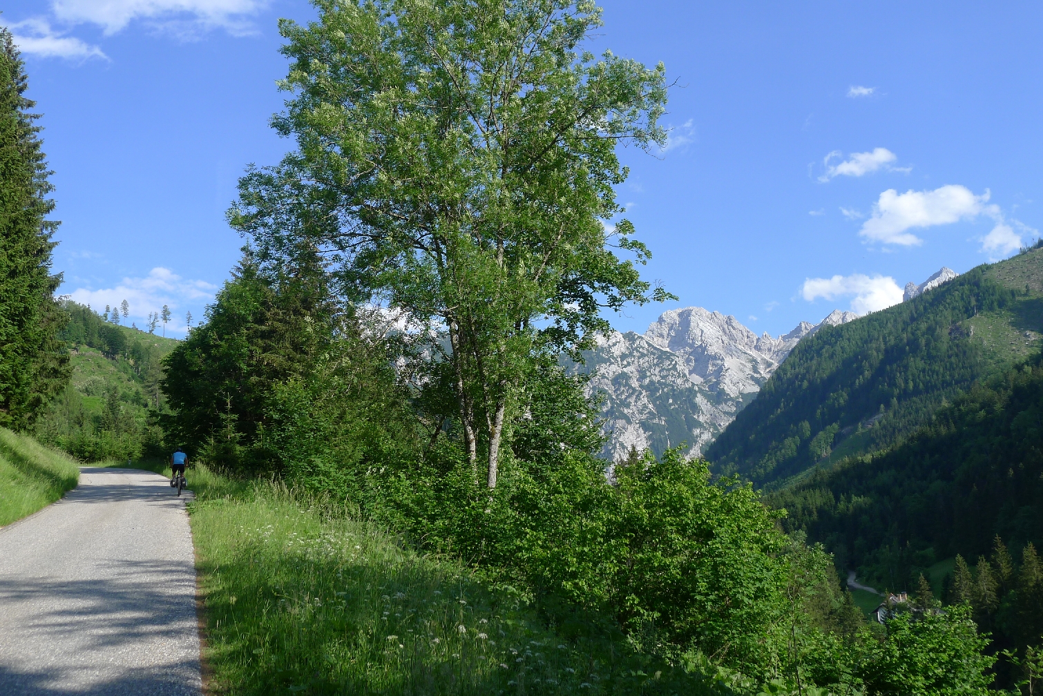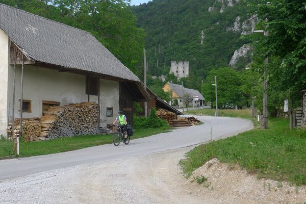 9:17 Uhr: wir starten zur 4. Etappe. Nach kurzer Abfahrt zweigen wir auf eine Nebenstraße ab. Wir bewegen uns dabei meist auf gleichem Höhenlevel, auf eine kurze Abfahrt folgt wieder ein kurzer Anstieg. Der Untergrund ist zwar meist geschottert, lässt sich aber gut befahren. Auch dass wir oft im Wald fahren ist bei dem sonnigen Tag heute sehr angenehm. Immer wieder bieten sich großartige Blicke ins Tal, auf Selbstversorger-Bauernhöfe und die kahlen Gipfel der Steiner Alpen. Die Panoramastraße trägt ihren Namen zurecht.