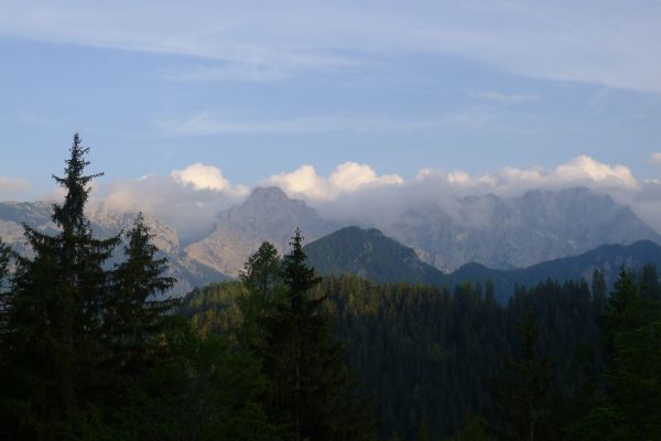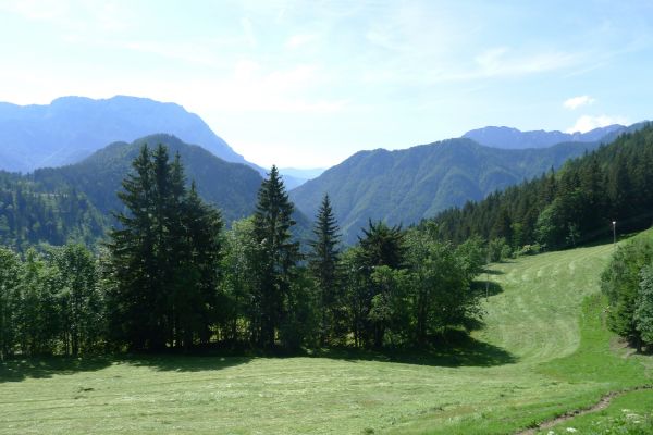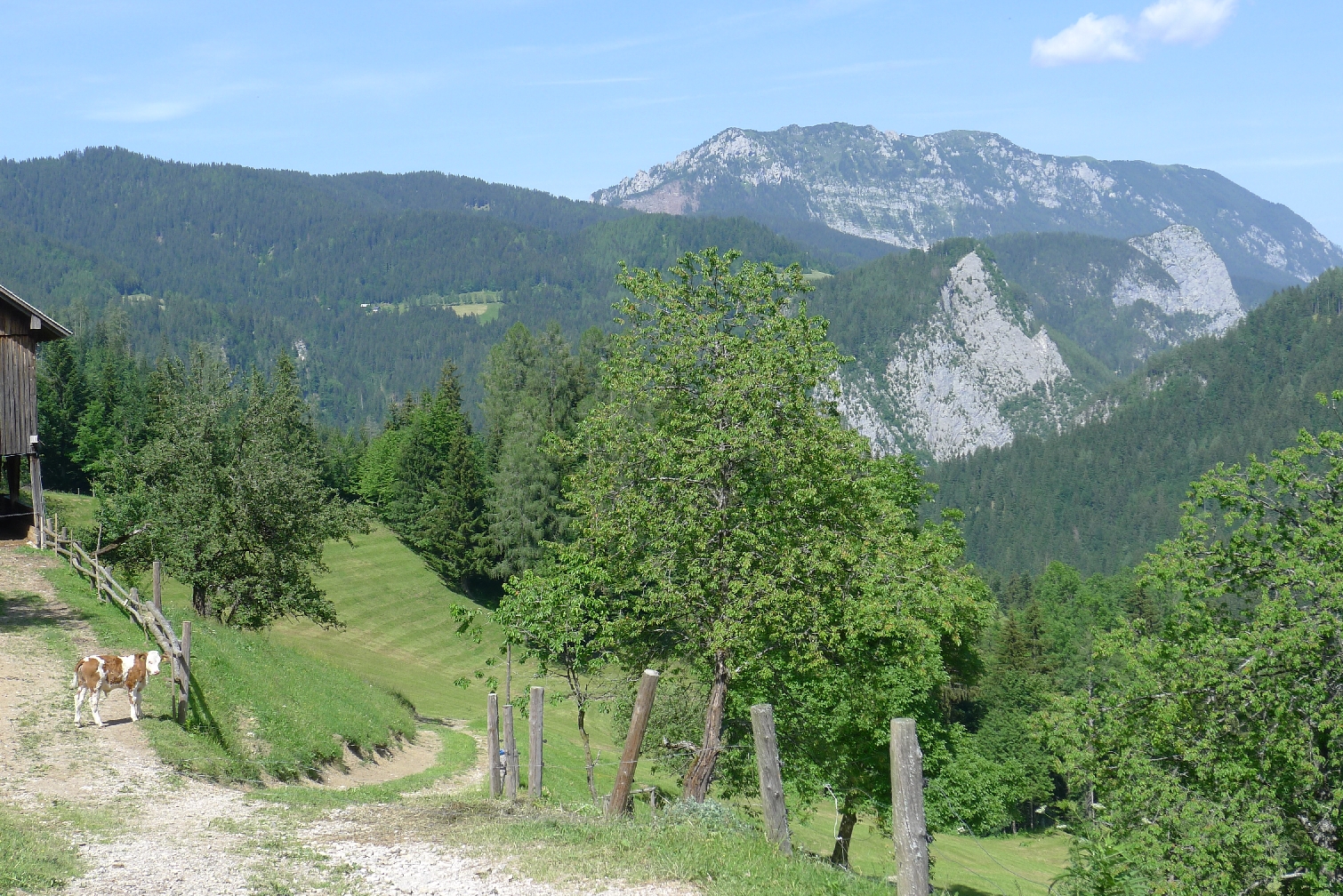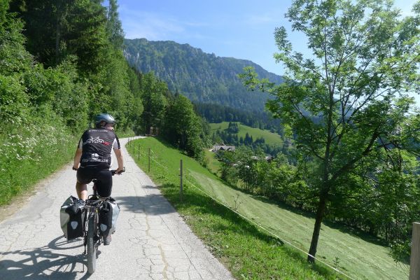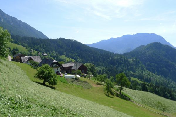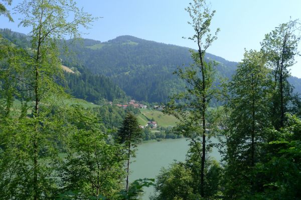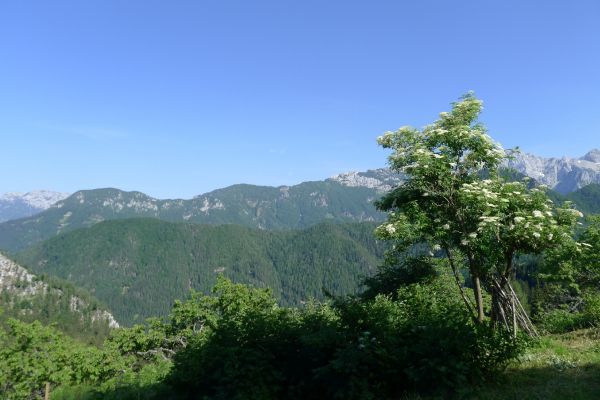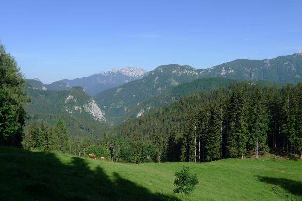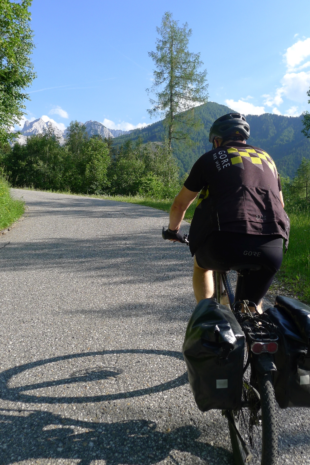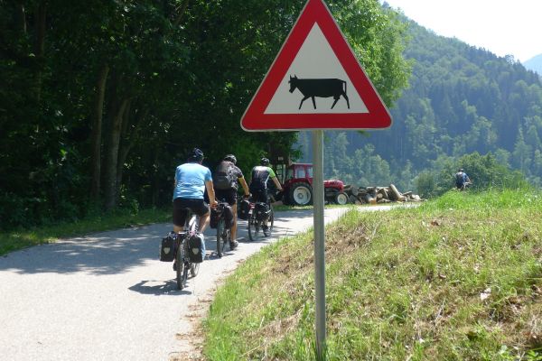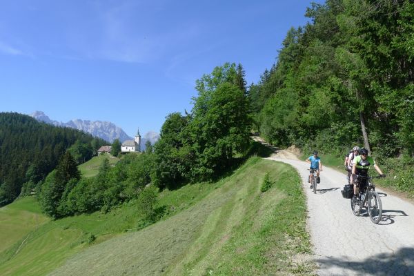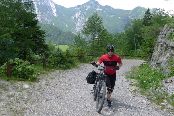 9:17 Uhr: wir starten zur 4. Etappe. Nach kurzer Abfahrt zweigen wir auf eine Nebenstraße ab. Wir bewegen uns dabei meist auf gleichem Höhenlevel, auf eine kurze Abfahrt folgt wieder ein kurzer Anstieg. Der Untergrund ist zwar meist geschottert, lässt sich aber gut befahren. Auch dass wir oft im Wald fahren ist bei dem sonnigen Tag heute sehr angenehm. Immer wieder bieten sich großartige Blicke ins Tal, auf Selbstversorger-Bauernhöfe und die kahlen Gipfel der Steiner Alpen. Die Panoramastraße trägt ihren Namen zurecht.