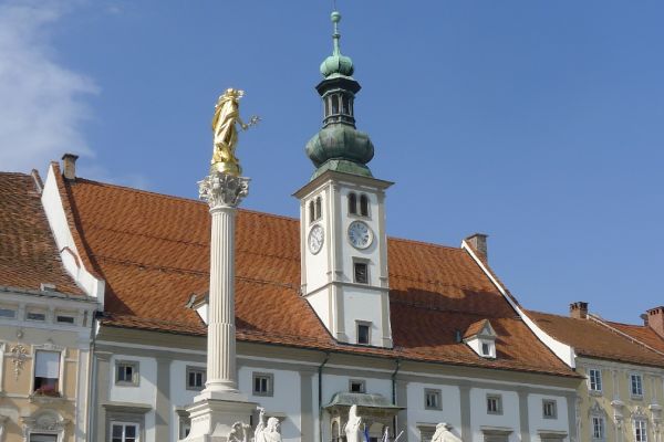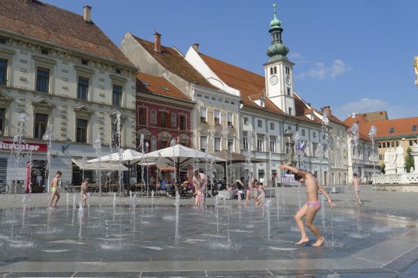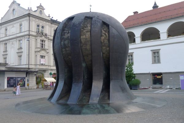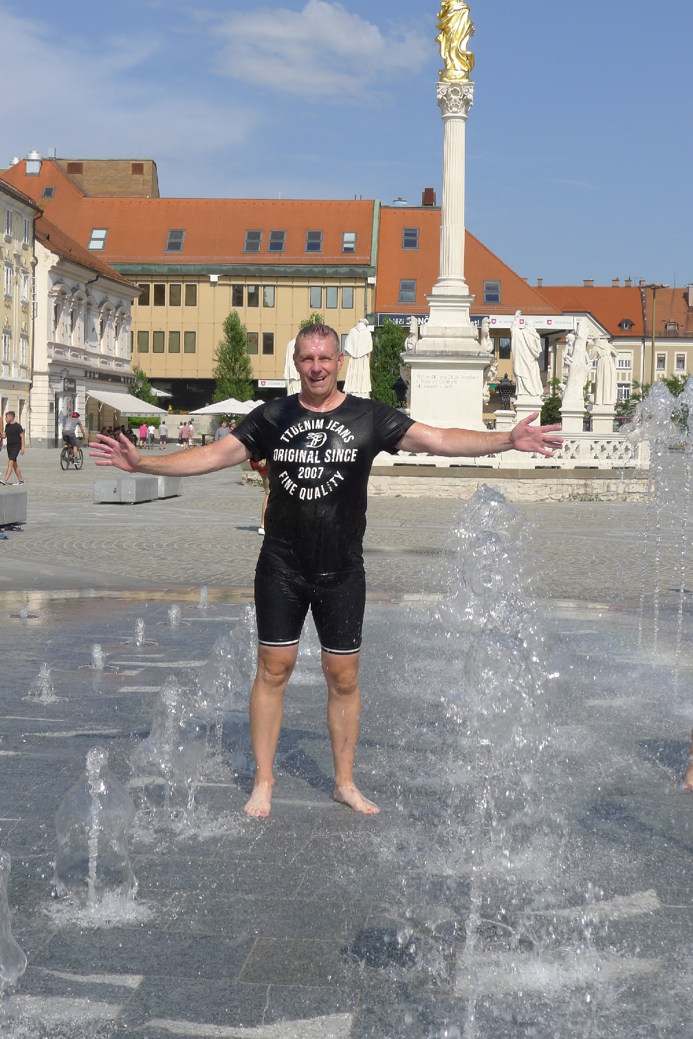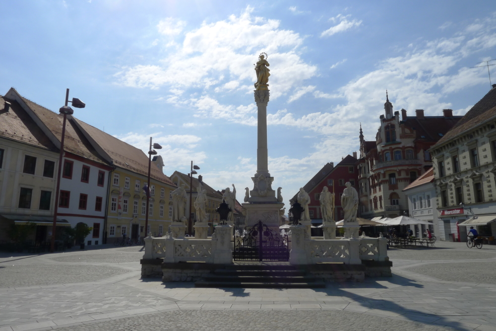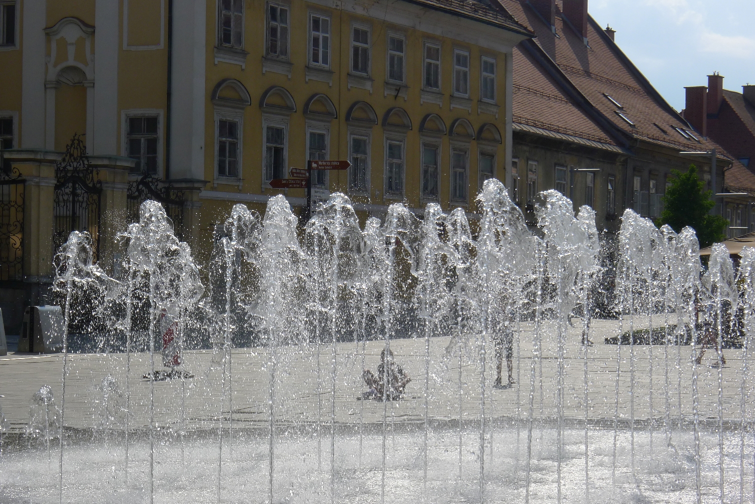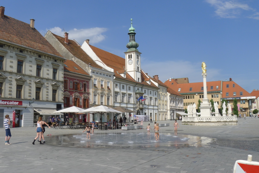 16:15 Uhr: wir erreichen den Hauptplatz mit altem Rathaus und Pestsäule. In einem Bistro lassen wir bei Espresso und einem Glas Wein die Etappe ausklingen. Der nahegelegene Springbrunnen findet nicht nur bei Kindern gefallen….