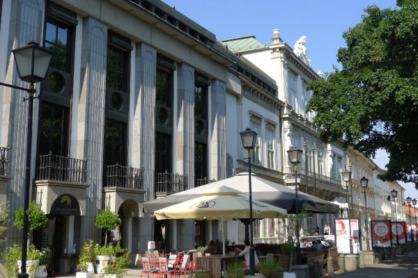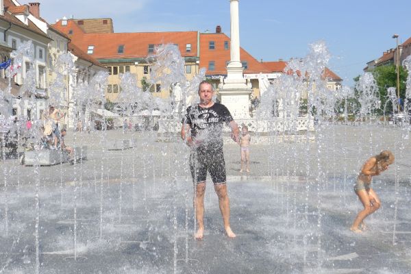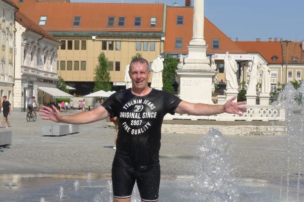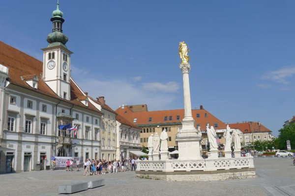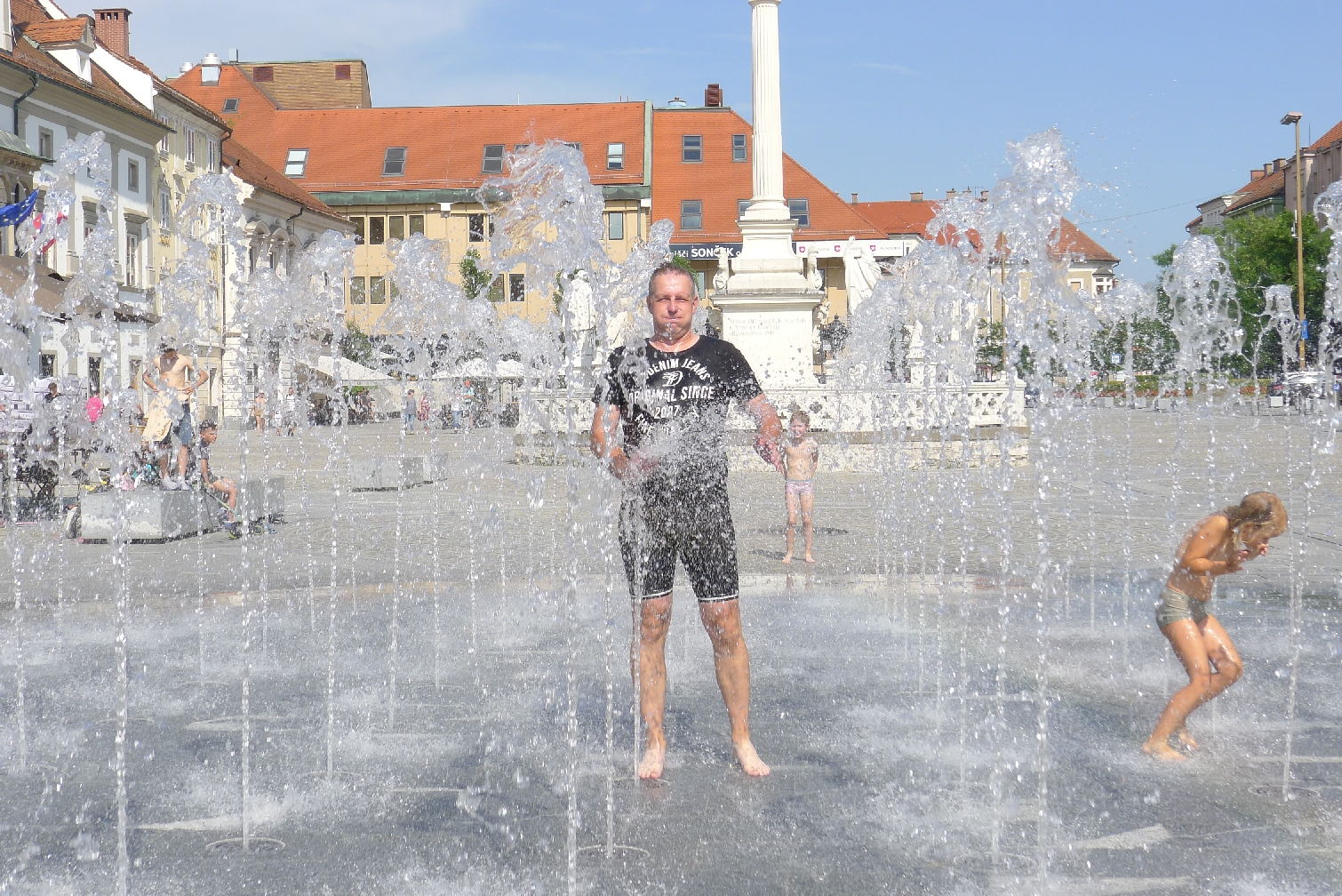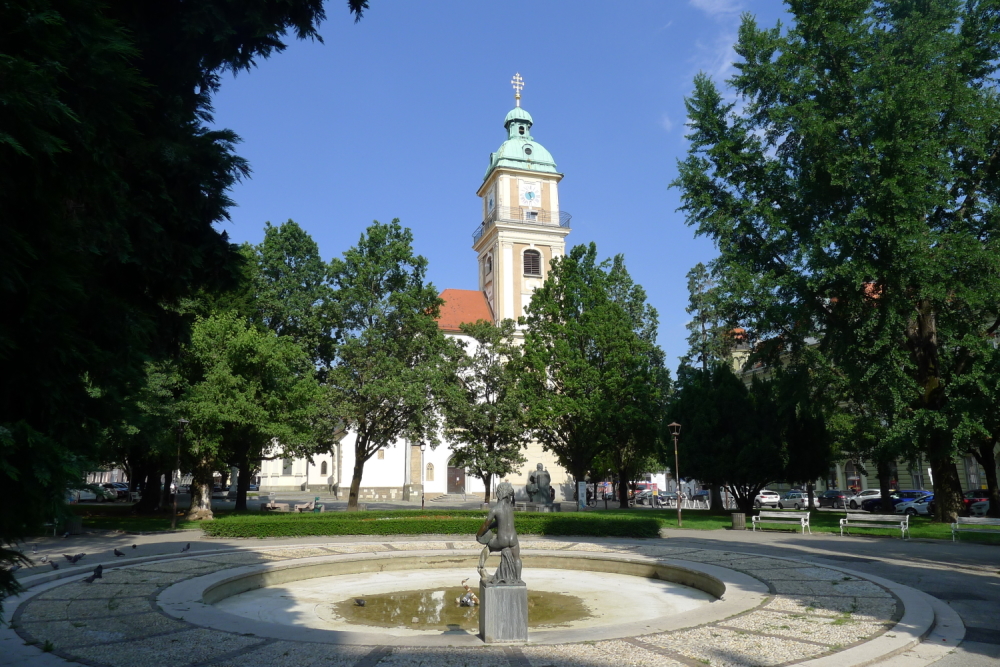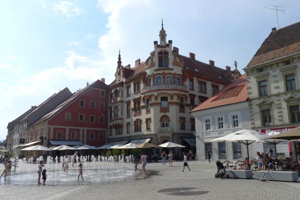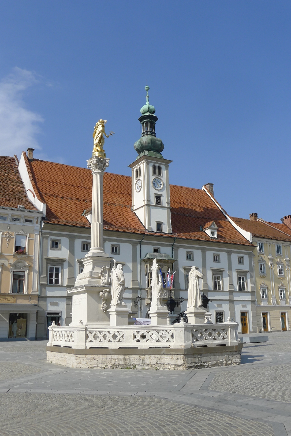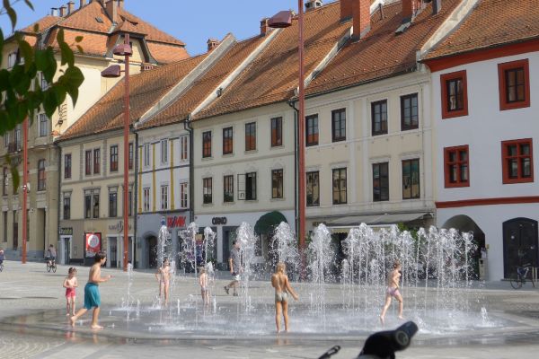 16:15 Uhr: wir erreichen den Hauptplatz mit altem Rathaus und Pestsäule. In einem Bistro lassen wir bei Espresso und einem Glas Wein die Etappe ausklingen. Der nahegelegene Springbrunnen findet nicht nur bei Kindern gefallen….