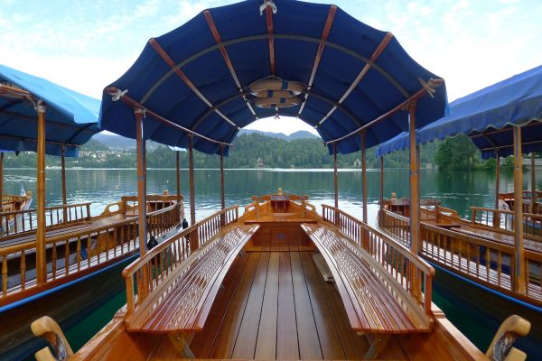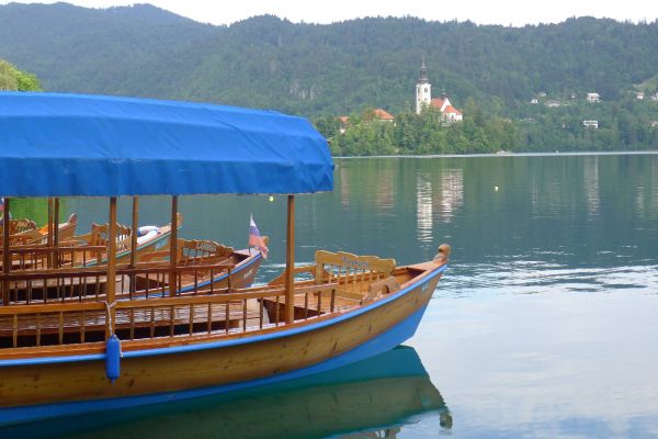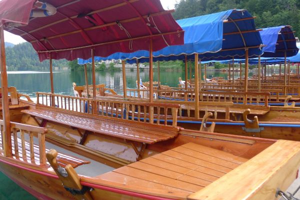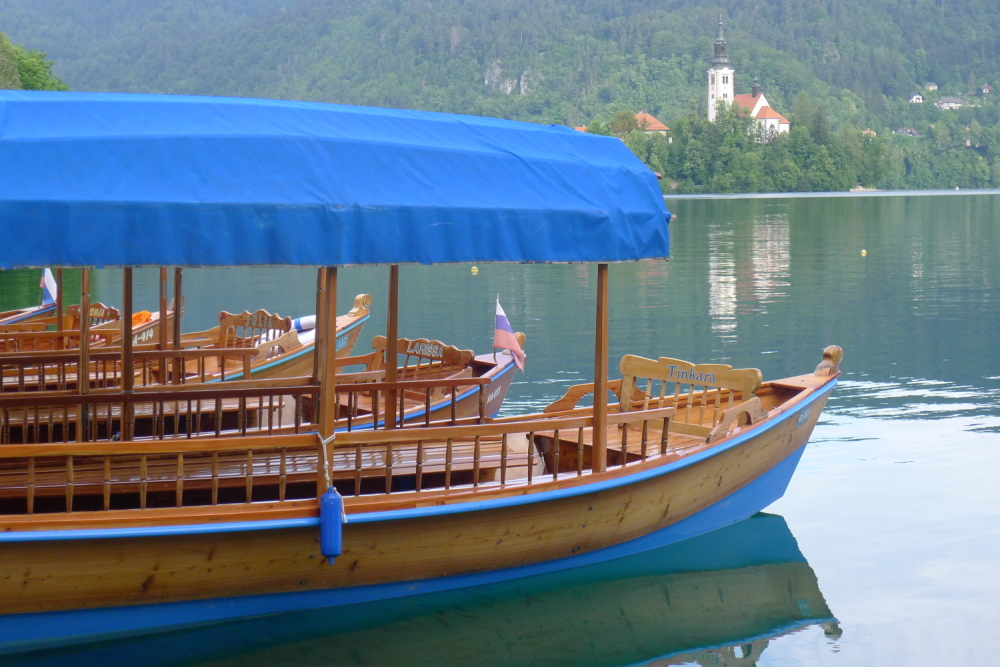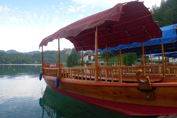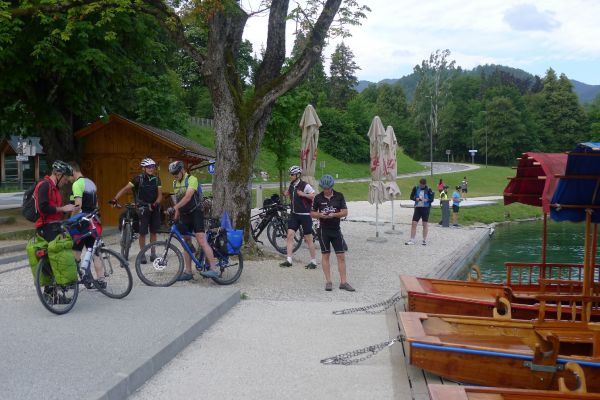 7:55 Uhr: wir satteln auf und fahren zu einem Lokal am See zum Frühstücken. In der Morgensonne plätschern die traditionellen Pletna Boote vor sich hin.
