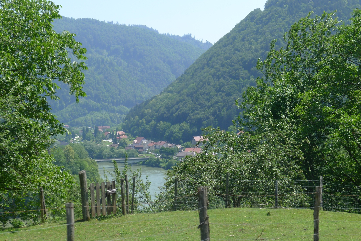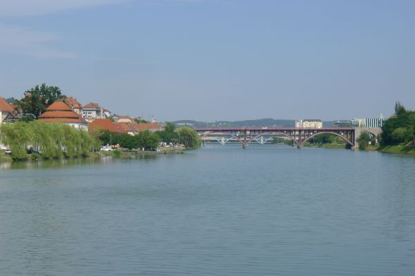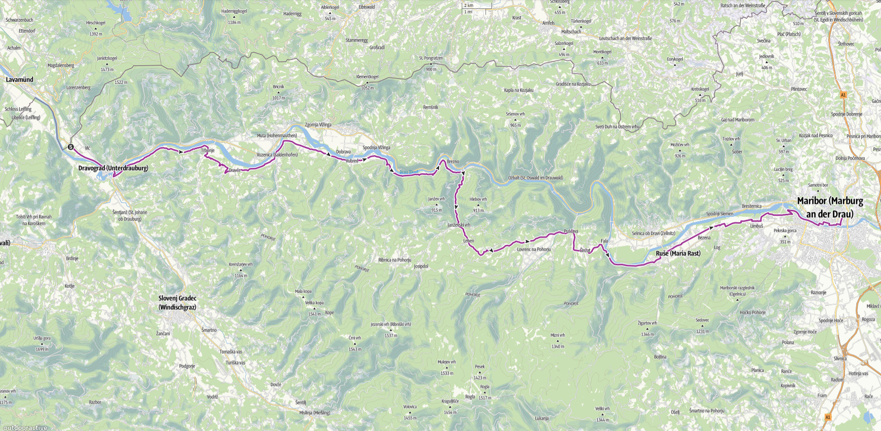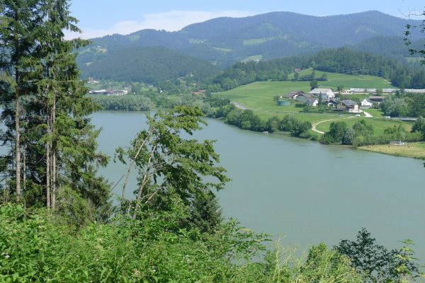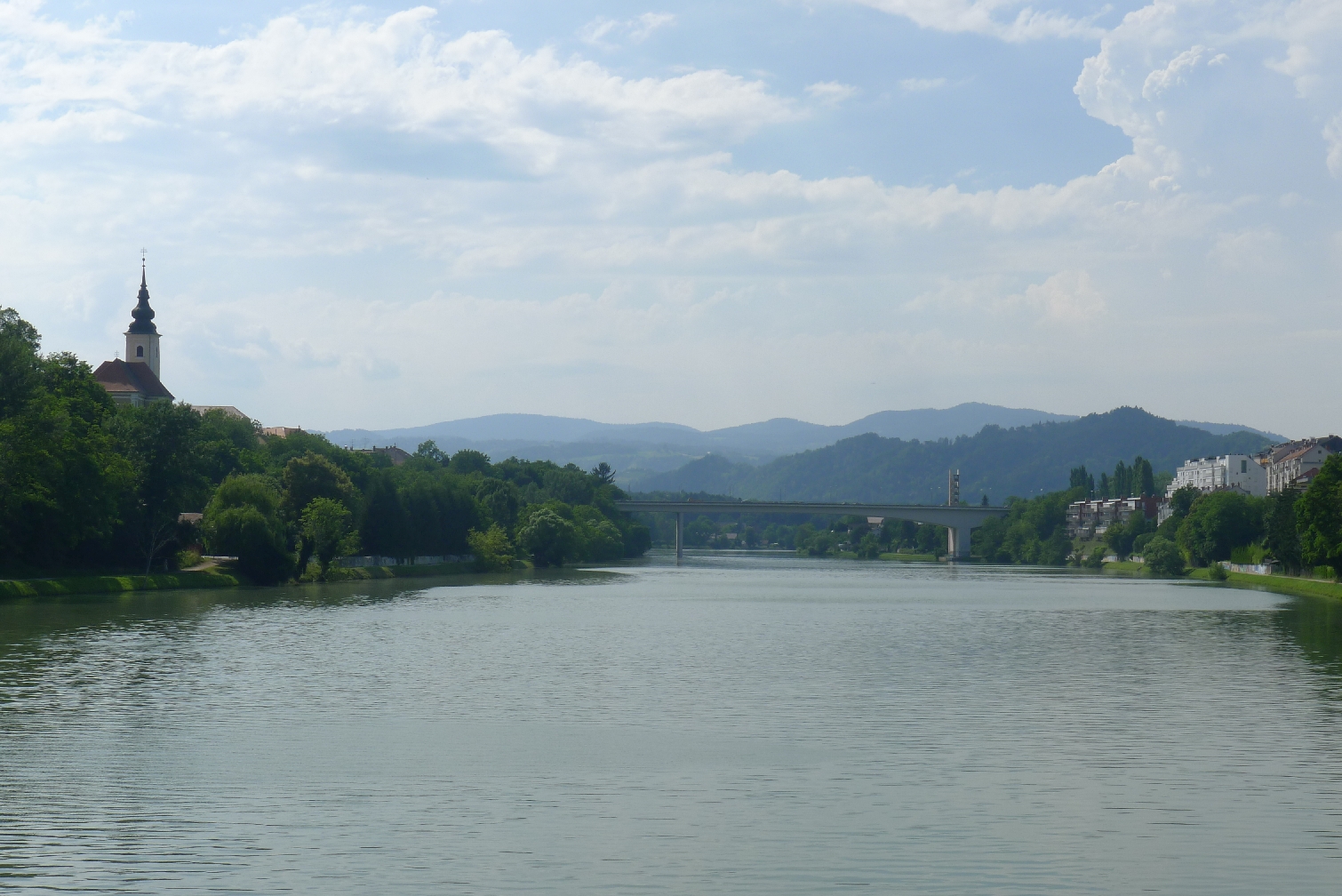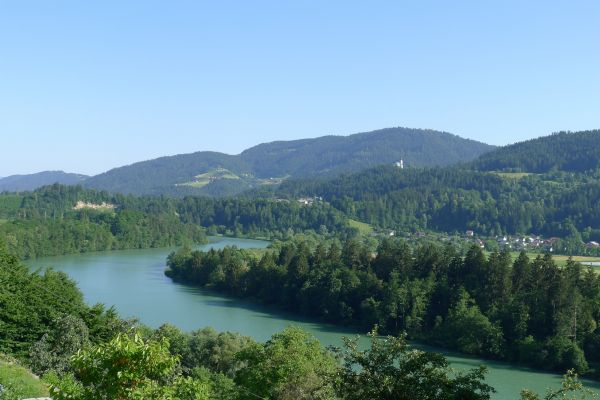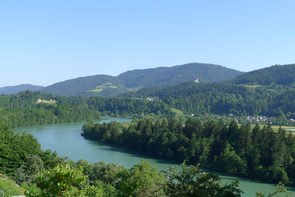 15:20 Uhr: der letzte Anstieg zwischen Puščava und Činžat ist geschafft, nun geht es hinunter nach Fala an die Drau. Über Ruše/Maria Rast radeln wir entlang des Flusses auf Maribor zu. Das letzte Teilstück ist landschaftlich nicht mehr ganz so reizvoll, aber dafür fahren wir auf einem nagelneuen Radweg auf das Etappenziel zu.