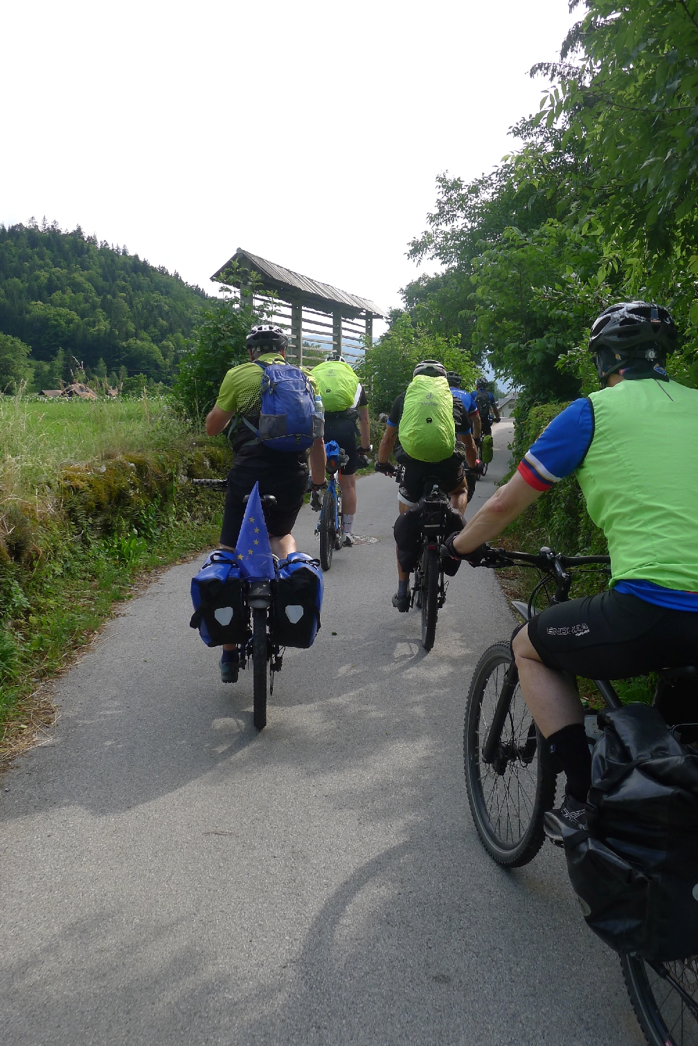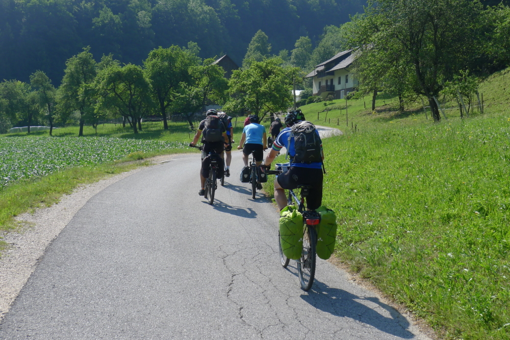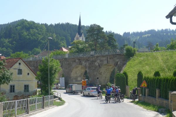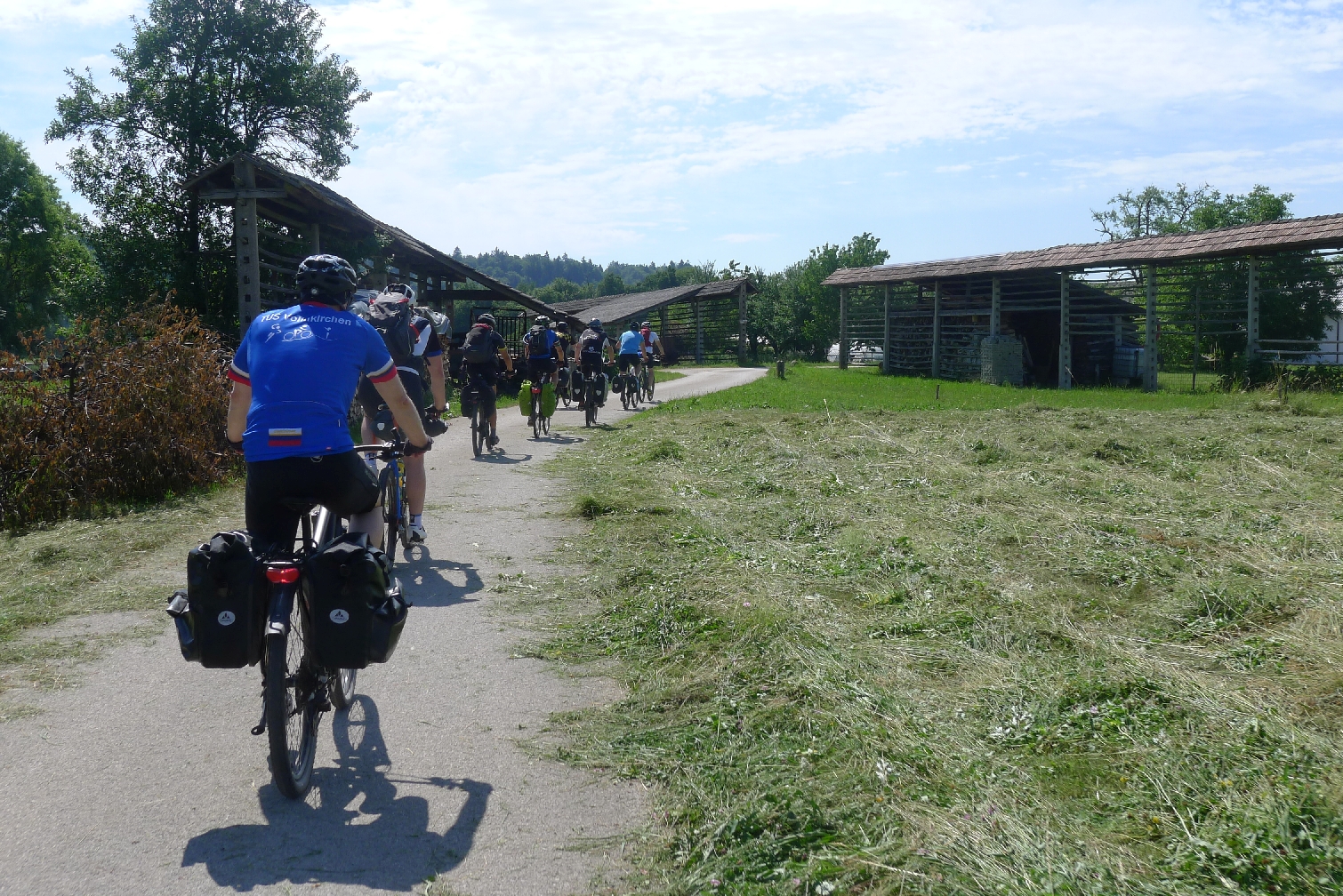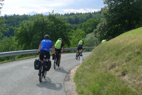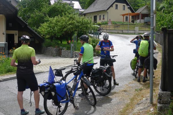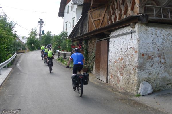 9:30 Uhr: wir starten. Die Strecke führt uns entlang des Drauradweges nach Maribor. Obwohl es keine Bergetappe ist stehen knapp 1000 Höhenmeter auf dem Routenplan. Im slowenischen Teil zwängt sich die Drau ab Dravograd in ein enges, waldgesäumtes Tal. Wir radeln meist 100m oberhalb der Drau und haben viele kleine Anstiege zu meistern. Der erste kommt schon kurz hinter Dravograd und bringt uns ins Schwitzen.