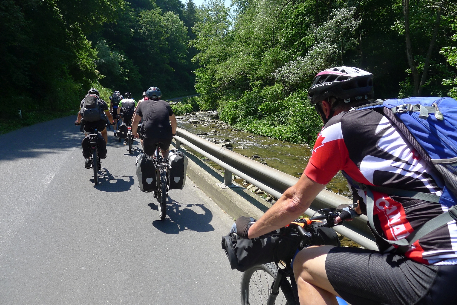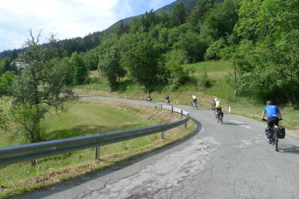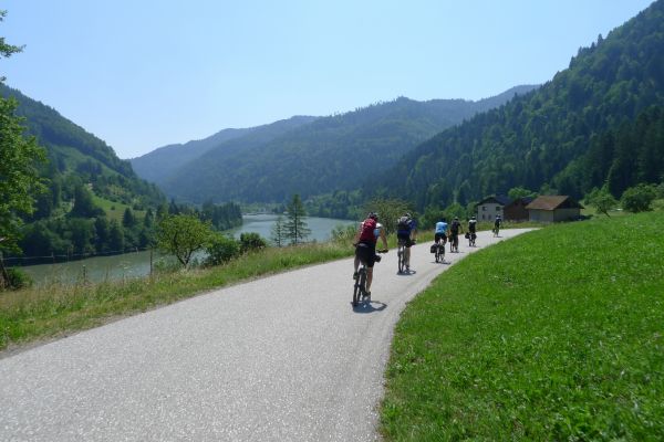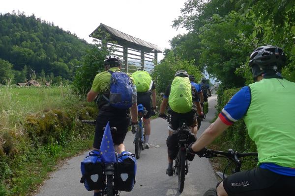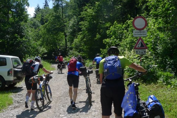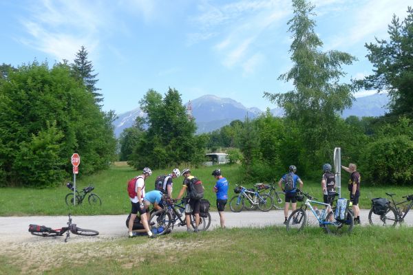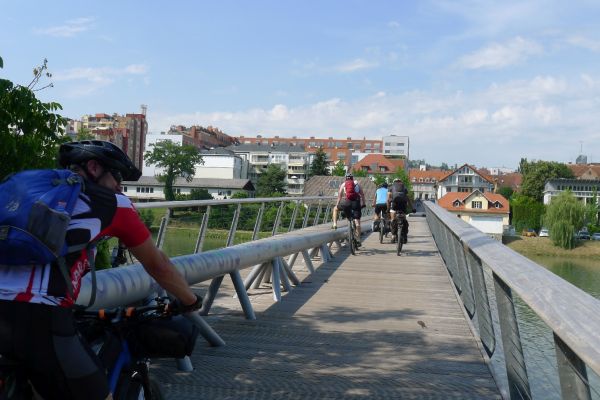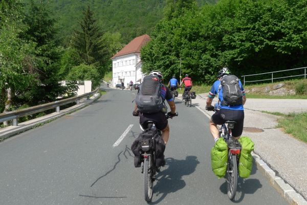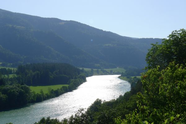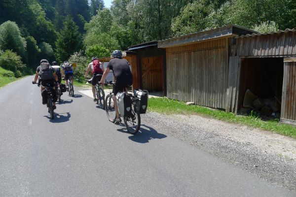 9:30 Uhr: wir starten. Die Strecke führt uns entlang des Drauradweges nach Maribor. Obwohl es keine Bergetappe ist stehen knapp 1000 Höhenmeter auf dem Routenplan. Im slowenischen Teil zwängt sich die Drau ab Dravograd in ein enges, waldgesäumtes Tal. Wir radeln meist 100m oberhalb der Drau und haben viele kleine Anstiege zu meistern. Der erste kommt schon kurz hinter Dravograd und bringt uns ins Schwitzen.