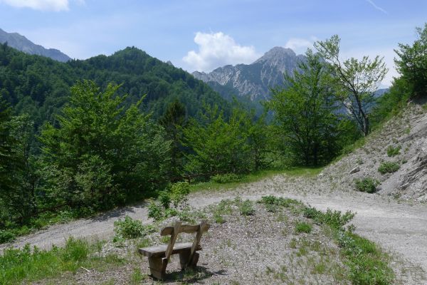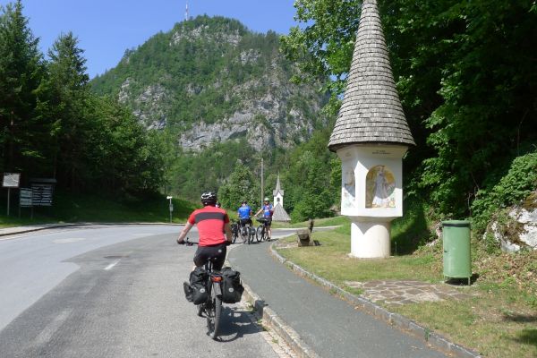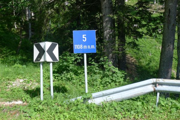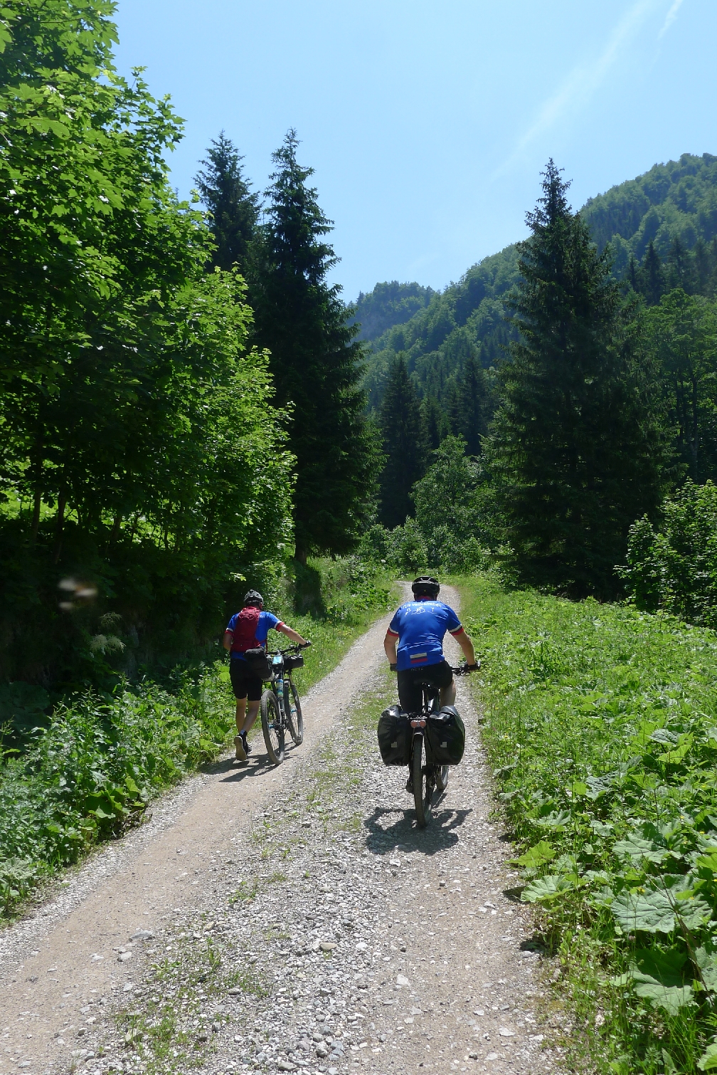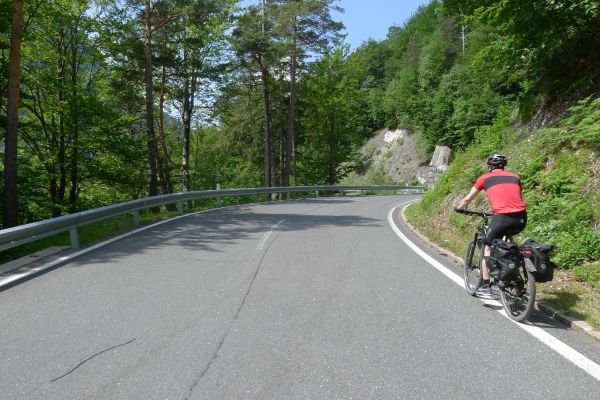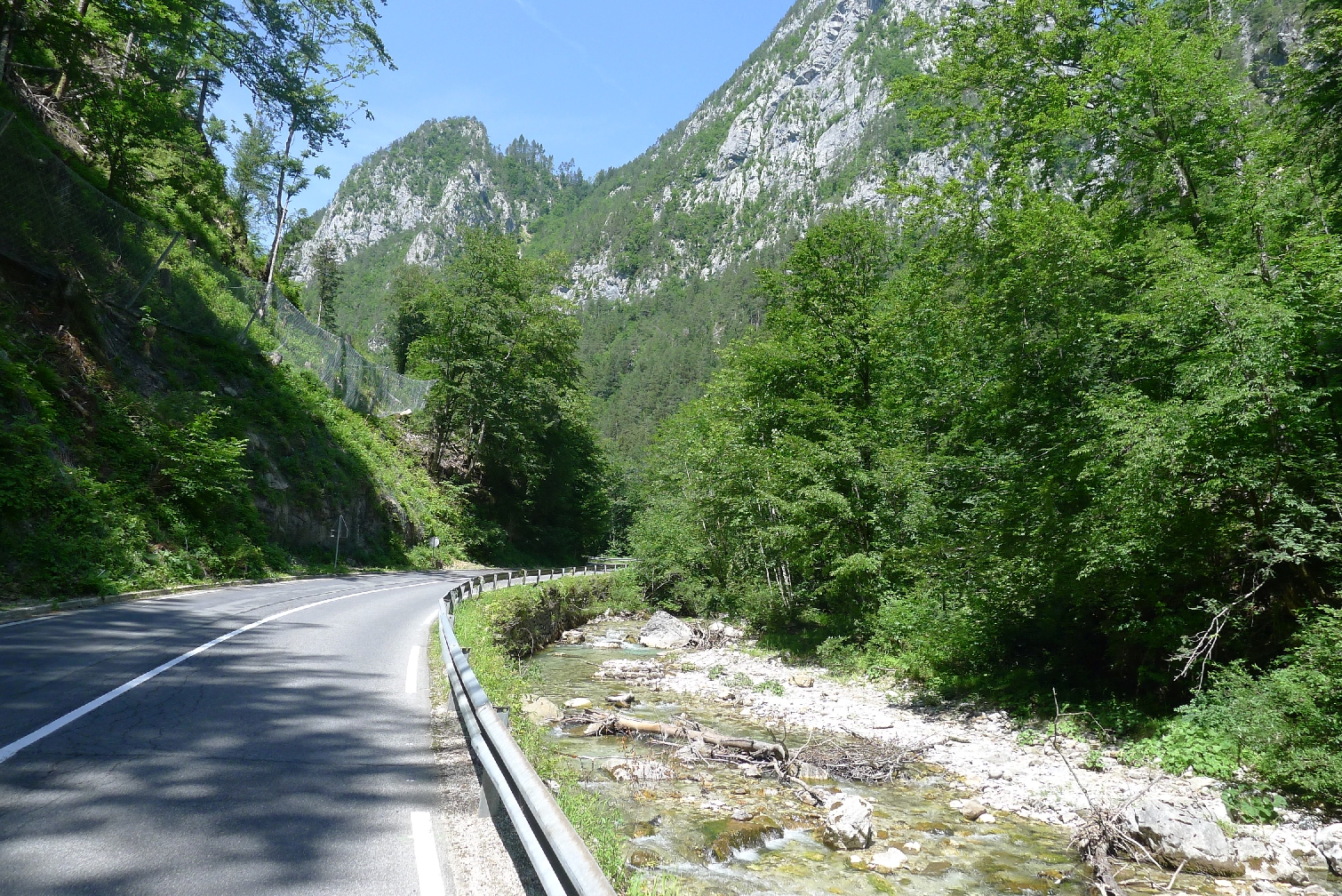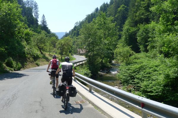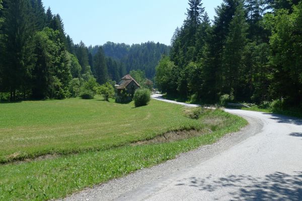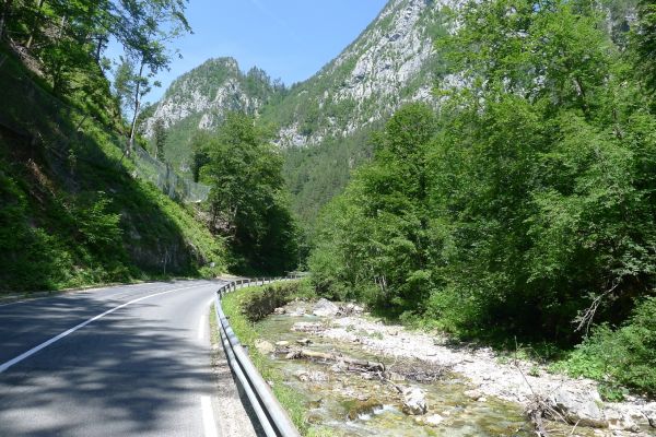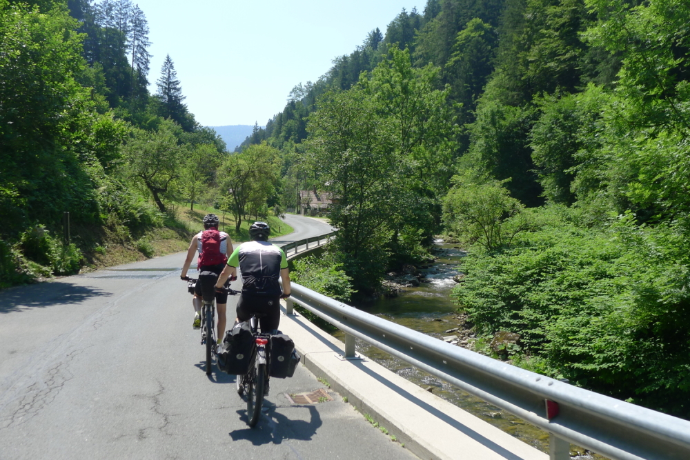 13:18 Uhr: Hinter Tupaliče erreichen wir die Landstrasse nach Zgornje Jezersko/Seeberg. Die ca 25km lange Auffahrt zum Seebergsattel beginnt. Die Strasse schlängelt sich durch ein enges Tal entlang des Flüsschen Kokra, das wir mehrfach überqueren. Bei gemässigter Steigung von 2-3% schrauben wir uns von 400m Meereshöhe auf 900m. Es rollt sehr flüssig und wir machen ordentlich Höhenmeter gut.