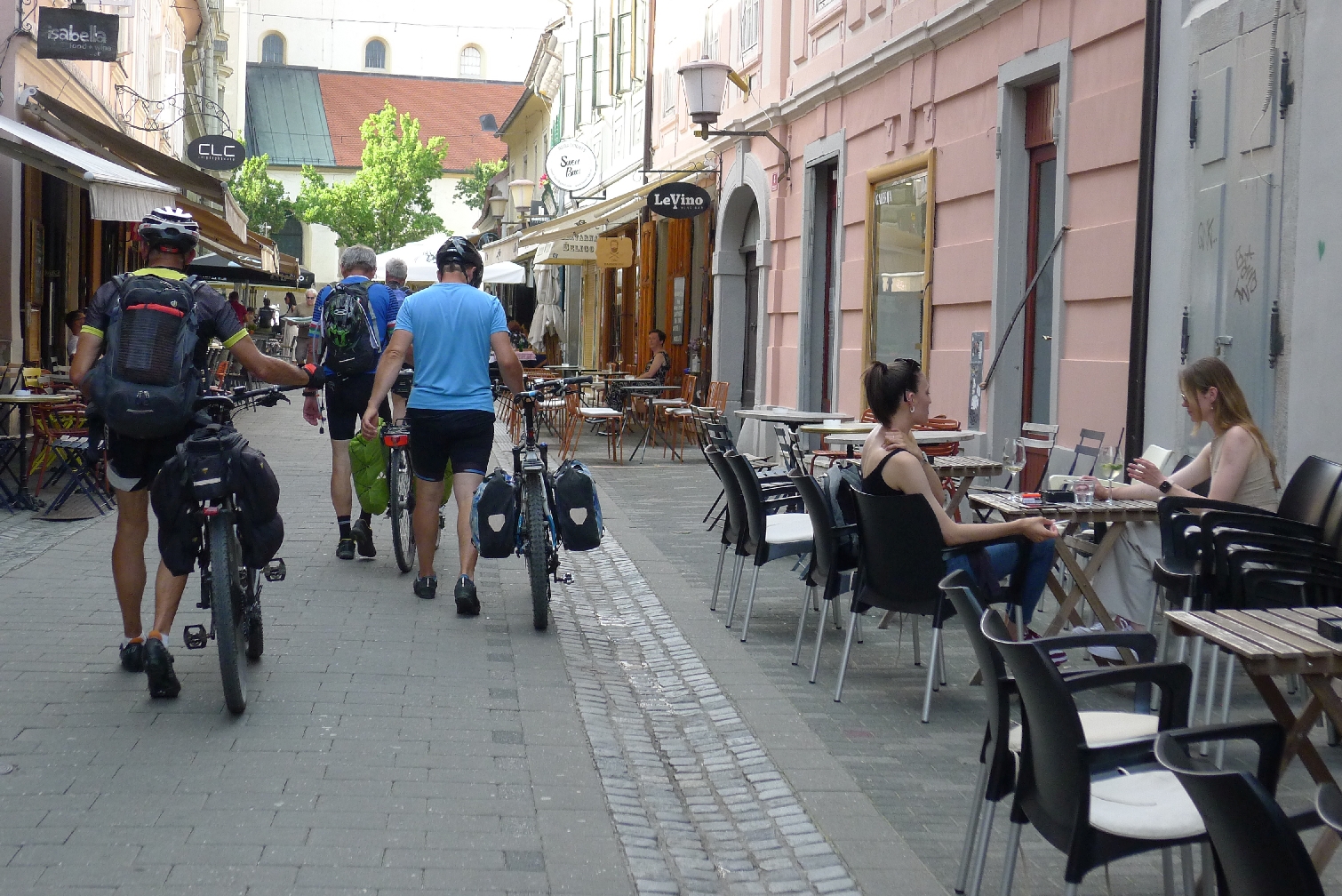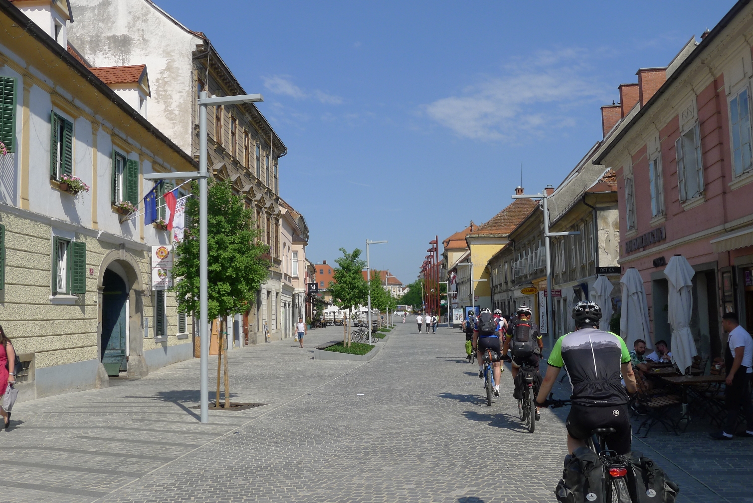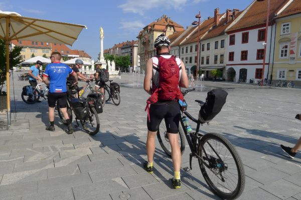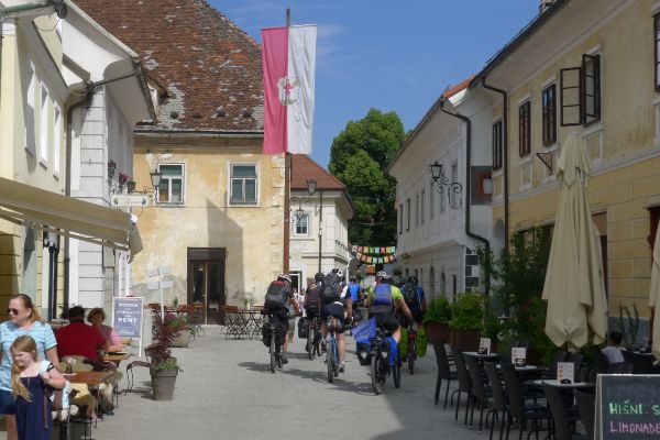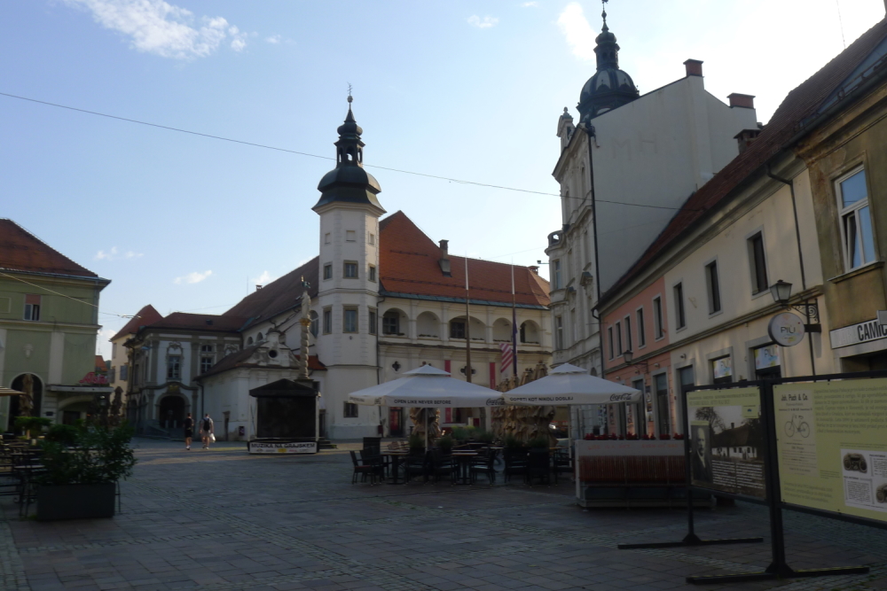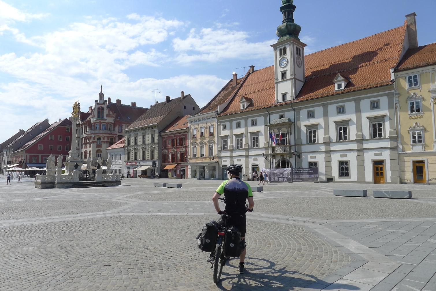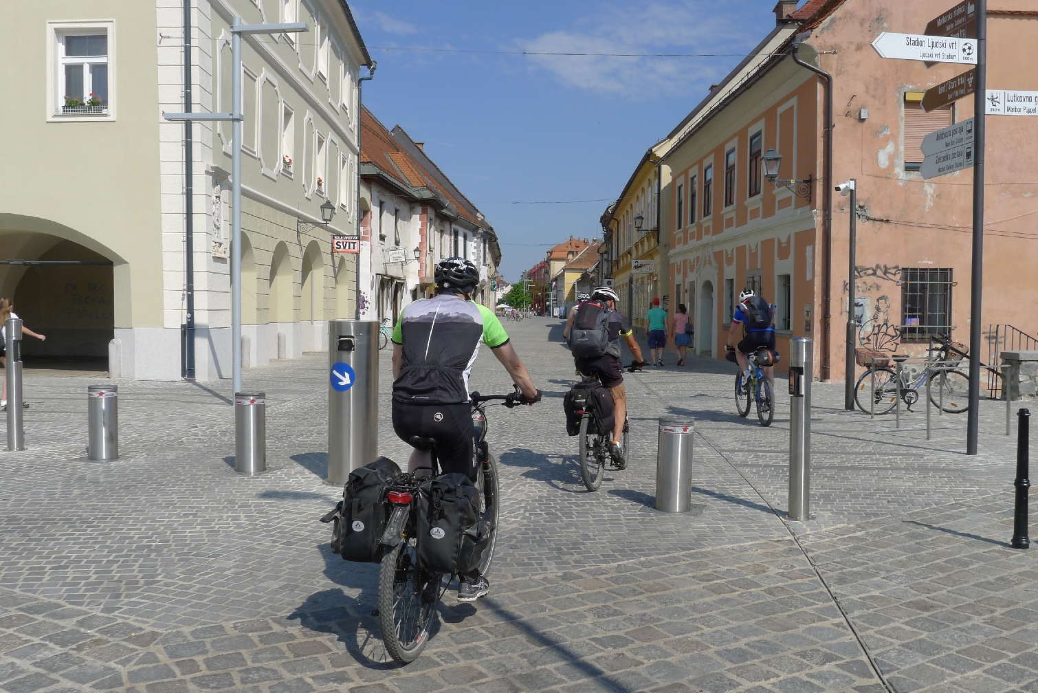 6:55 Uhr: wir satteln auf. Nochmal geht es ein kleines Stück durch die Altstadt. Vorbei am Schloss, dem Platz Trg Svobode und der Franziskanerkirche fahren wir zum Bahnhof.