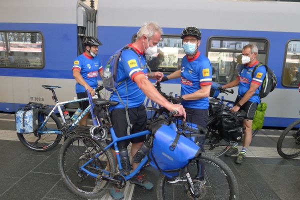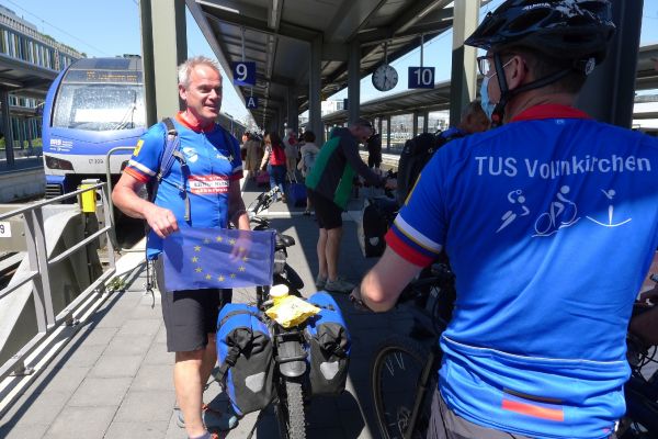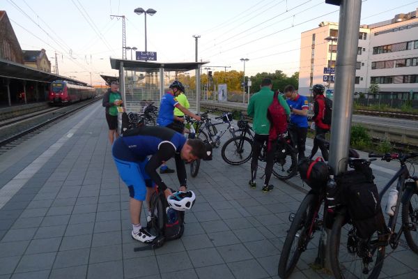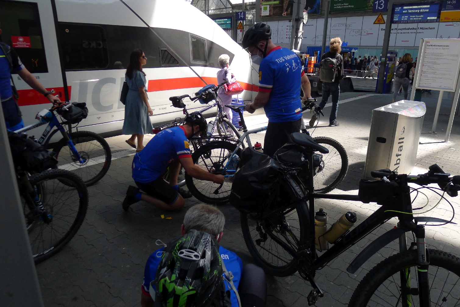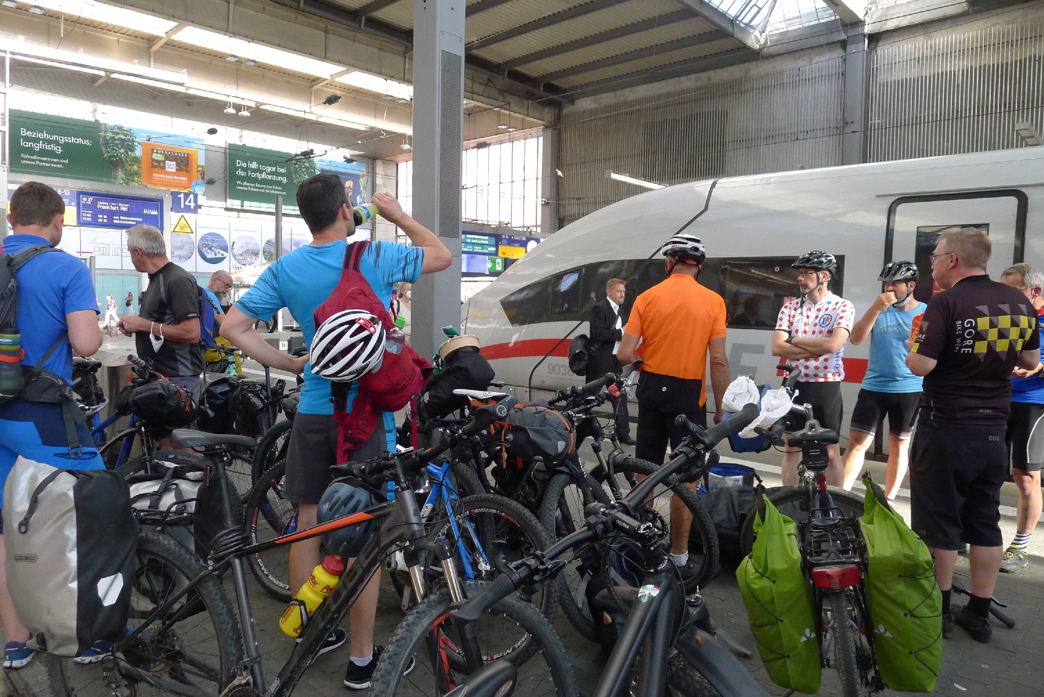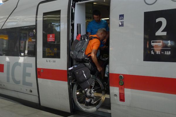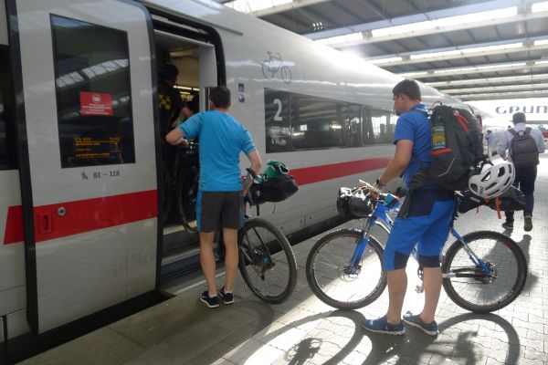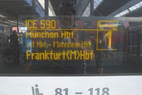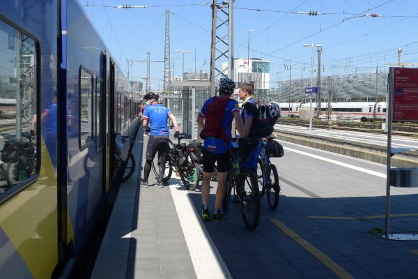 7:52 Uhr: der ICE nach München fährt ein. Da wir nur 8 Fahrradstellplätze haben, muss ein Rad als Handgepäck mitreisen. Thomas hat das Procedere im Vorfeld geübt und in Nullkommanichts ist sein Rad zerlegt und im Gepäckfach verstaut.