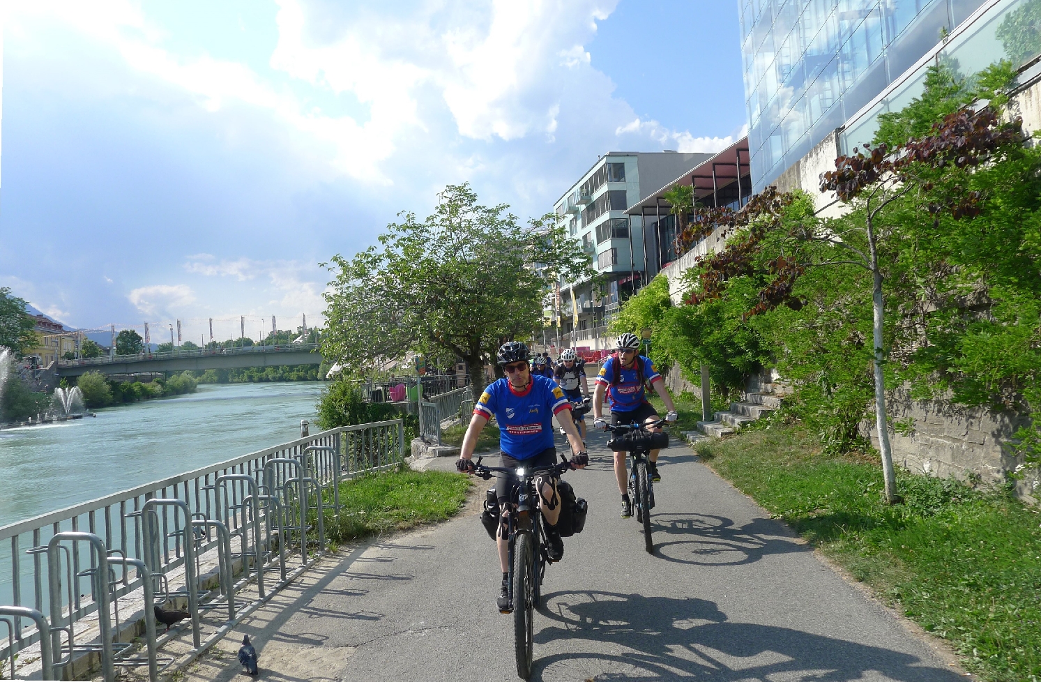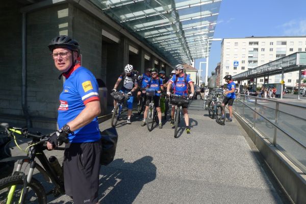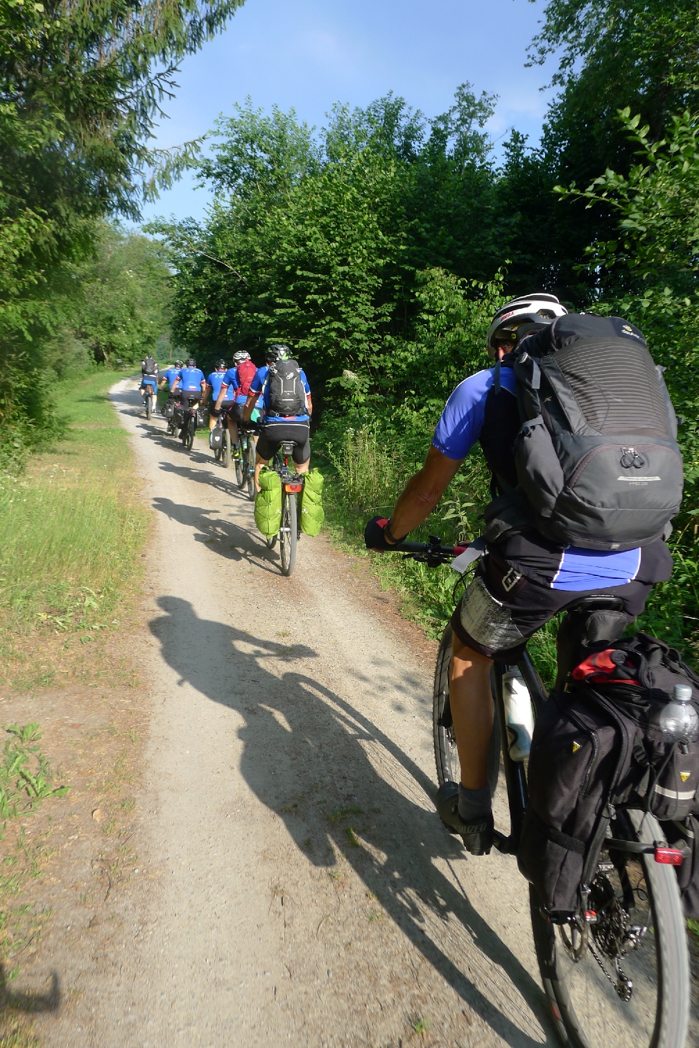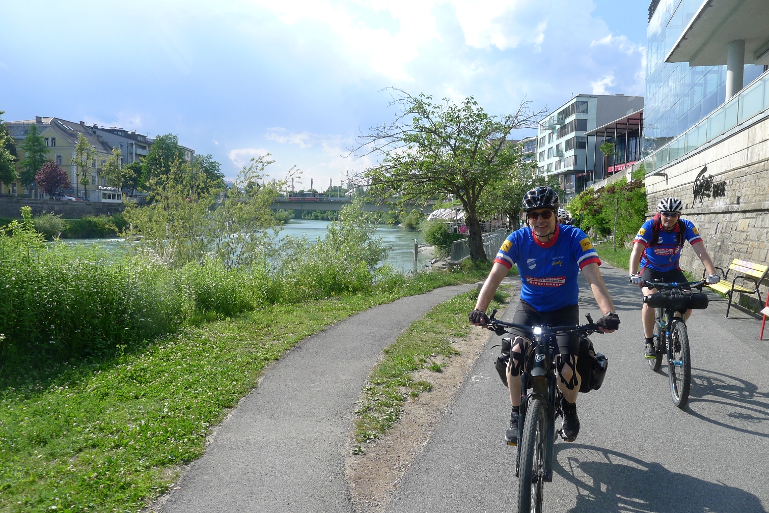 17:05 Uhr: scharfer Start der 1. Etappe. Wir rollen hinunter zur Drau und folgen dem Drauradweg. Es geht meist auf einem Dammweg nahe am Wasser entlang, wir haben die Sonne im Rücken und immer wieder Ausblicke auf das türkisgrüne Wasser der Drau.