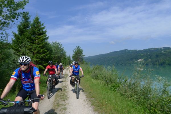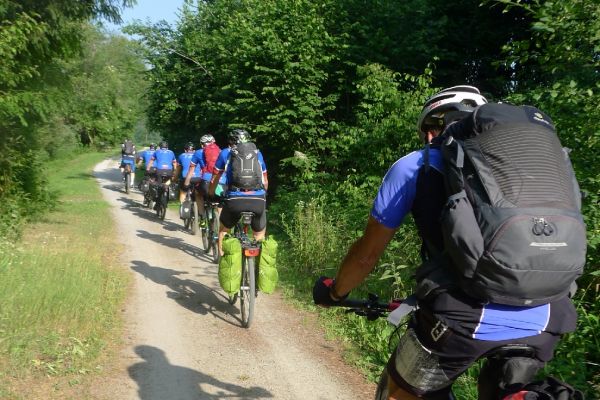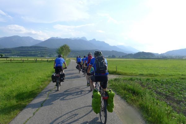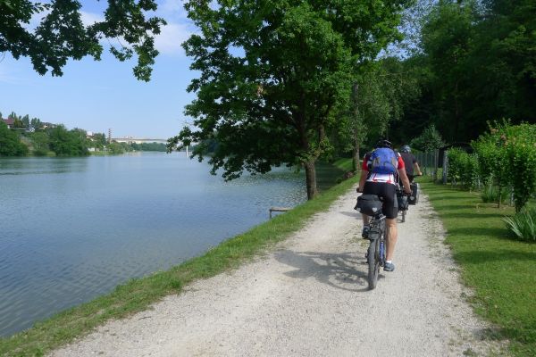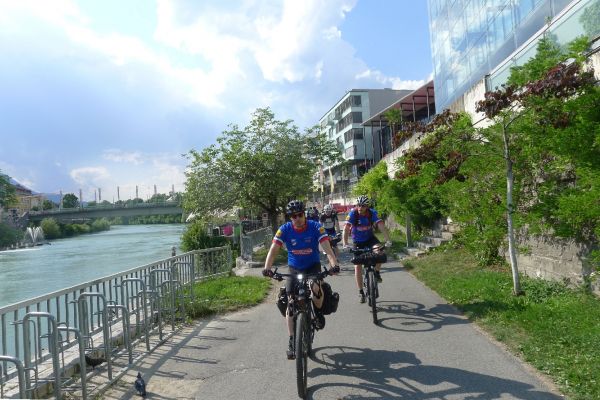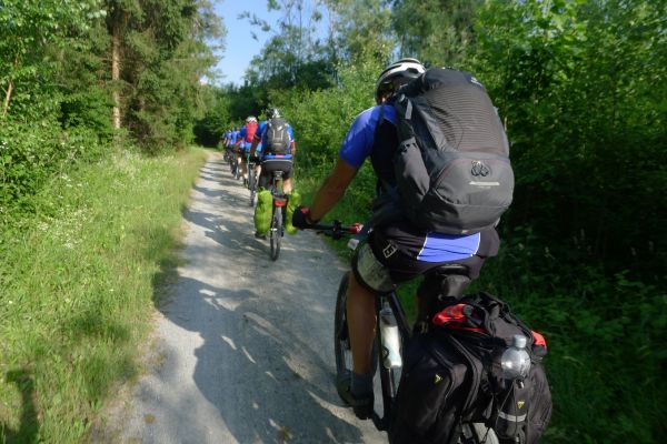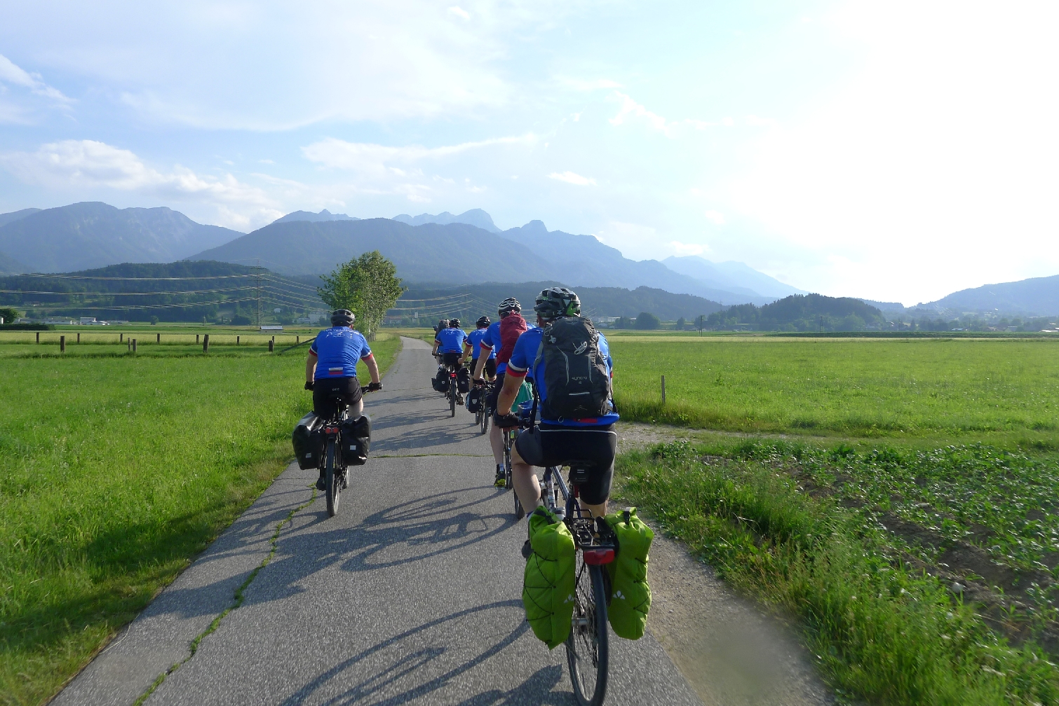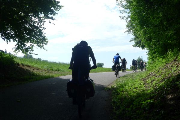 17:05 Uhr: scharfer Start der 1. Etappe. Wir rollen hinunter zur Drau und folgen dem Drauradweg. Es geht meist auf einem Dammweg nahe am Wasser entlang, wir haben die Sonne im Rücken und immer wieder Ausblicke auf das türkisgrüne Wasser der Drau.