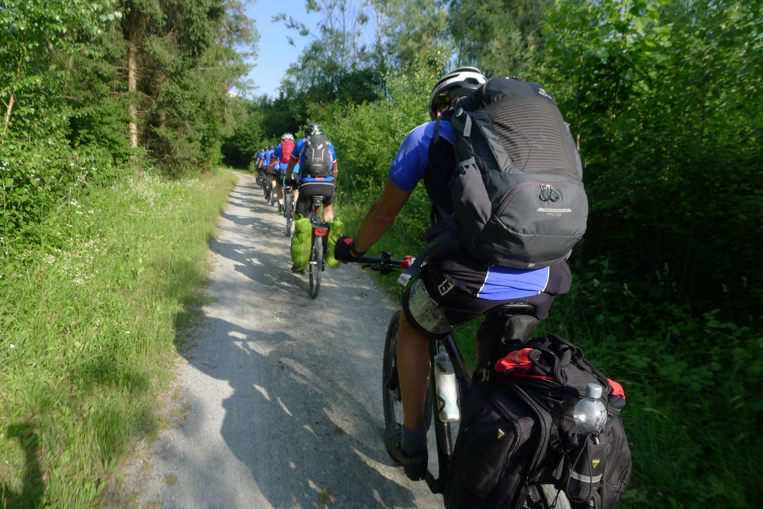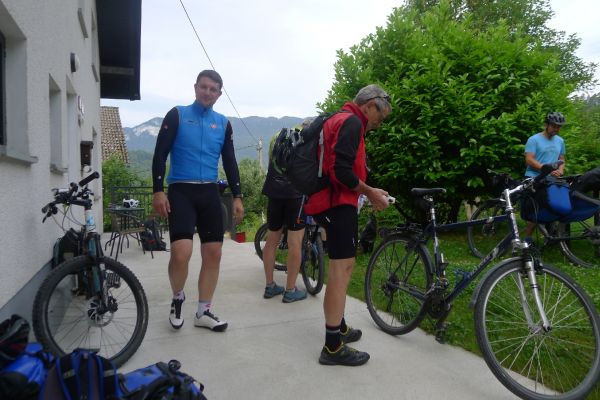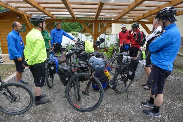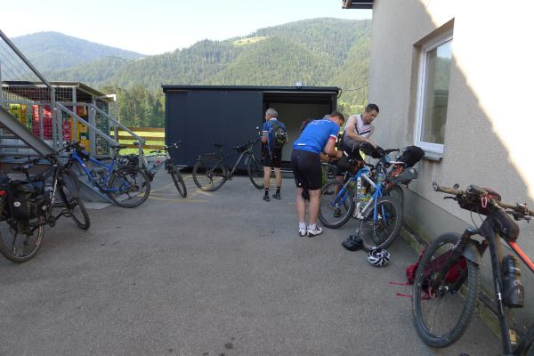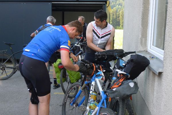 7:45 Uhr: wir beladen die Räder für die letzten Etappe. Armin fuddelt an seinen Packtaschen rum und seine beiden „Zivis“ müssen ihm zu Hilfe kommen, damit wir endlich los können
