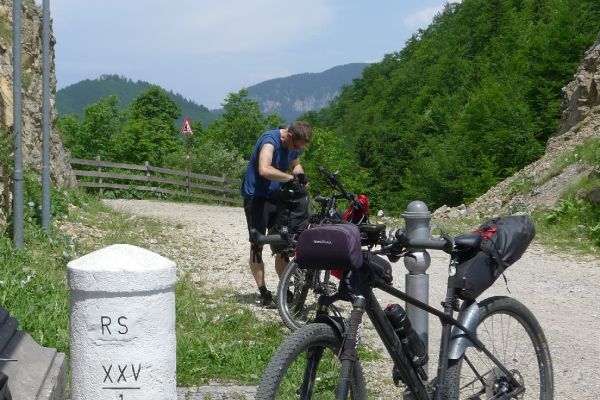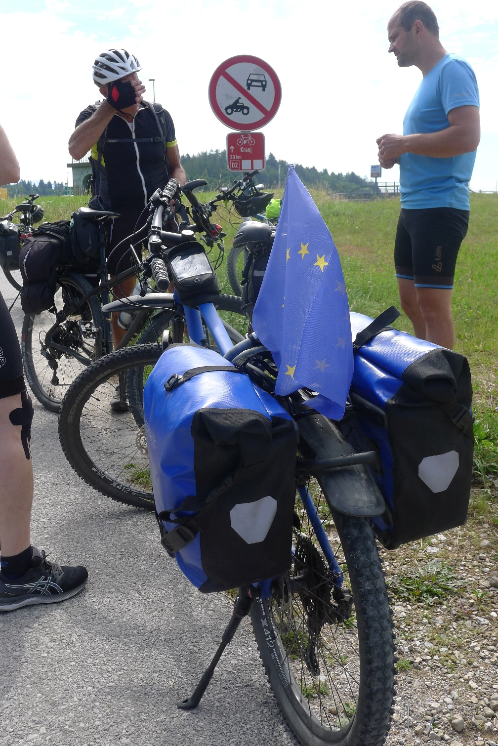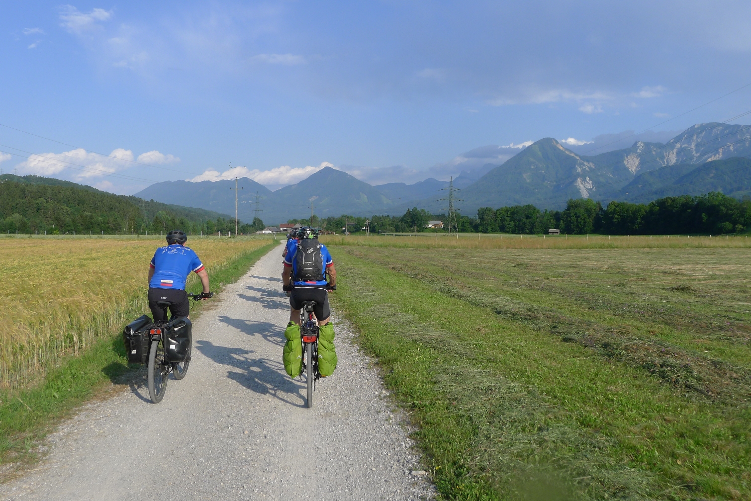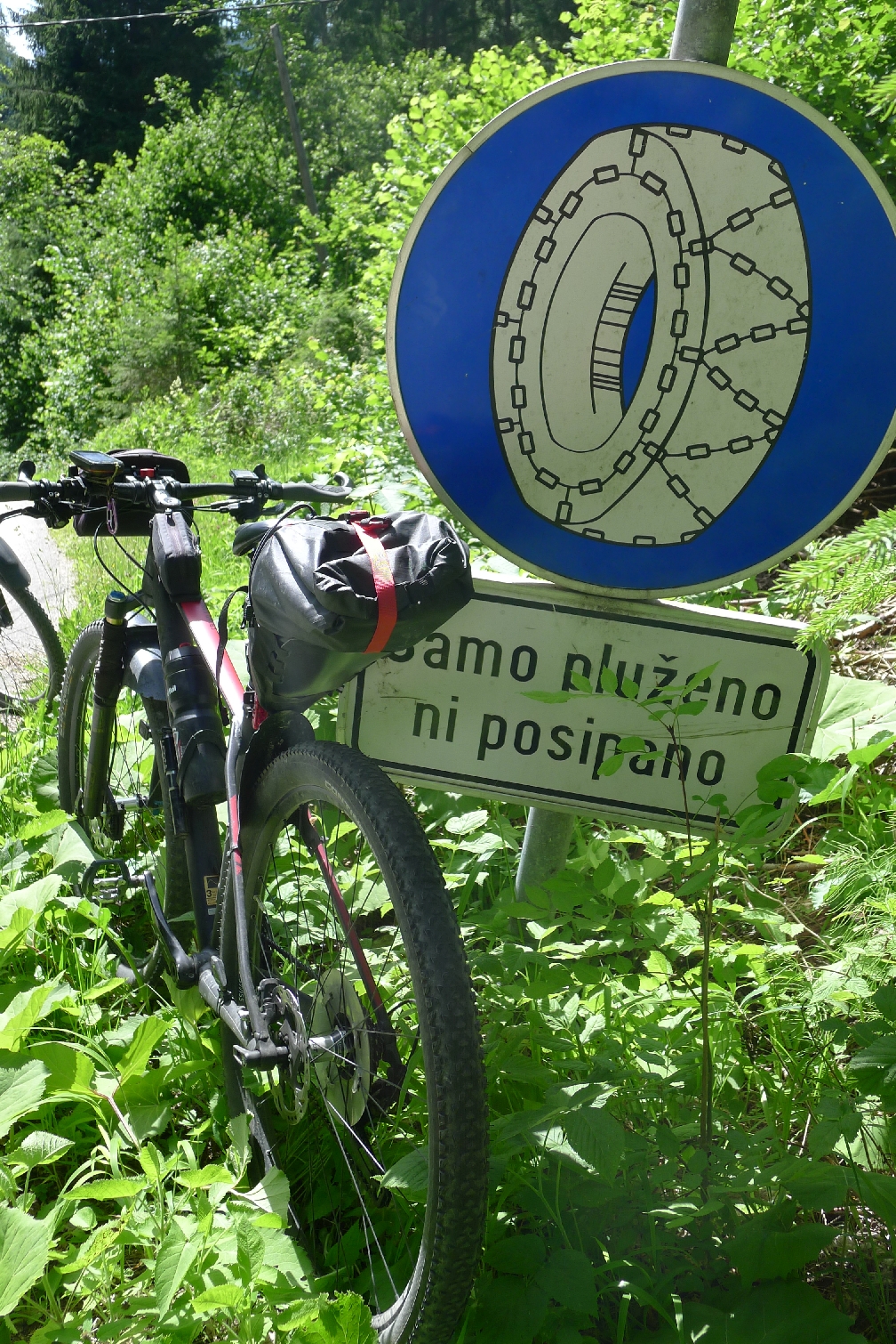 11:30 Uhr: weiter geht’s. Armin hadert immer noch mit seinem Gepäckträger und beschließt neue Taschen kaufen zu wollen. Ein Sportgeschäft direkt an der Strecke hatte aber nicht das gewünschte Equipment und verweist uns auf ein Geschäft nahe Kranj/Krainburg.