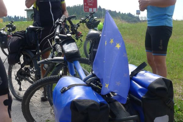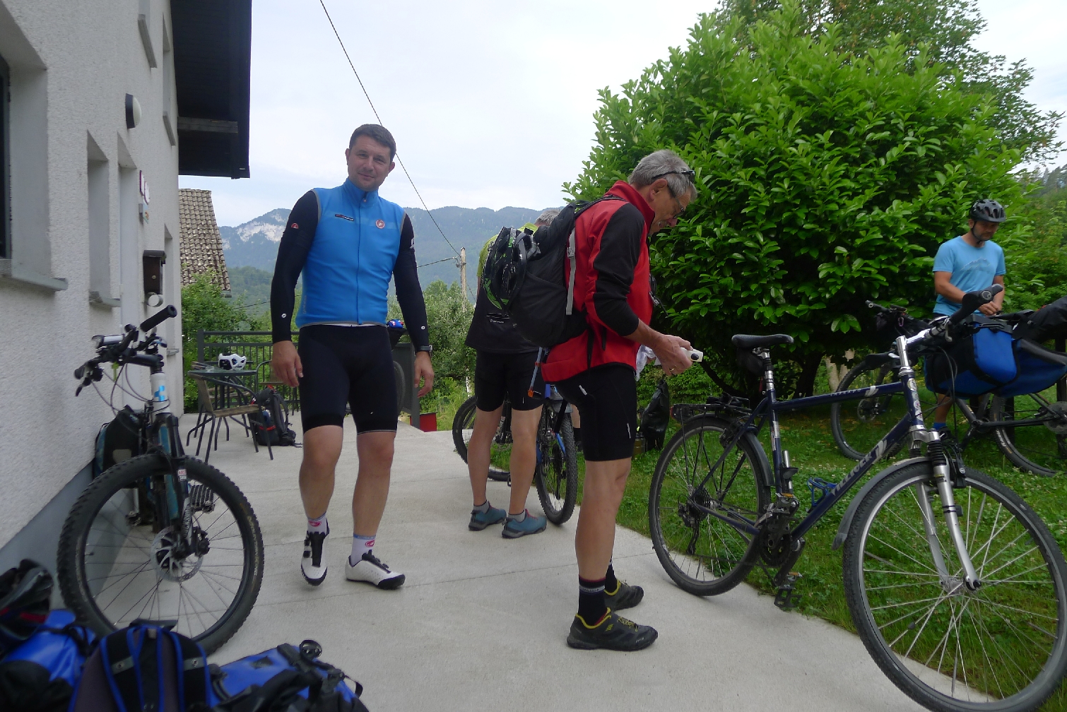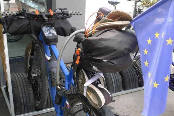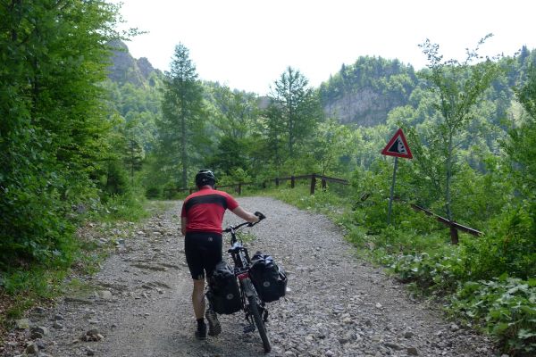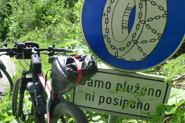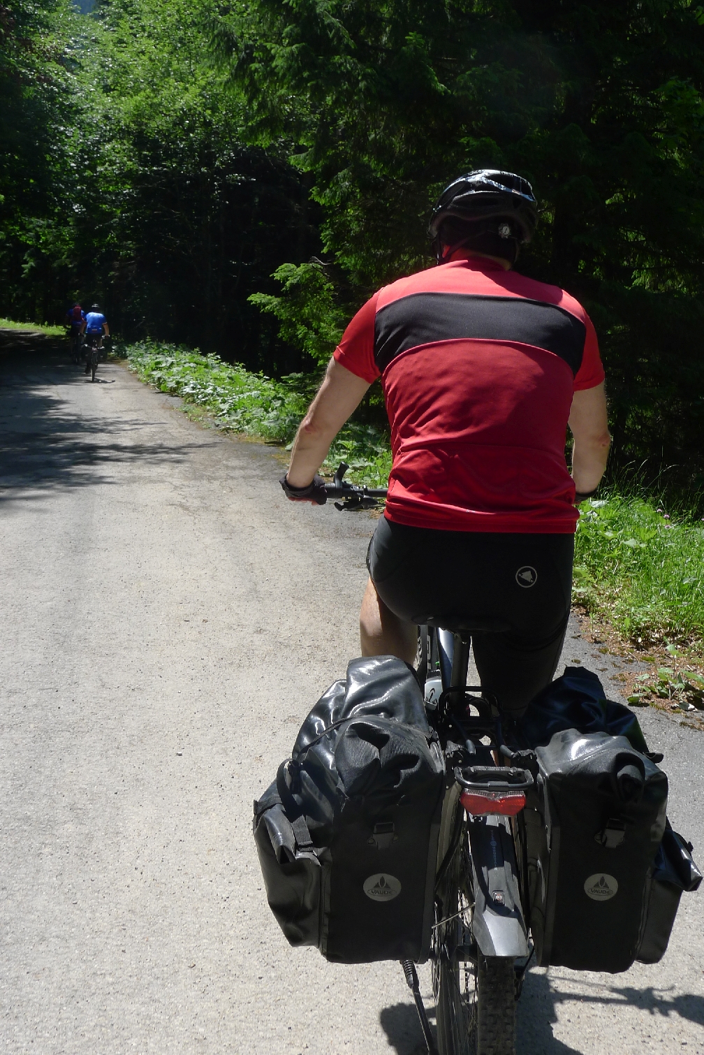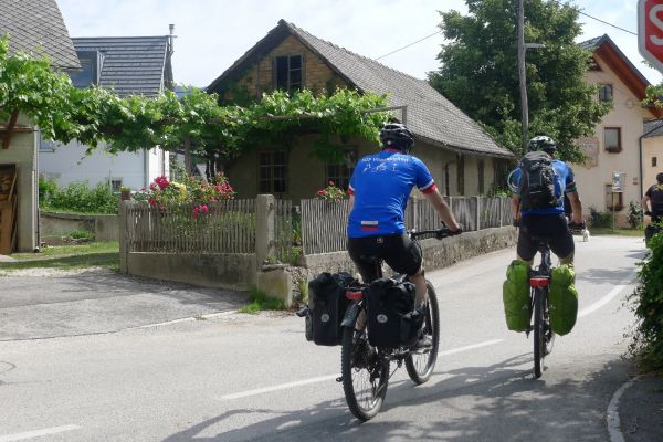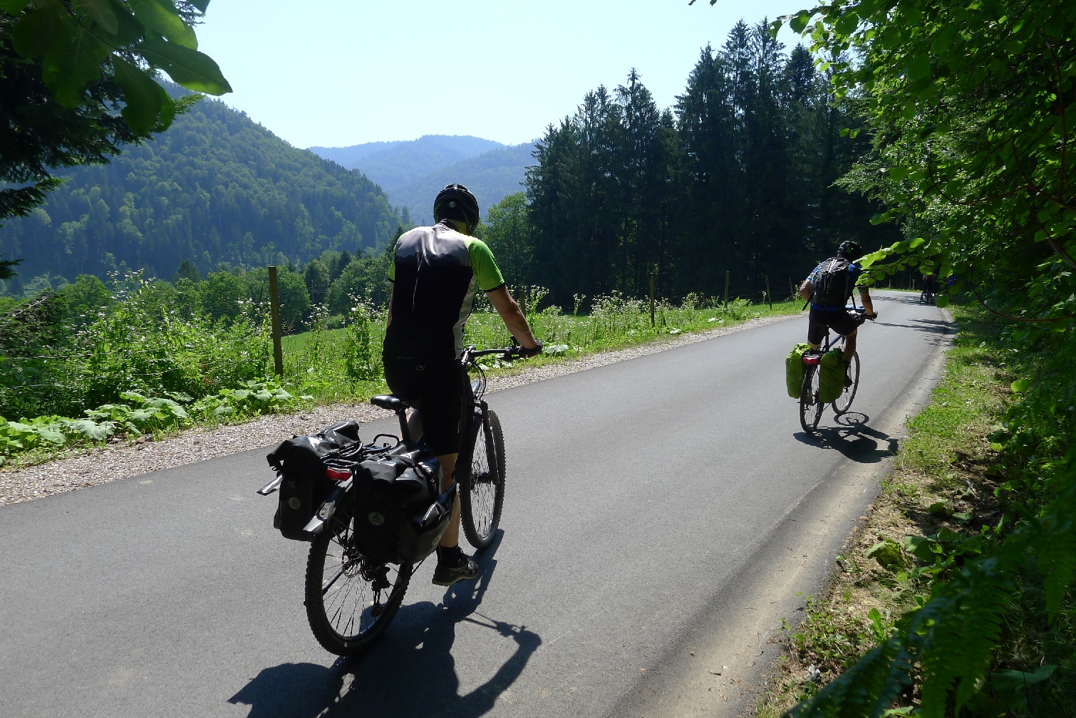 11:30 Uhr: weiter geht’s. Armin hadert immer noch mit seinem Gepäckträger und beschließt neue Taschen kaufen zu wollen. Ein Sportgeschäft direkt an der Strecke hatte aber nicht das gewünschte Equipment und verweist uns auf ein Geschäft nahe Kranj/Krainburg.