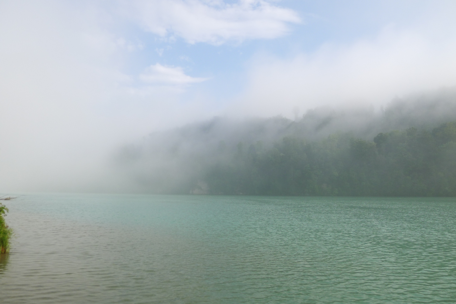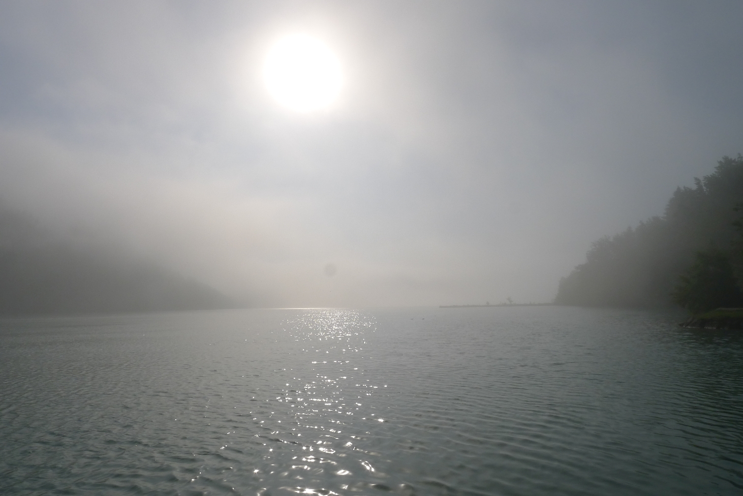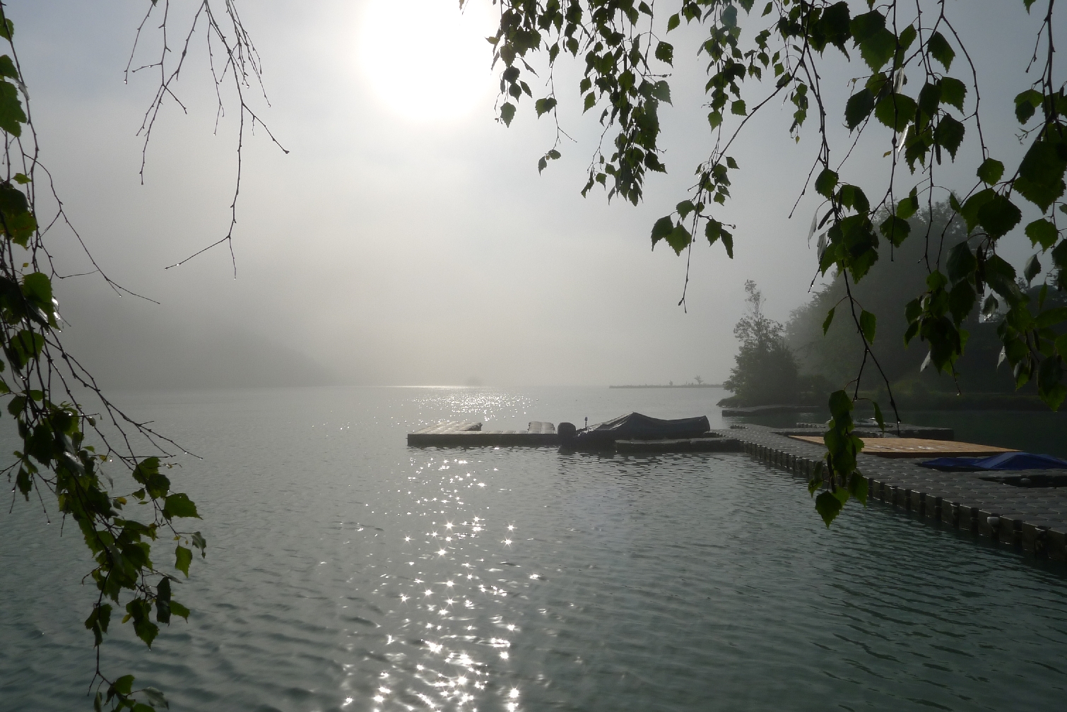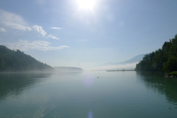 7:52 Uhr: In der Nacht hat es auch nochmal kräftig gewittert und zum Frühstück liegt ein Morgennebel über der Drau. Pünktlich zum Start verschafft sich die Sonne aber Luft und vertreibt die letzten Nebelschwaden.