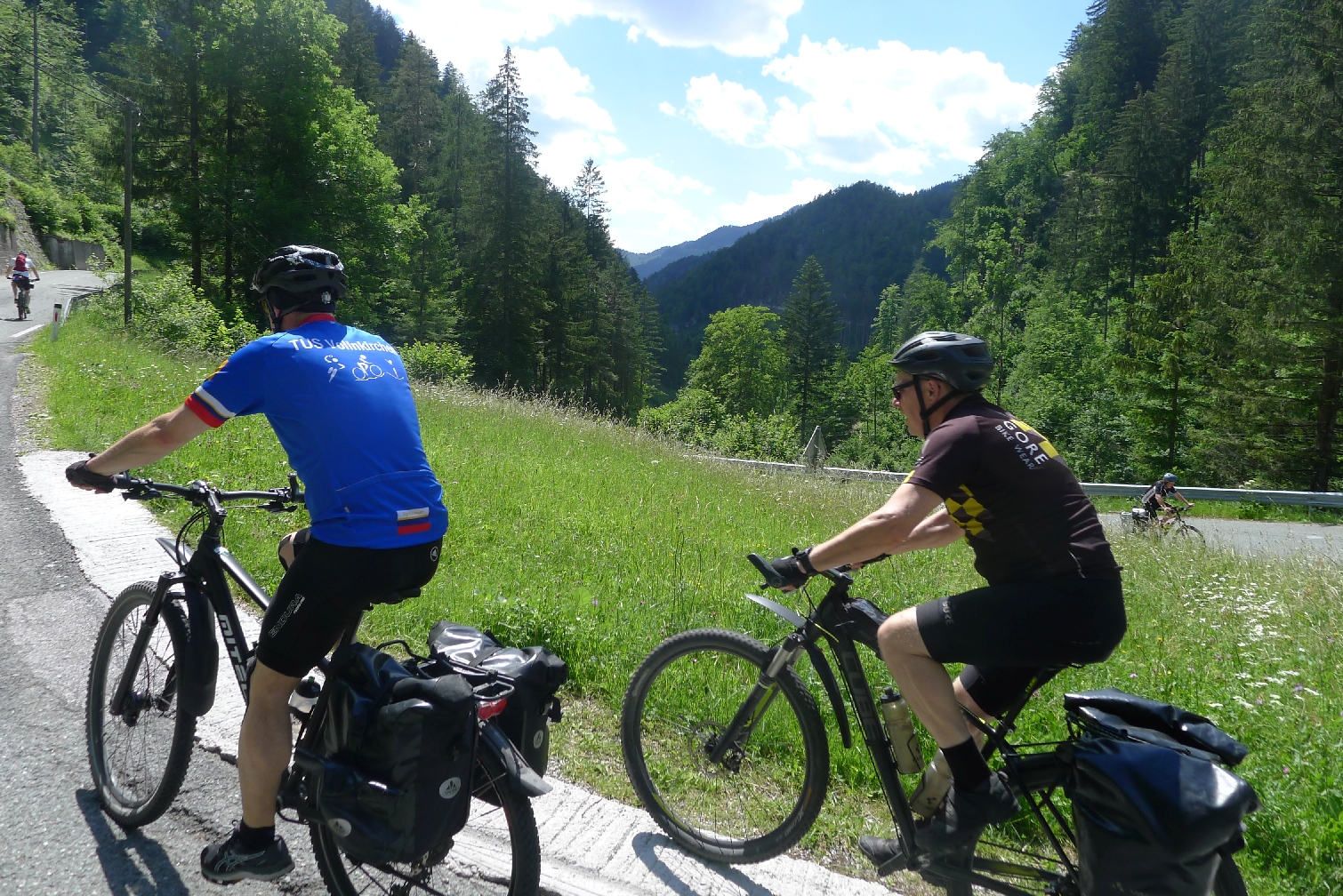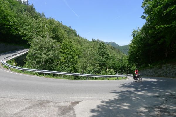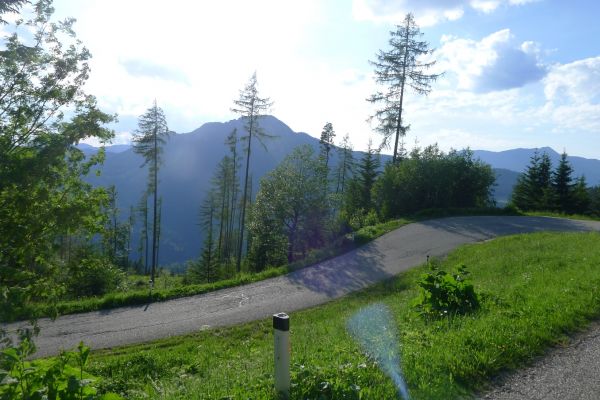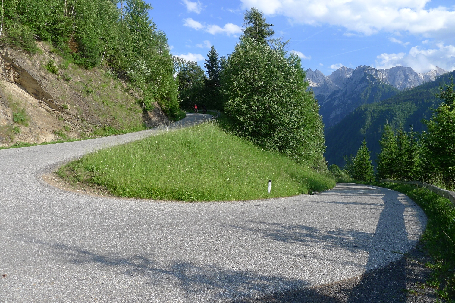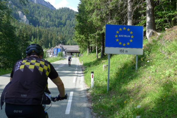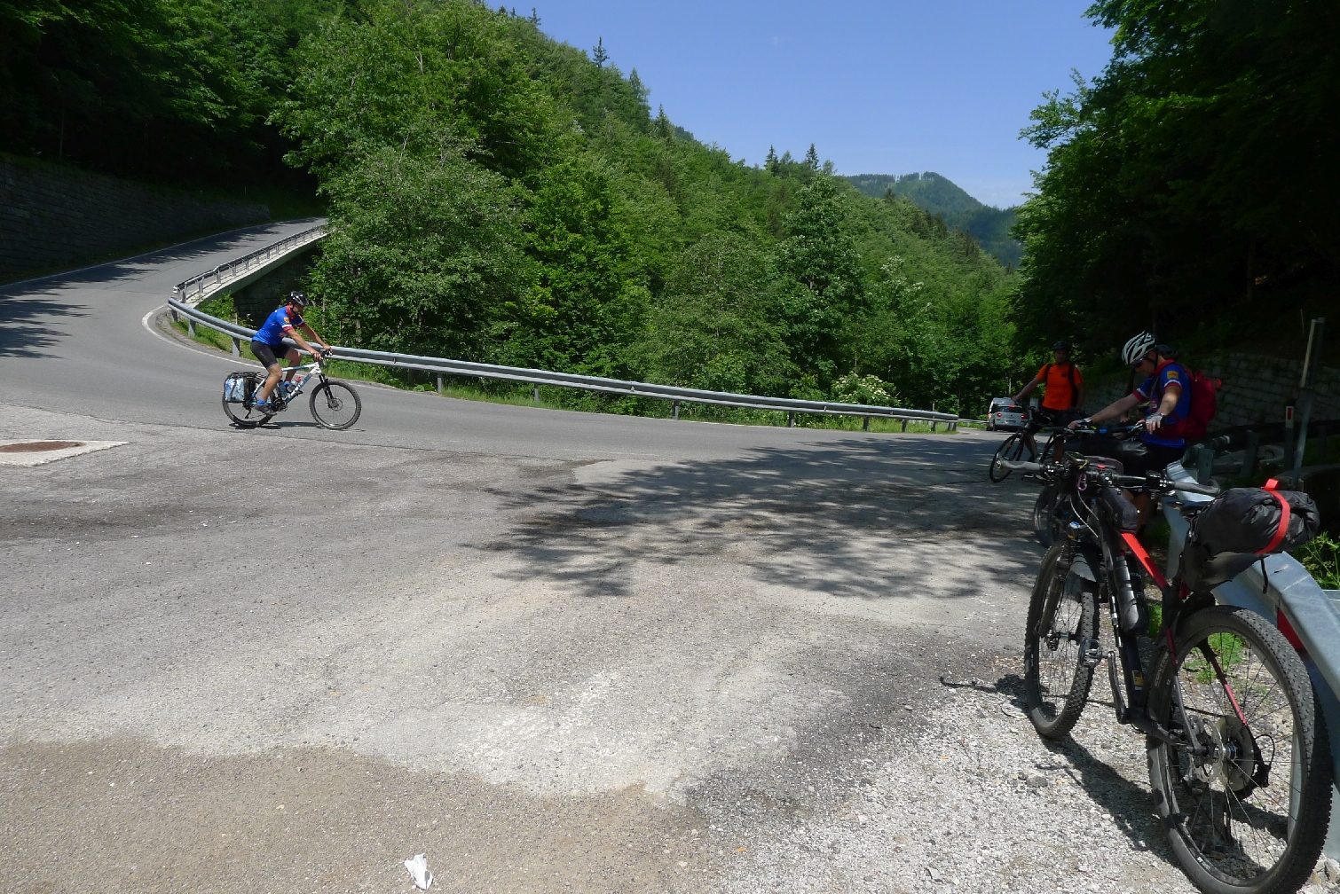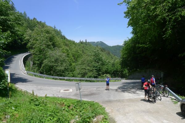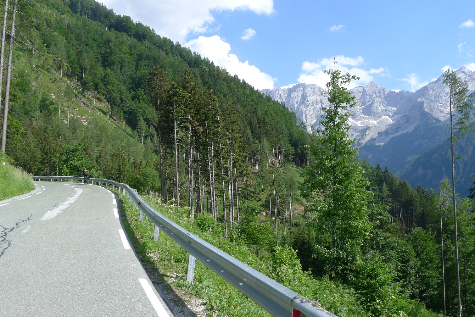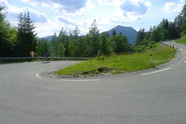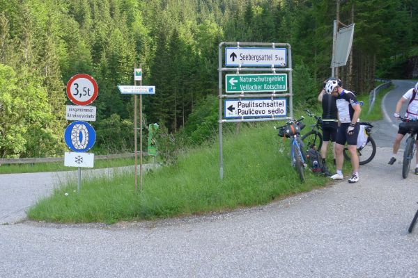 16:15 Uhr: weiter geht’s, die letzten 22 Kilometer stehen an. Zuerst der etwa 5km lange Anstieg zum Seebergsattel. Kurz hinter Zgornje Jezersko beginnen die Serpentinen, die uns in gemäßigten 6-8% Steigung zur Passhöhe bringen. Alles im schnellen Polkatakt zu Slavko Avensik aus Bernies Musikbox fahrbar, ein Genuss.