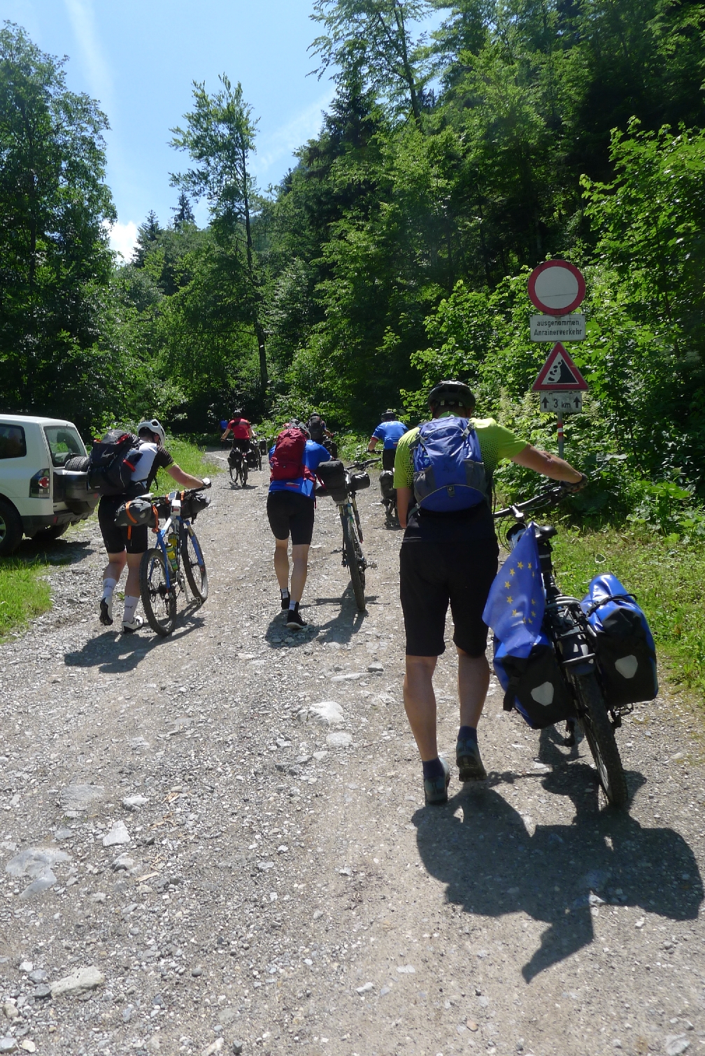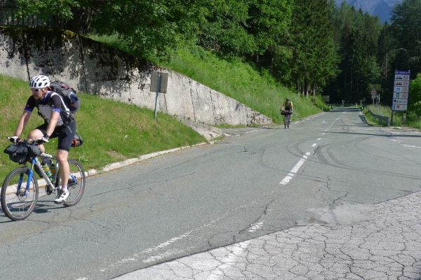 12:19 Uhr: weiter geht´s. Vor uns liegt eine 3,5km lange Schotterpiste, die es in sich hat. Etwa 350 Höhenmeter mit 12,3% Steigung im Schnitt müssen wir bis zur Paßhöhe überwinden. Nicht nur der Untergrund, auch steile Rampen mit bis zu 17% machen die Auffahrt zur Paßhöhe zu einer echten Herausforderung. Gleich zu Beginn gibt es eine 16%iges Steilstück zu überwinden. Einige entscheiden sich gleich fürs Schieben, ein paar wenige bleiben auf dem Rad und strampeln die Schotterpiste komplett nach oben.