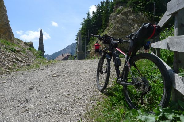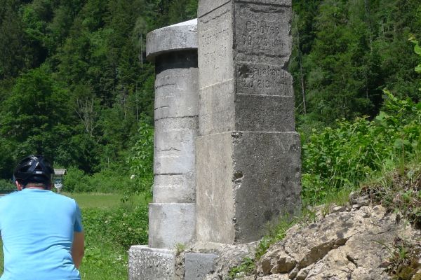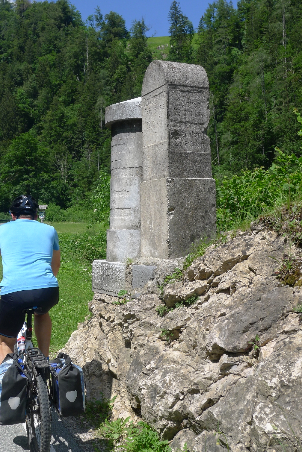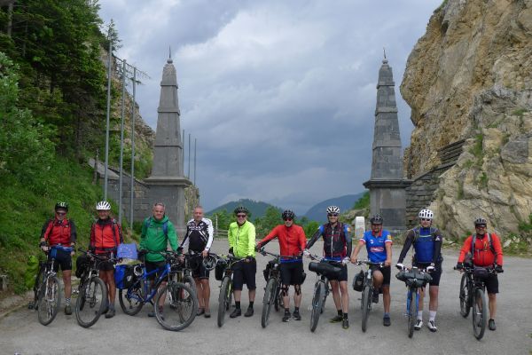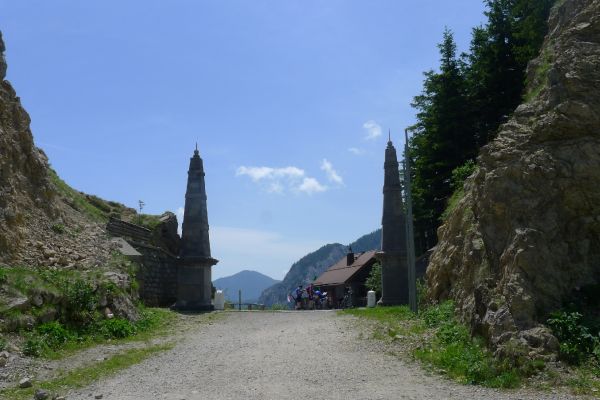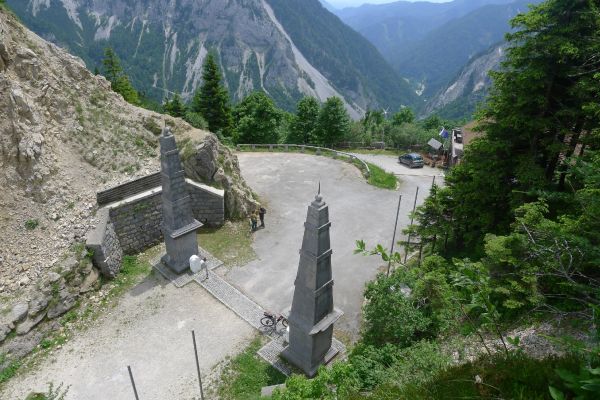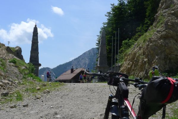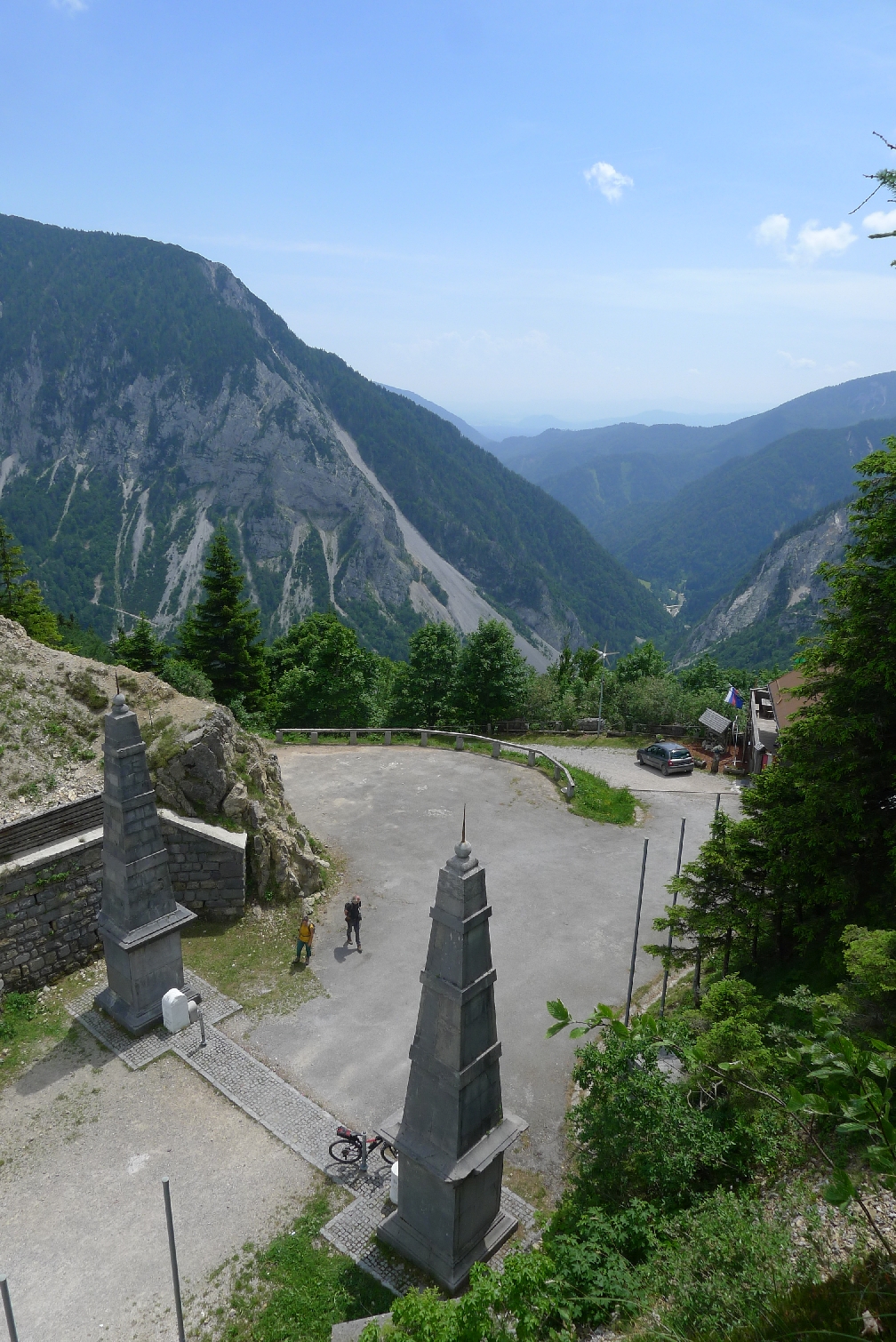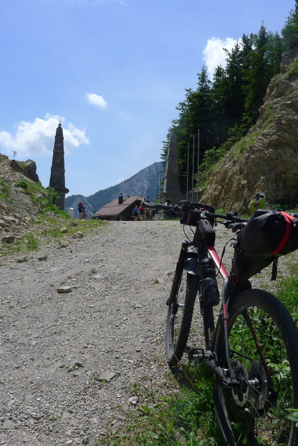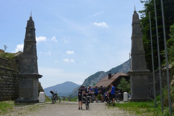 13:08 Uhr: Die Obelisken auf der Passhöhe (1367m) kommen in Sicht. Noch 50m mit 18% und ich bin oben. Thomas, Timo und Steff sind schon da.