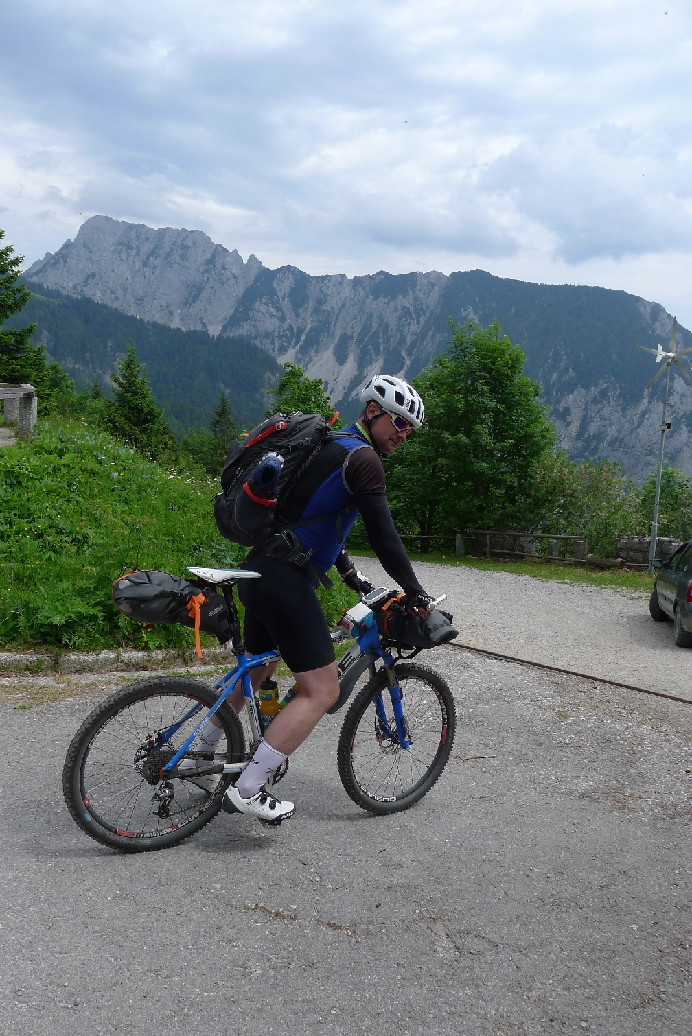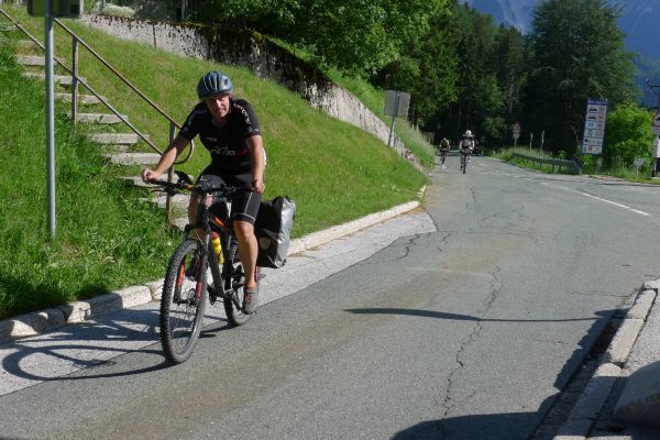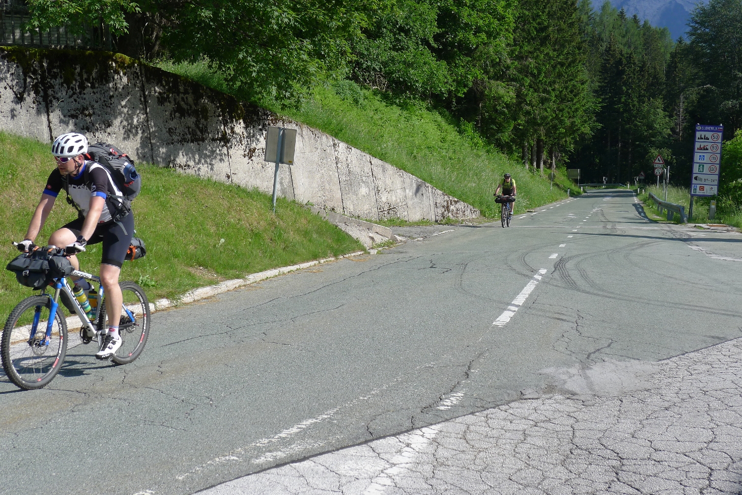 18:45 Uhr: die Spitzengruppe aus Thomas, Steff, Andi und mir erreichen den höchsten Punkt. Der Aufstieg hätte auch keinen Kilometer länger sein dürfen, das Laktat wäre uns sonst aus den Ohren gelaufen. Bis zum Paulitschsattel muss noch ein Berg umfahren werden. Es geht aber erstmal ein gutes Stück bergab und mit dem Schwung aus der Abfahrt gehen wir in den kurzen Gegenanstieg zur eigentlichen Passhöhe.