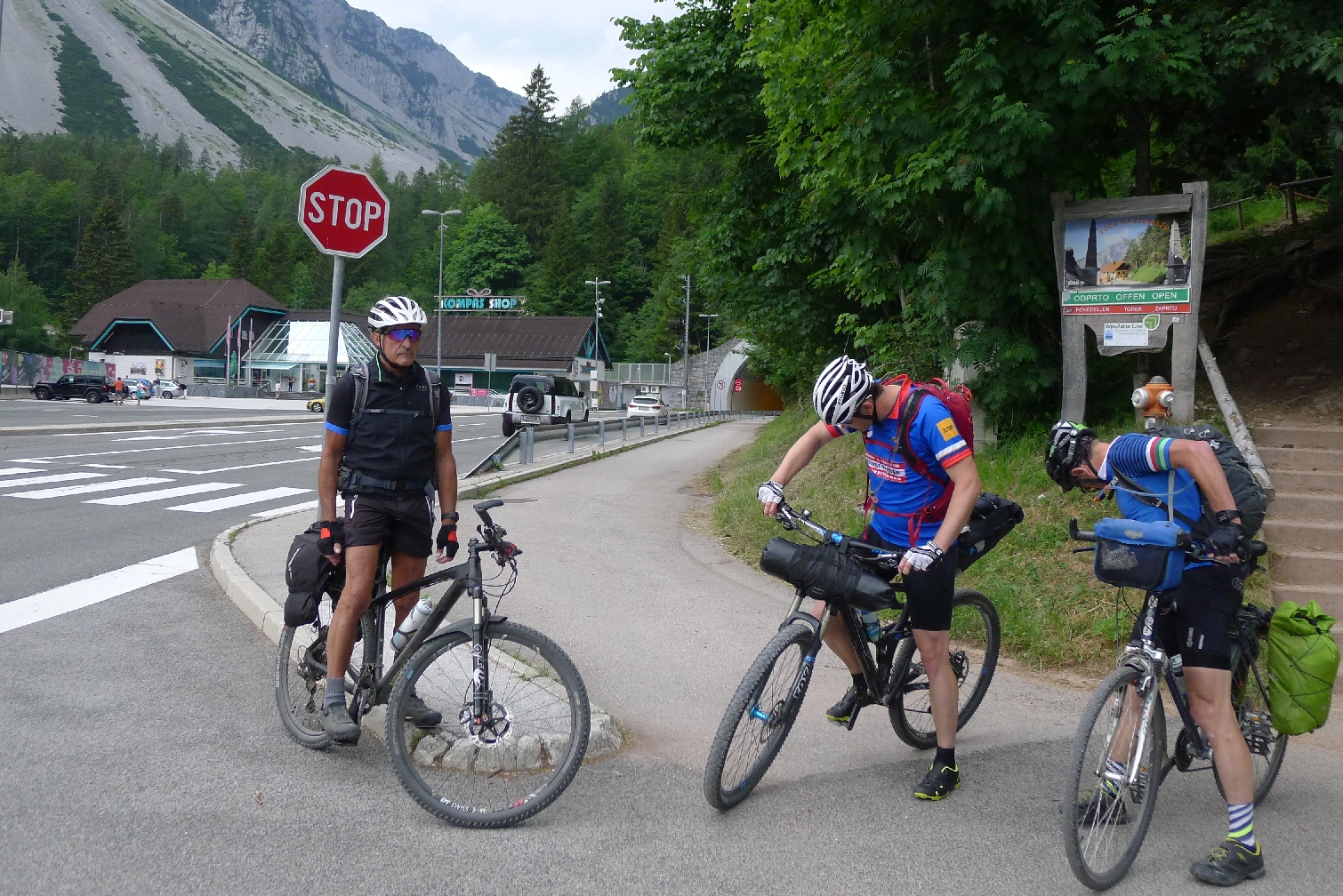14:34 Uhr: wenige Kilometer später haben wir die steile Schotterpiste bergab gemeistert und stehen wieder auf der Landstrasse vor dem südlichen Tunnelportal. Wir setzen die Abfahrt hinunter nach Tržič/Neumarkt fort. Das Wetter ist schwülwarm und wir befürchten, dass es noch ein Gewitter geben könnte.
