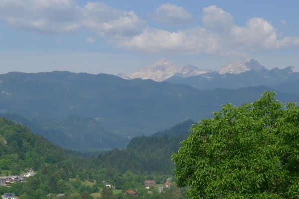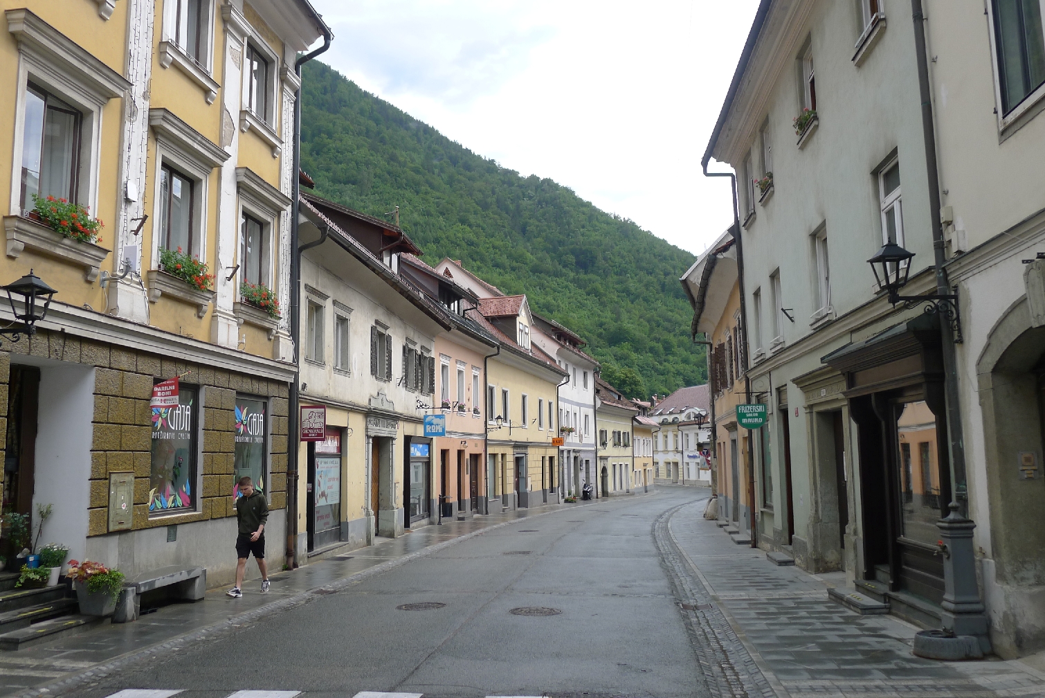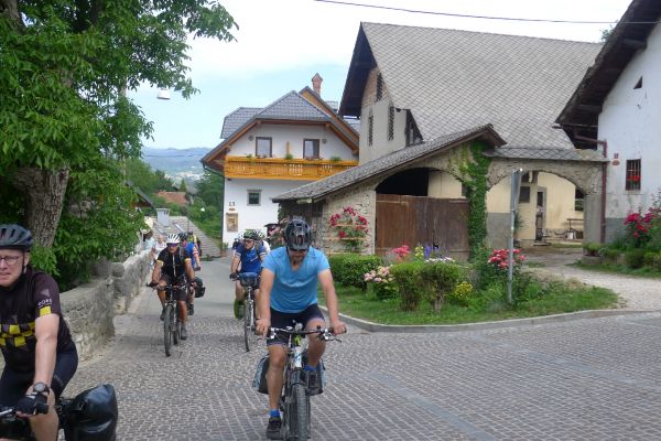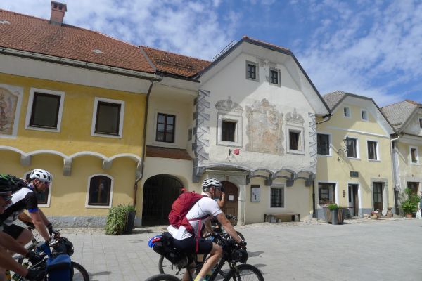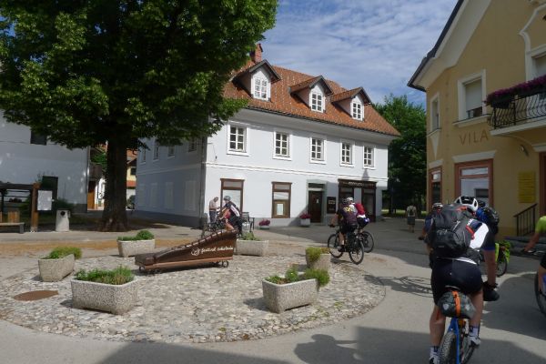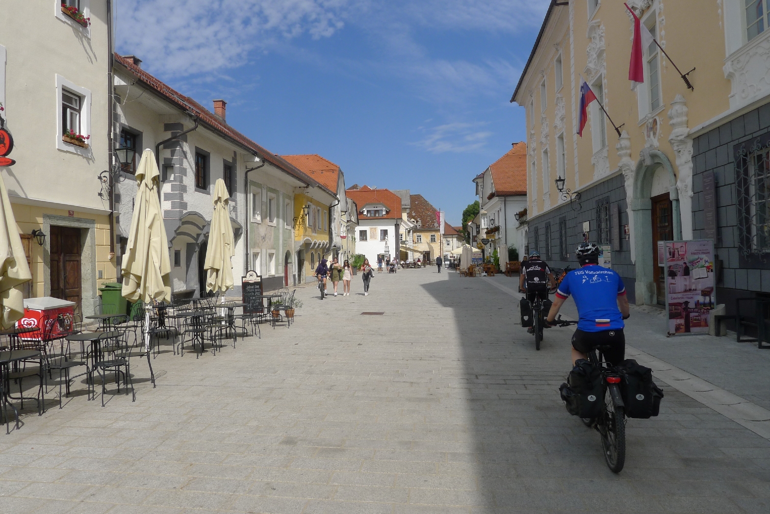 9:49 Uhr: Nach einem ersten längeren Anstieg erreichen wir Radovljica/Radmannsdorf. Von einer Terrasse reicht der Blick über das Tal bis zu den Julischen Alpen mit dem markanten Triglav. Der Ort selbst kann mit pittoresken Häuserfassaden aufwarten.