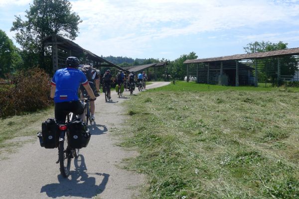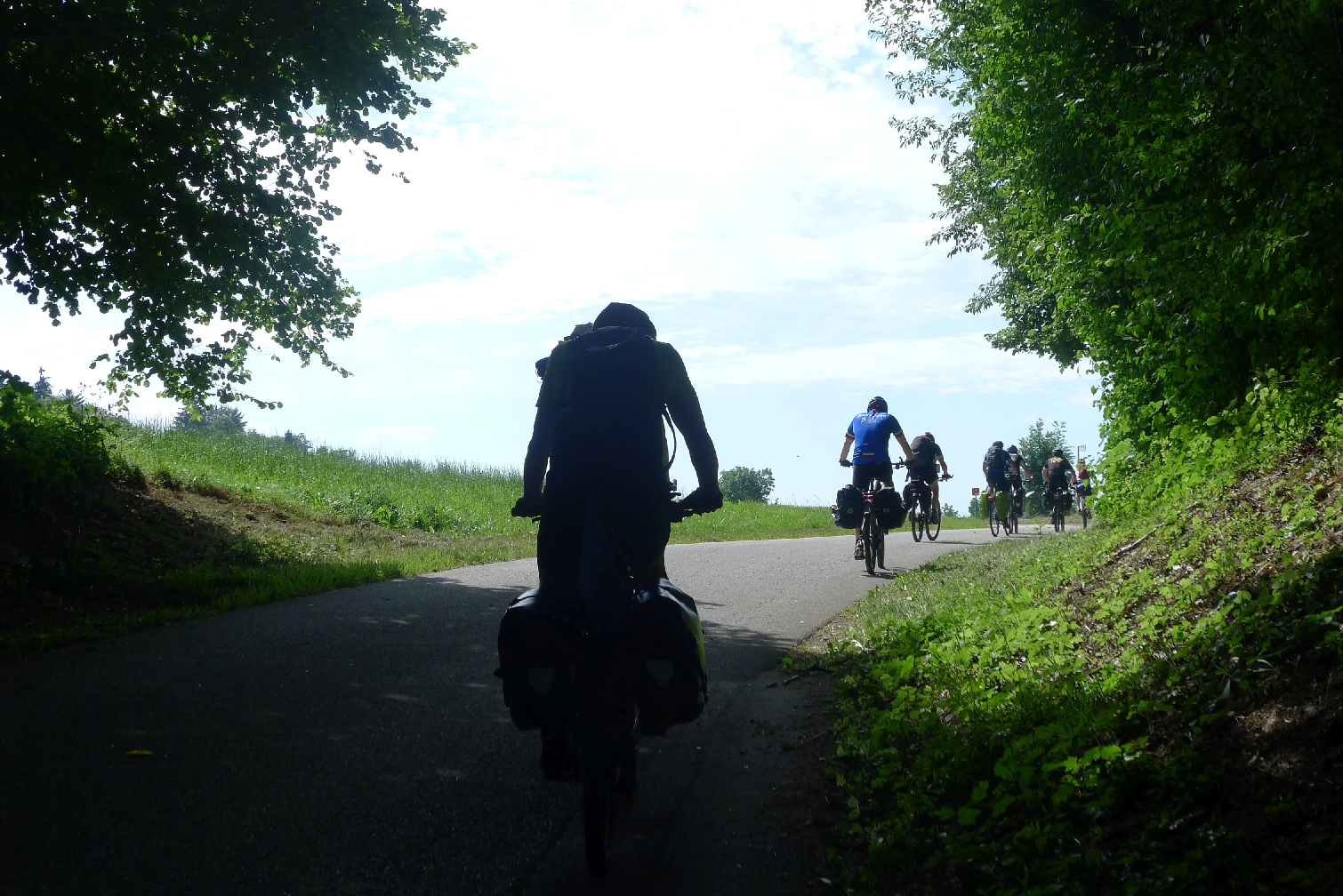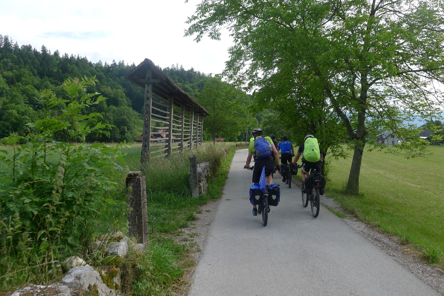 9:18 Uhr: vollgestopft mit Spiegeleiern, gebratenem Speck und Würstchen machen wir uns auf den Weg. In leichtem Auf und Ab geht es durch kleine Dörfer und am Flüsschen Save entlang.