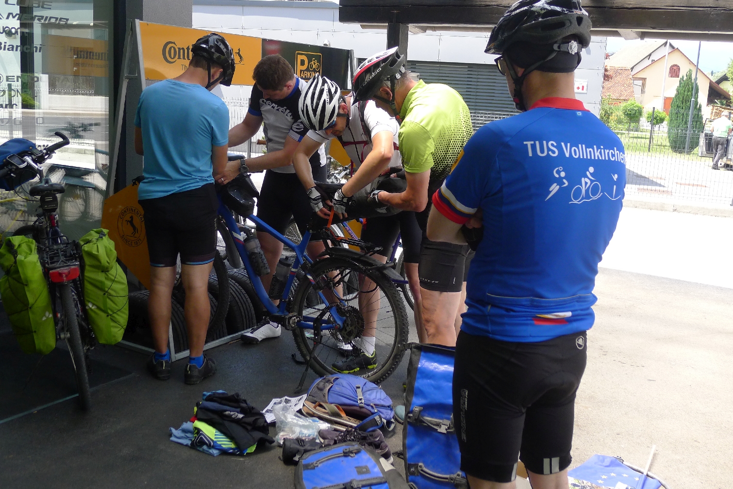 12:07 Uhr: wir zweigen von der geplanten Route ab und sind nach wenigen Kilometern an dem Sportgeschäft. Mit Hilfe seiner zwei „Zivis“ Lars und Timo bekommt Armin neue Lenker und Satteltaschen verpasst.