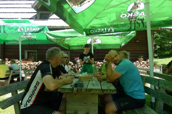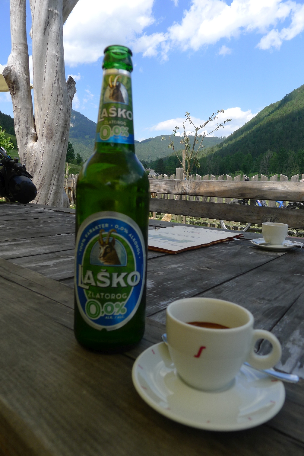13:36 Uhr: während Armin als letzter die Passhöhe erreicht sitzen wir schon auf der Sonnenterrasse einer Berghütte und laben uns an einer kalten Flasche Lažko 0,0%. Krainer Wurst, Apfelstrudel und türkischer Kaffee runden das gastronomische Angebot ab.