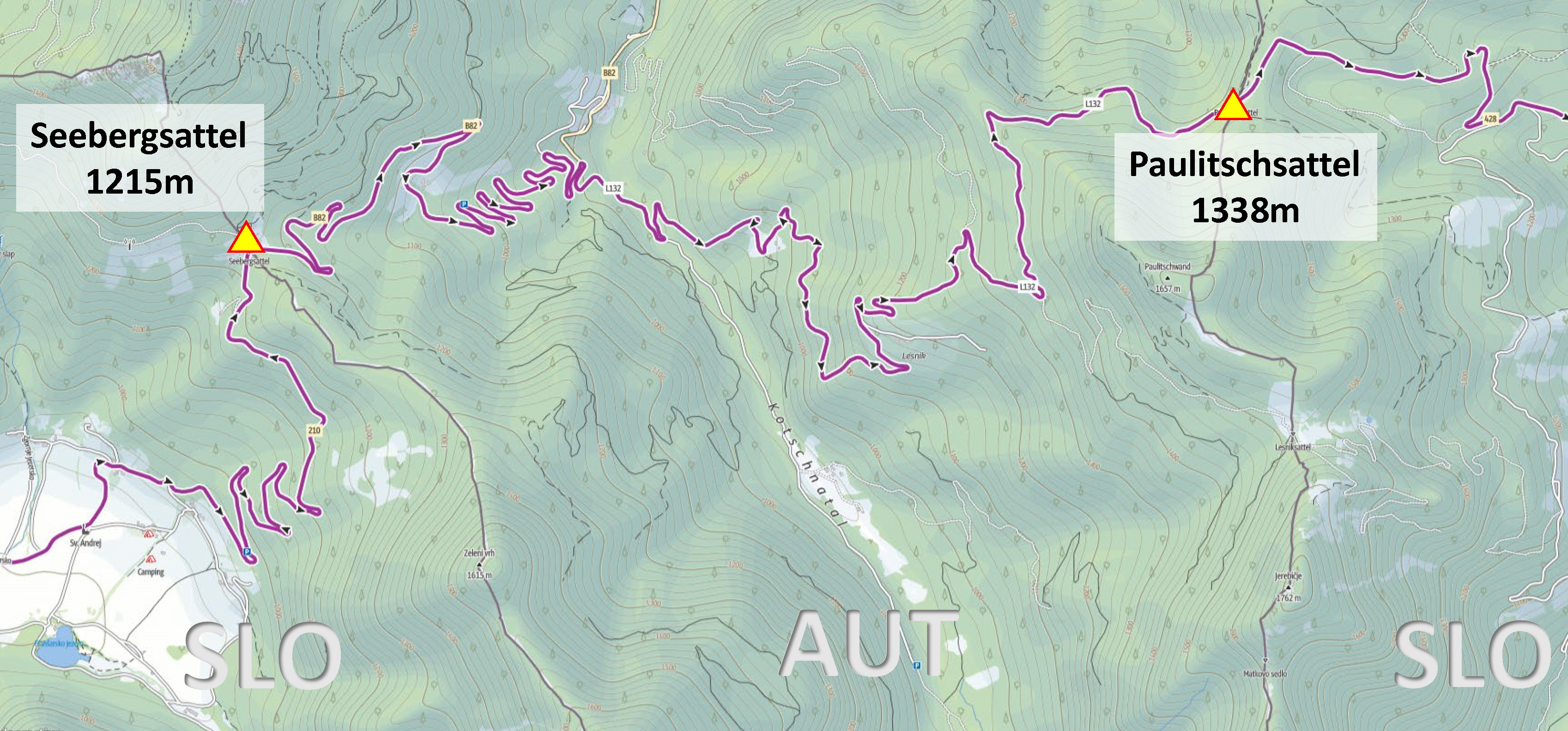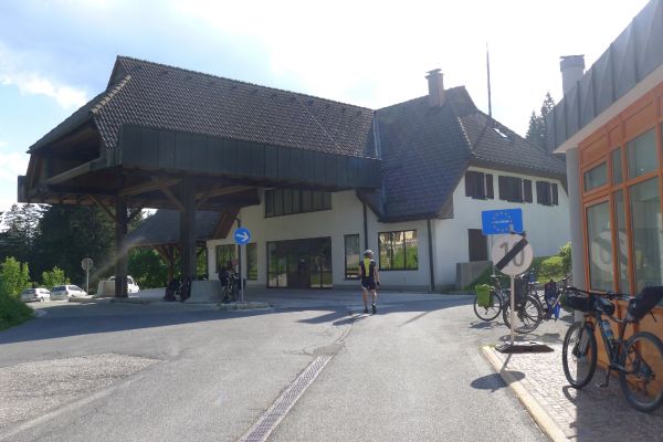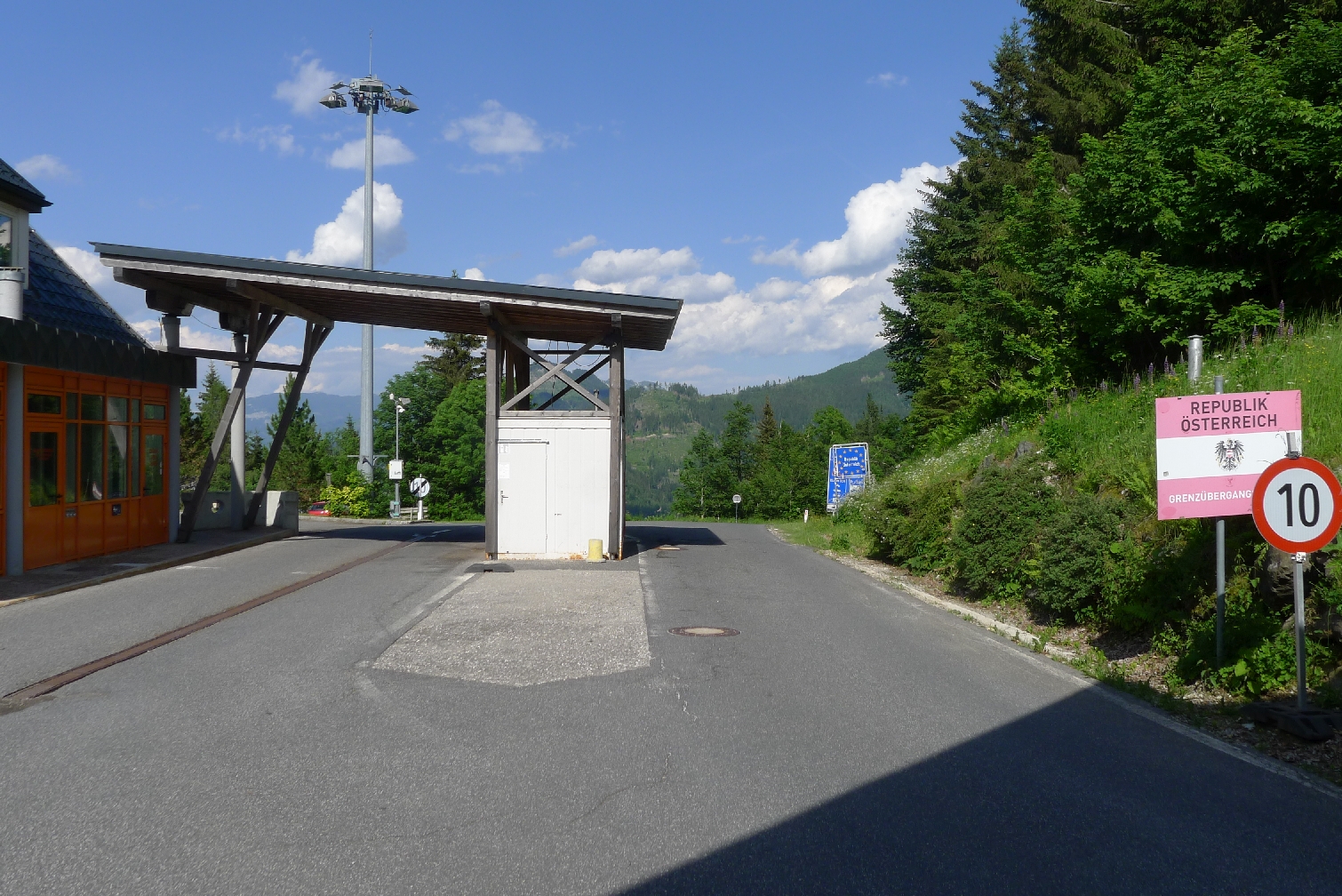 16:49 Ihr: Ankunft auf dem Seebergsattel (1218m), der Grenze zwischen der Region Oberkrain/ Gorenjska in Slowenien und Kärnten in Österreich. Die ehemaligen Grenzhäuschen wirken wie aus einer anderen Zeit.