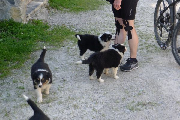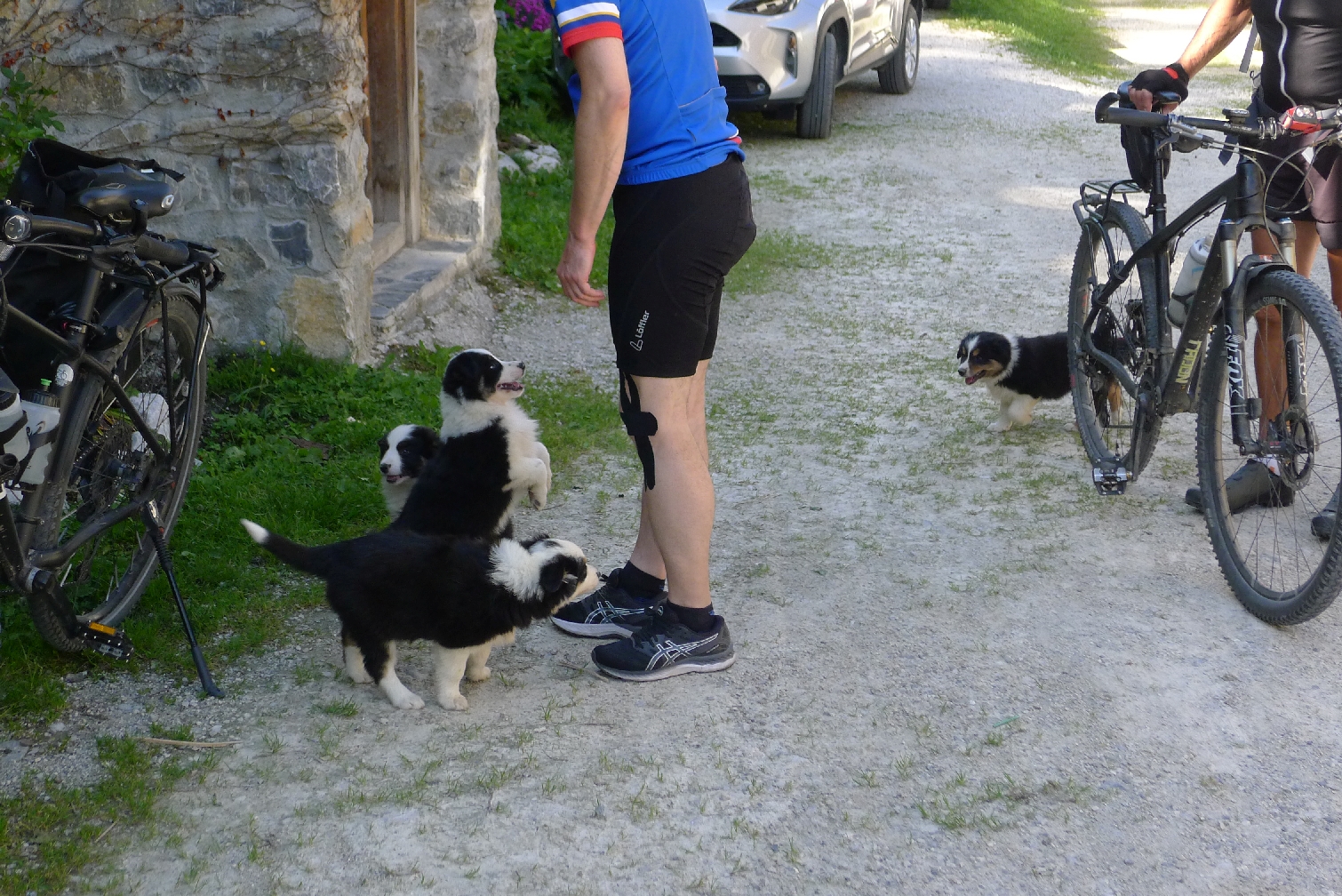 16:44 Uhr: wir satteln wieder auf, als eine Rasselband Hundewelpen auf uns zustürmt. Insbesondere an Andi bzw. seinen salzig schmeckenden Waden finde die grossen Gefallen. Zwei der Gesellen laufen mehrere hundert Meter neben uns her, als wir den Aufstieg mit dem Rad weiter fortsetzen. Den letzten können wir erst nach gutem Zureden und durch Versperren des Weges zur Umkehr bewegen.