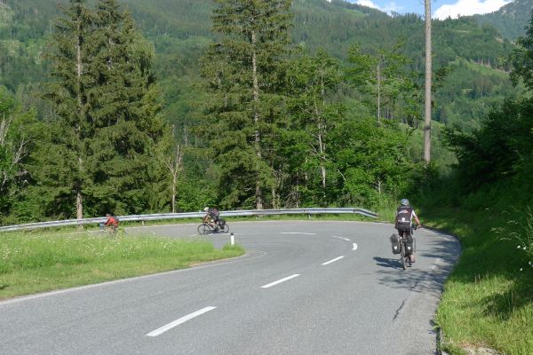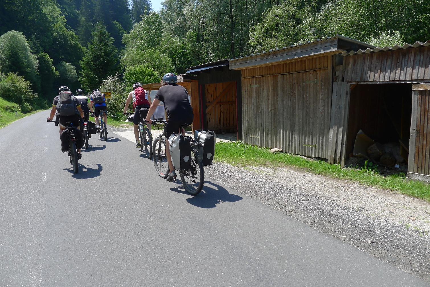 11:05 Uhr: wir fahren wieder los. Eine lange Abfahrt ins Tal steht bevor. Die ersten 6km steil und auf Schotter, die folgenden 8km etwas flacher mit 2-3% Gefälle durch ein enges bewaldetes Tal mit einigen kleinen Weilern.