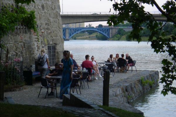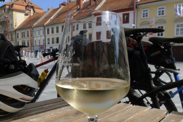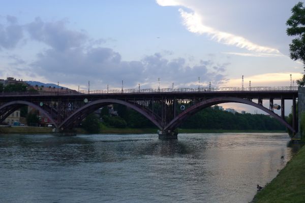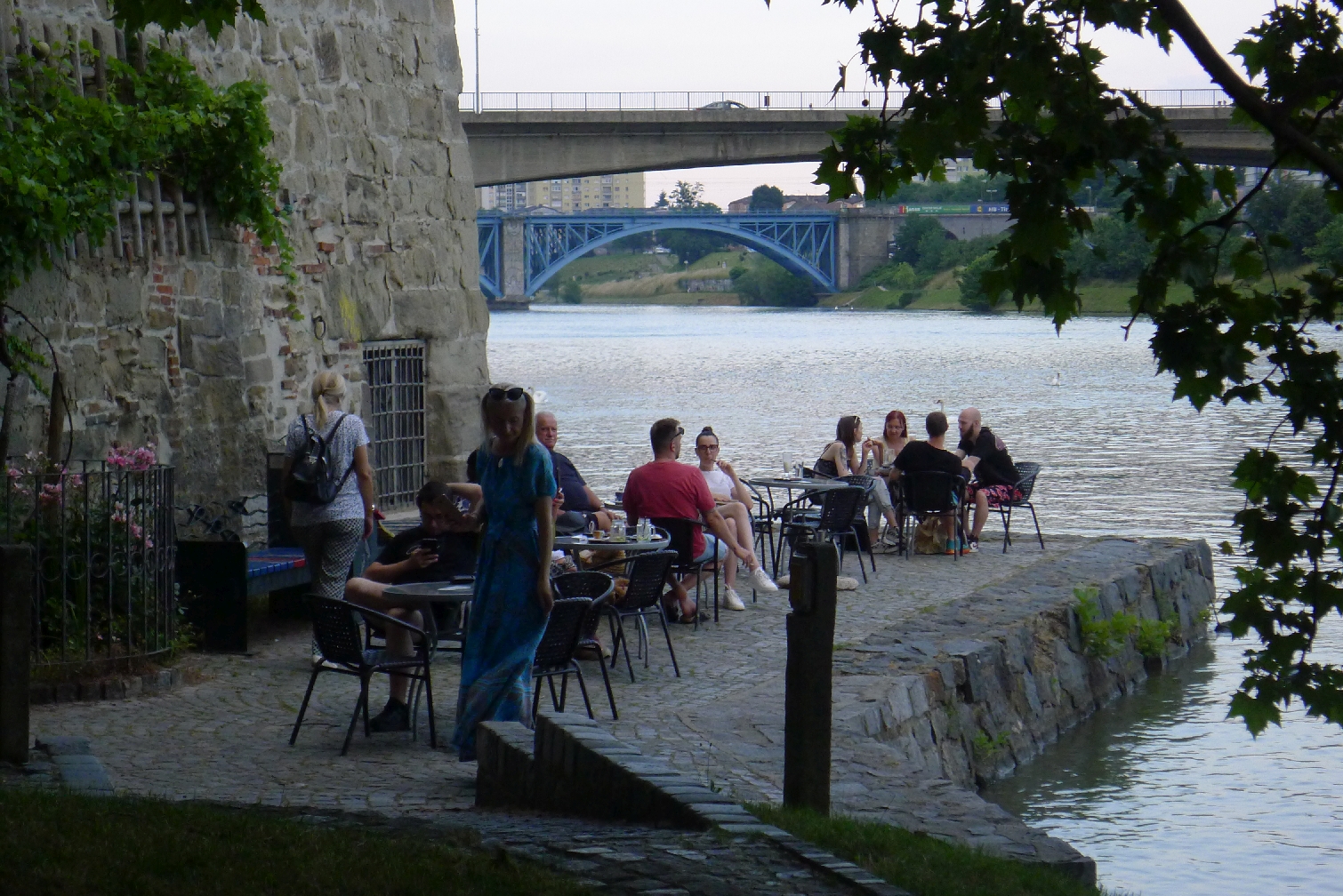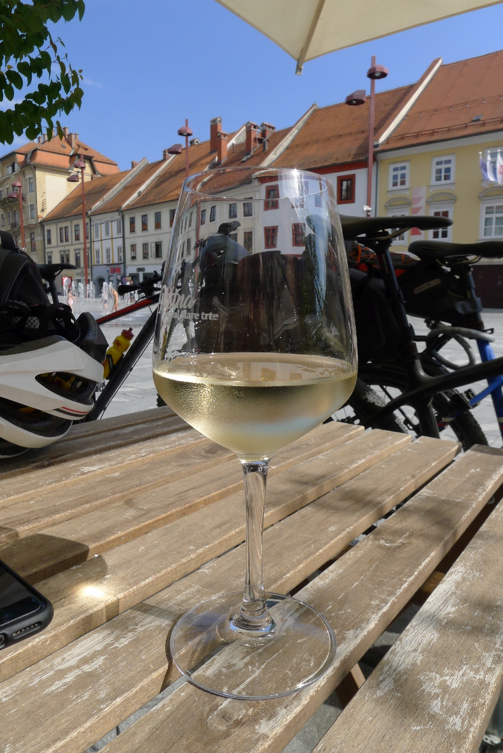 17:15 Uhr: wir ziehen weiter, Lars hat die beste Eisdiele der Stadt ausfindig gemacht. Nachdem eine grosse Portion verputzt ist, fahren wir wieder hinunter zur Drau. Vorbei am Haus mit der ältesten Weinrebe der Welt, der alten Eisenbrücke Stari Most und einem weiteren Wehrturm Vodni stolp nähern wir uns dem Hotel.