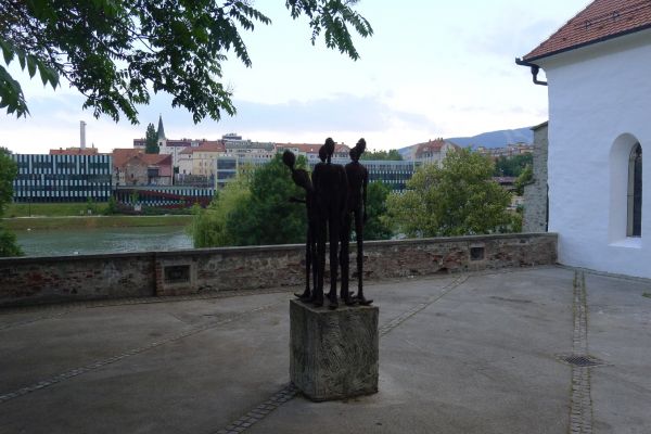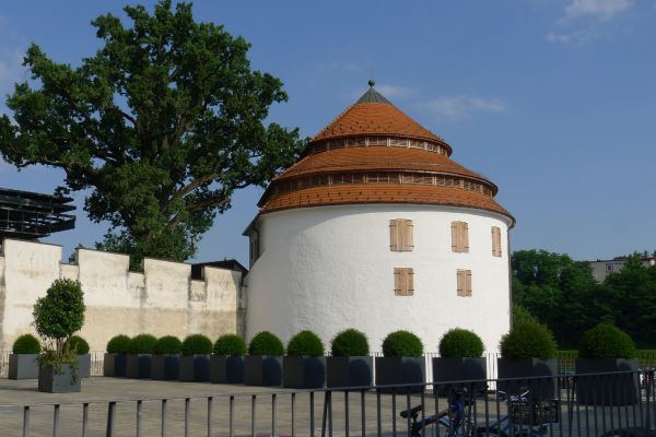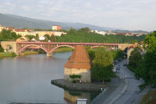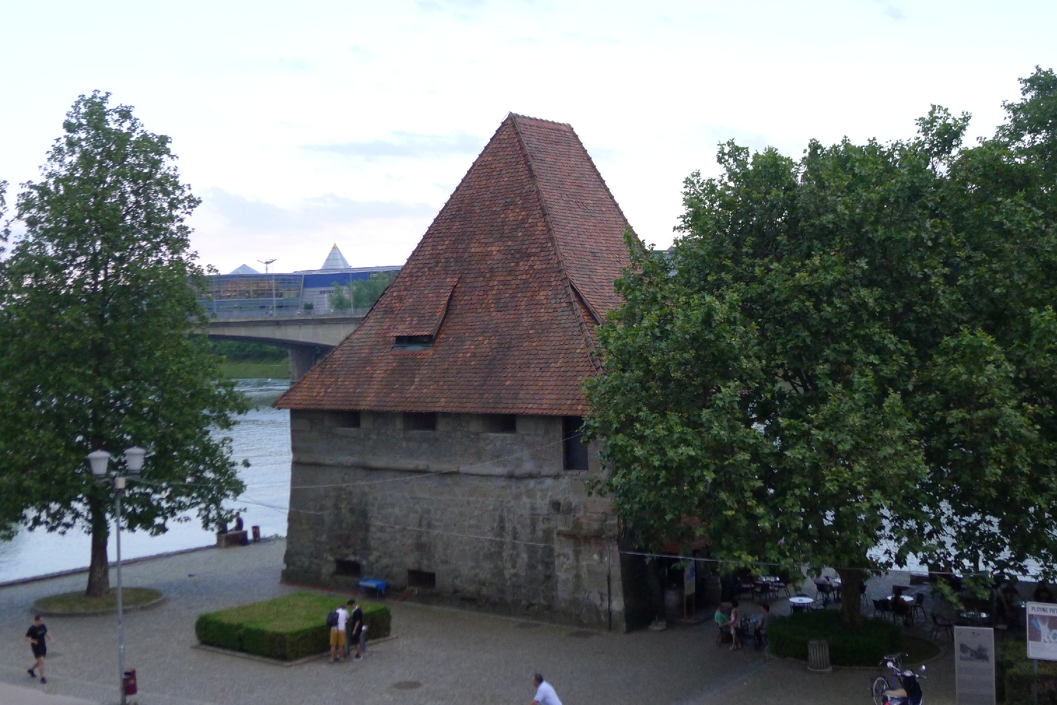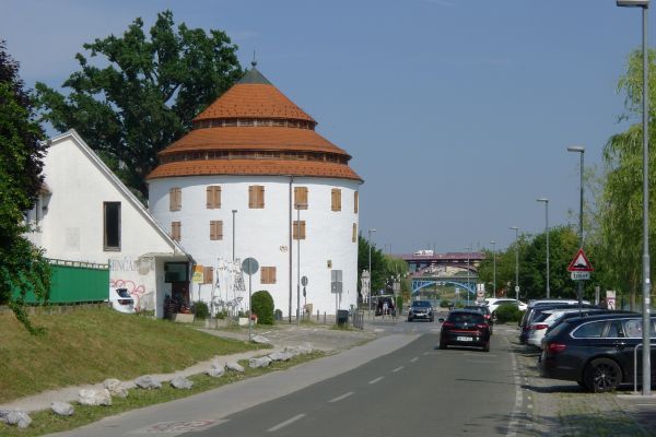 16:08 Uhr: Maribor ist in Sicht und wir überqueren die Drau über eine Brücke. Nach wenigen hundert Metern kommt der Sodni Stolp, ein mächtiger, runder mittelalterlicher Wehrturm in Sicht. Hier zweigen wir auf eine kleine Schleife in die Altstadt ab.