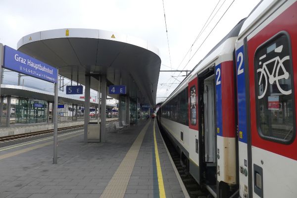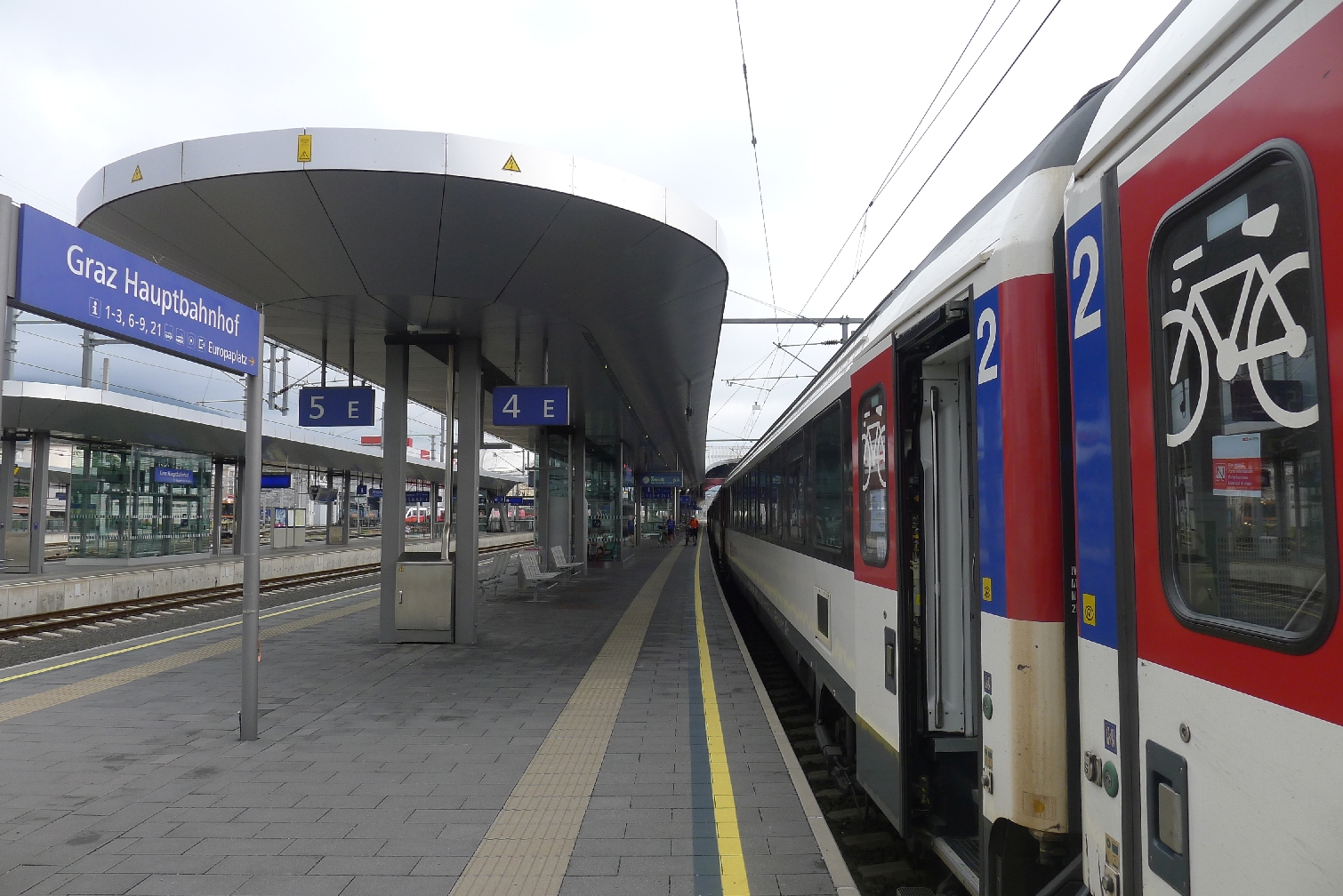 8:22 Uhr: Ankunft in Graz, wir haben 1,5h Zeit für den Umstieg und decken uns nochmal mit Proviant ein.