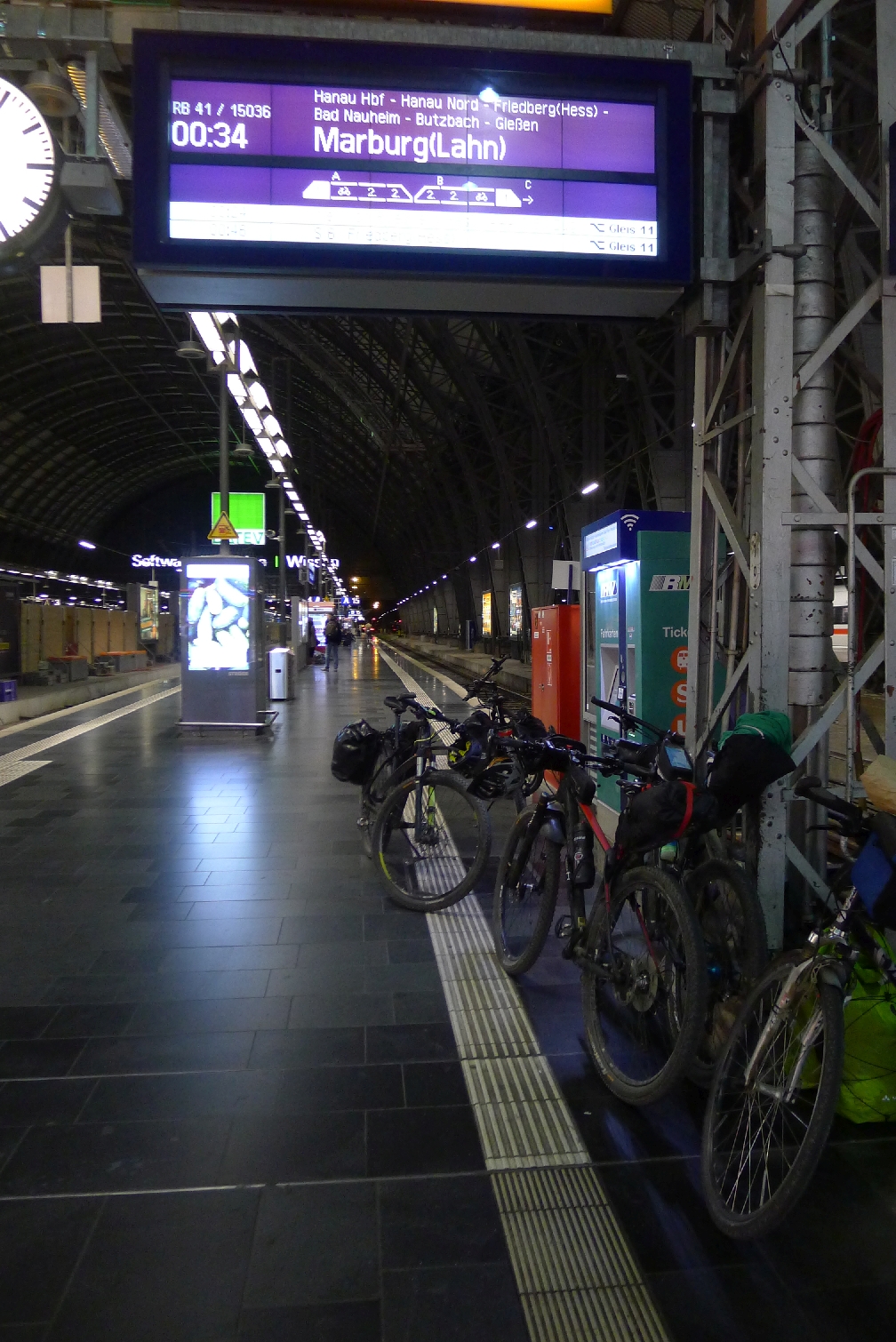 23:07 Uhr: Ankunft in Frankfurt, Lars stürmt aus dem Zug und zum anderen Gleis, sieht von unserem Anschlusszug aber nur noch die Rücklichter… Nun heißt es lange warten, letzte Möglichkeit ist der Lumpensammler um 0:34 Uhr, der aber über Hanau fährt und fast jedem Bahnhof hält.