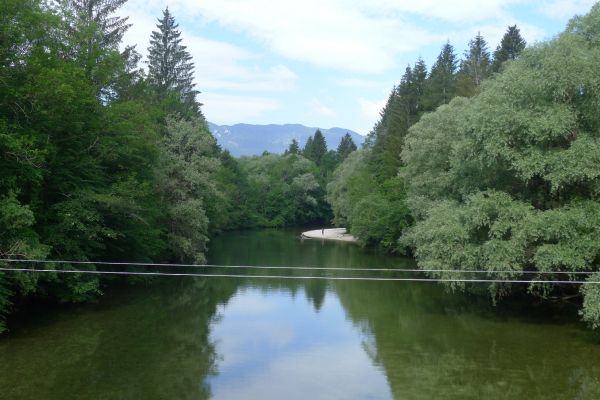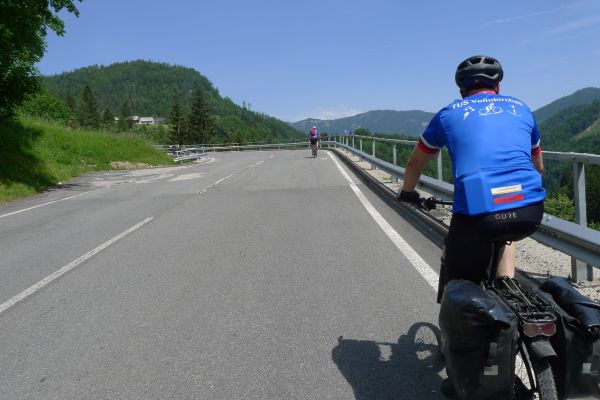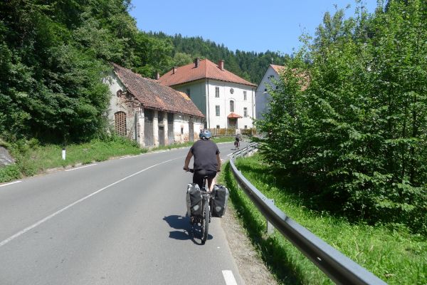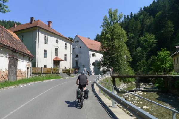 16:35 Uhr: nach einem Espresso satteln wir wieder auf und nehmen die letzten 26 Kilometer in Angriff. Wir setzen die Fahrt auf der breiten Landstraße entlang des Flusses Mieß fort, die wir von Črna na Koroškem gekommen sind. Die Strasse hat ein leichtes Gefälle und so halten wir das Tempo hoch. Selten fällt die Tachonadel unter 25km/h, meist sind es um die 30km/h. So haben wir auch etwas Kühlung durch den Fahrtwind bei denmittlerweile schwülwarmen Temperaturen.