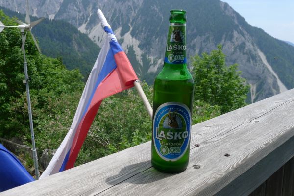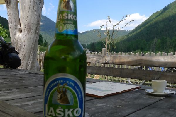 15:55 Uhr: nachdem wir ein paar Serpentinen auf einer Schotterpiste gemeistert haben kommen wir zu einem Bauernhof mit Wirtschaft. Spontan legen wir nochmal eine Pause ein, geniessen ein Laško 0,0% auf der Terrasse und den Blick auf die Bergwelt.