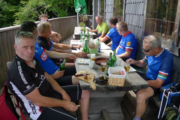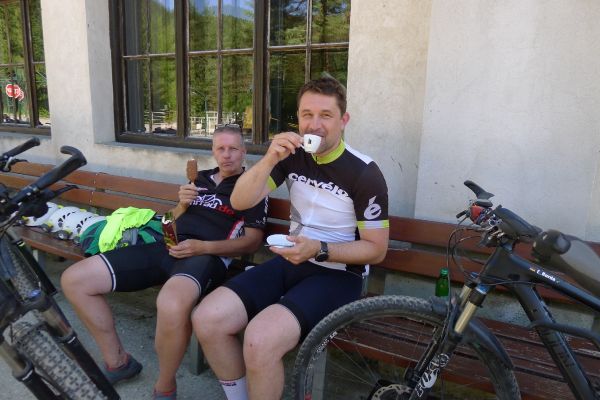 15:07 Uhr: Ankunft an einer Gaststätte. Warmes Essen dauert eine Stunde und da wir noch einiges an Kilo- und Höhenmetern vor uns haben, entschieden wir uns für eine schnelle Variante: Apfelstrudel, Espresso und Laško 0,0%