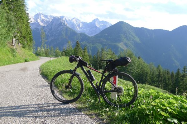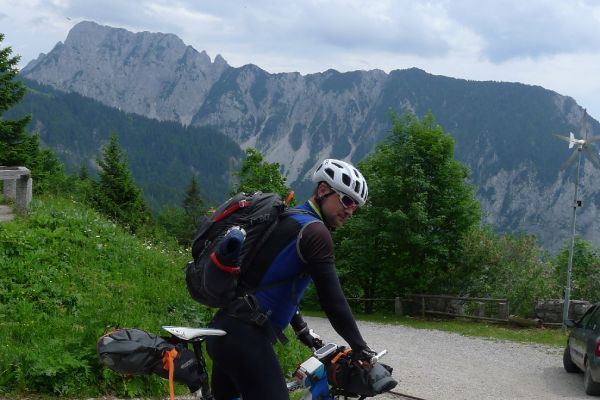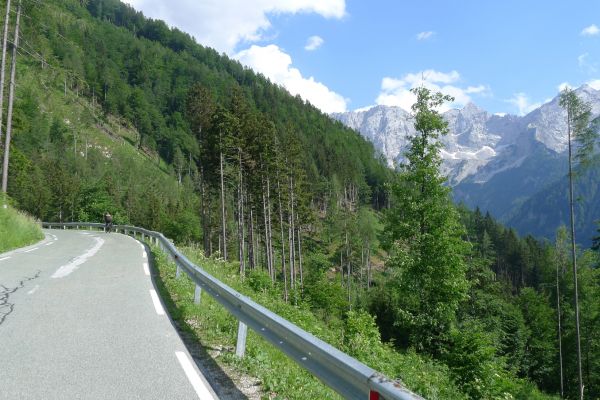 18:20 Uhr: kurze Pause an einer Kehre mit tollem Blick auf die kahlen Gipfel der Steiner Alpen. Die Ausblicke auf die Bergwelt nehmen hierbei so manchen Schmerz und motivieren für den weiteren Aufstieg. Wir fahren entlang der Vellacher Kotschna, einem von drei Seiten von den Steiner Alpen umrahmten Hochtal, das die südlichste Ausbuchtung von Kärnten bildet. Andi ist kaum zu bremsen heute und strampelt sich mit hoher Trittfrequenz wie ein Duracellhäschen nach vorne.
