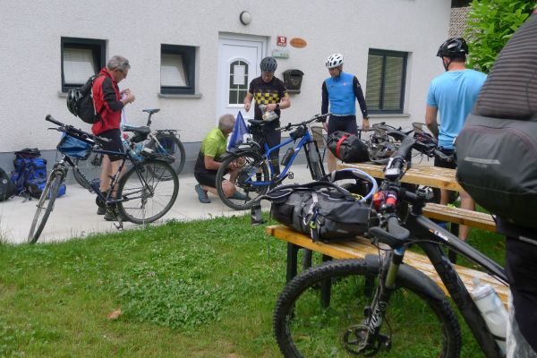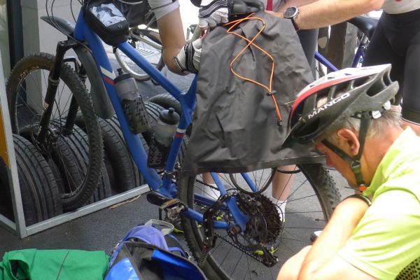 10:00 Uhr: technischer Halt. Armins Gepäckträger muss gerichtet und verstärkt werden.
